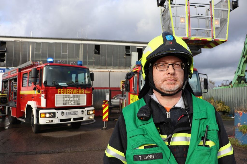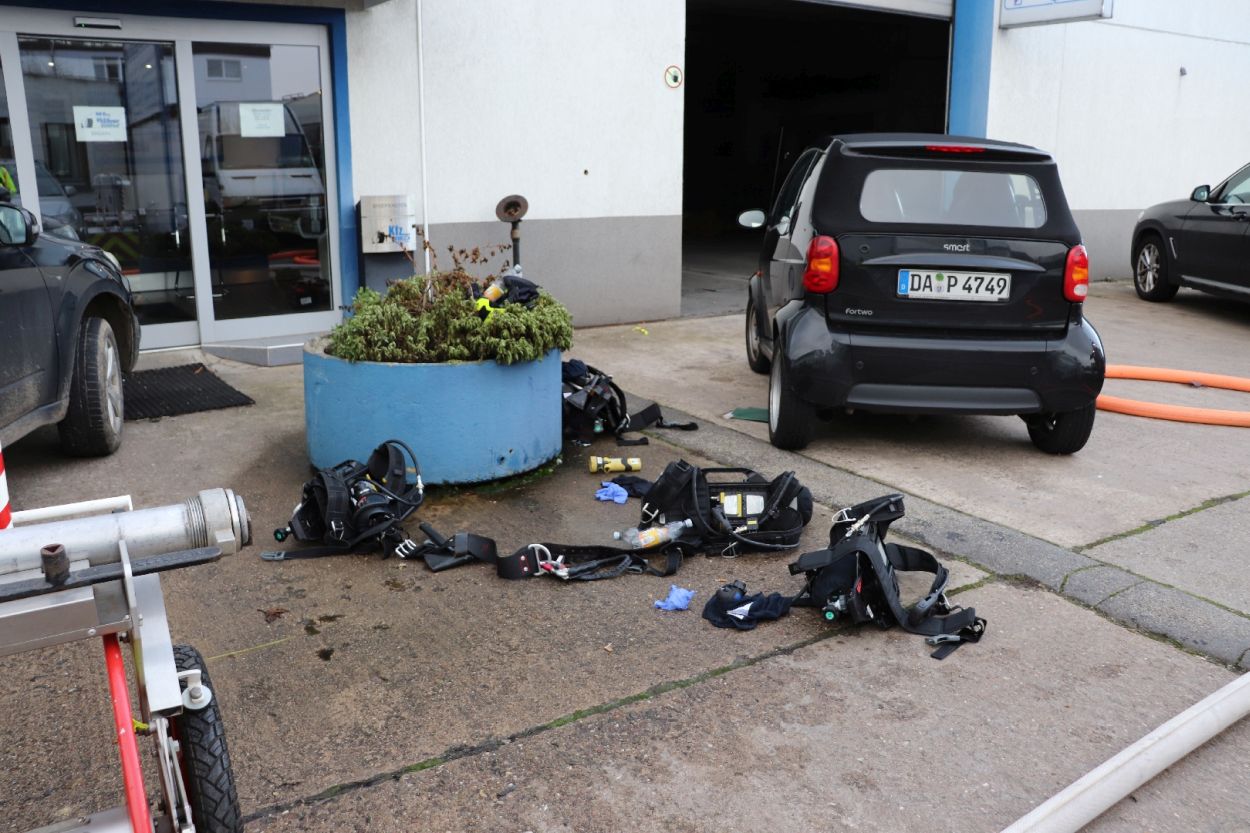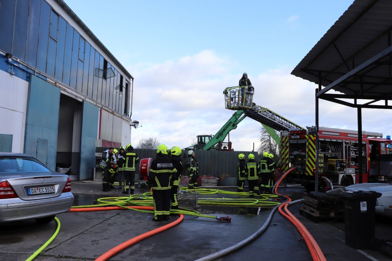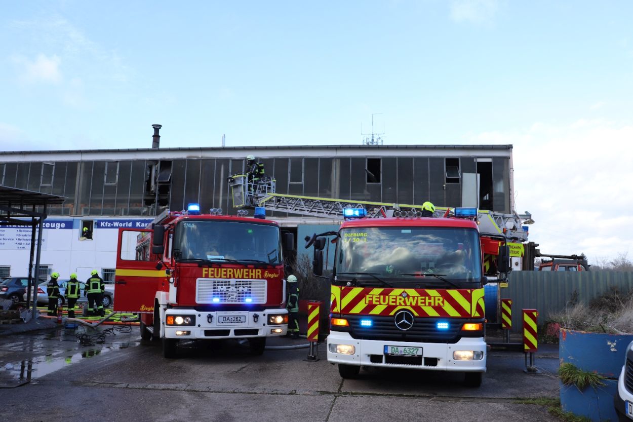 Hier brannte eine Elektroverteilung in einem Bürocontainer, dieses Feuer breitete sich schnell über 2 Stockwerke und gelagerte Waren und Reifen aus, so das die Feuerwehr anfangs keinen Zugang zum Brandgut hatte. Erst mit Spezialkräften und einer Drehleiter konnte der Zugang hergestellt werden. Das Feuer wurde durch 10 Trupps unter schweren Atemschutz gelöscht. Aufgrund der schwierigen Löschwasserversorgung mussten die Schlauchleitungen über einen nahe gelegenen Golfplatz verlegt werden. Teile der Halle sind nun einsturzgefährdet und müssen durch das THW gesichert werden. Die Polizei Südhessen hat die Ermittlungen zur Brandursache aufgenommen.
