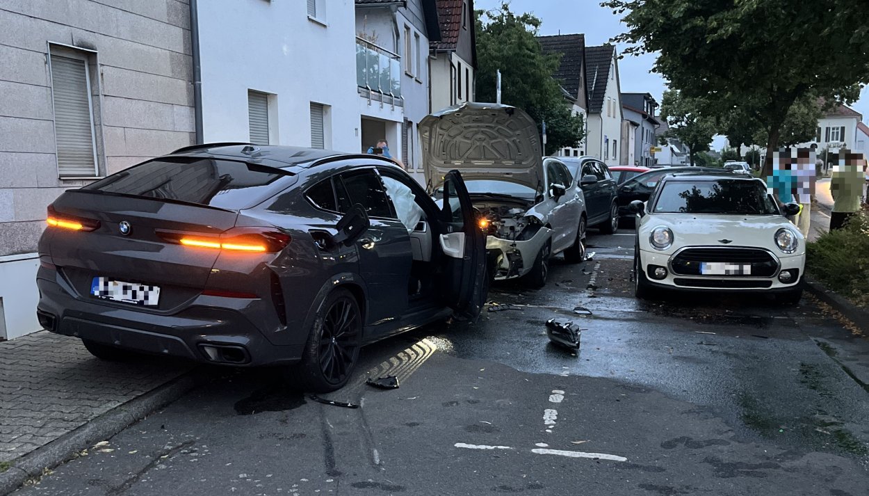 Der junge Mann war mit einem BMW X6 in Richtung Nidderau unterwegs, als er nach links von der Fahrbahn abkam. Der Wagen überfuhr einen Grünstreifen, streifte dabei einen Baum und prallte anschließend mit großer Wucht gegen einen am Straßenrand geparkten Volvo XC60. Die Wucht des Aufpralls schob den Volvo auf einen davorstehenden Audi Q7, der wiederum auf einen VW Golf geschleudert wurde. Dieser krachte schließlich gegen einen Ford Fiesta.