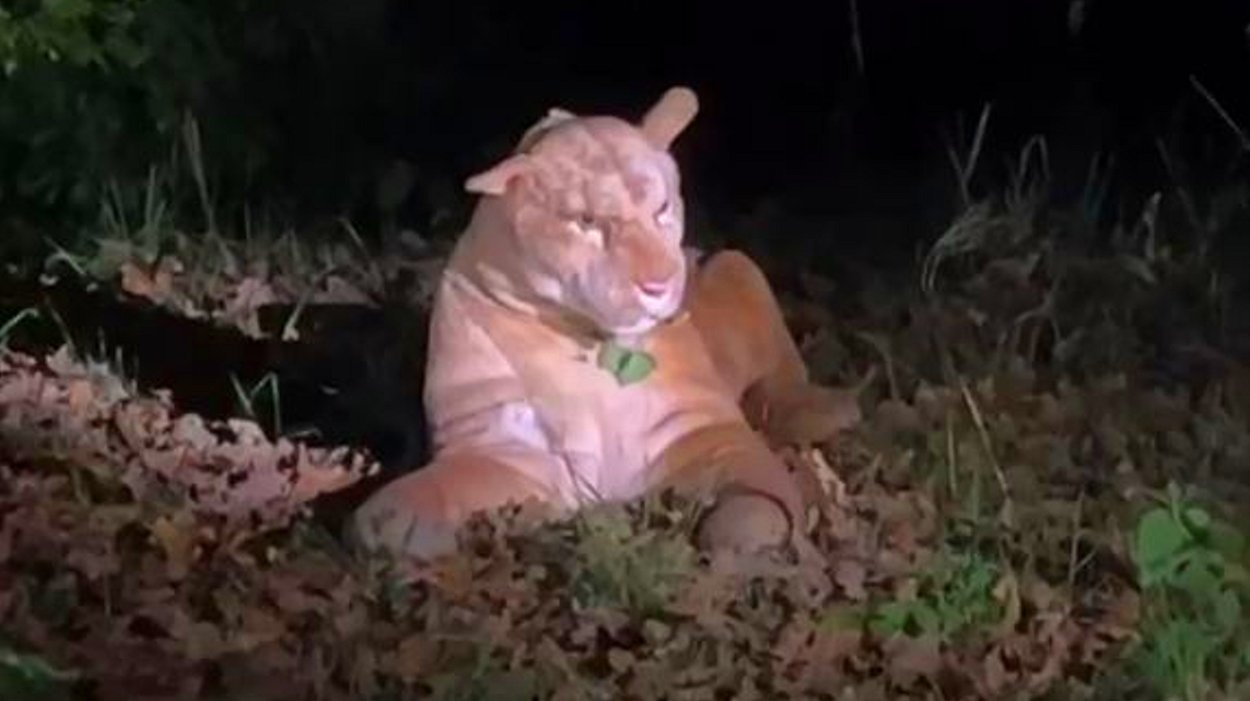 Warum der flauschige Raubkatzen-Imitator seinen nächtlichen Ausflug ins Freie unternahm, bleibt ein Rätsel. Von einem eigenständigen Abenteuer des Stofftiers aus einem nahegelegenen Haushalt ist eher nicht auszugehen.