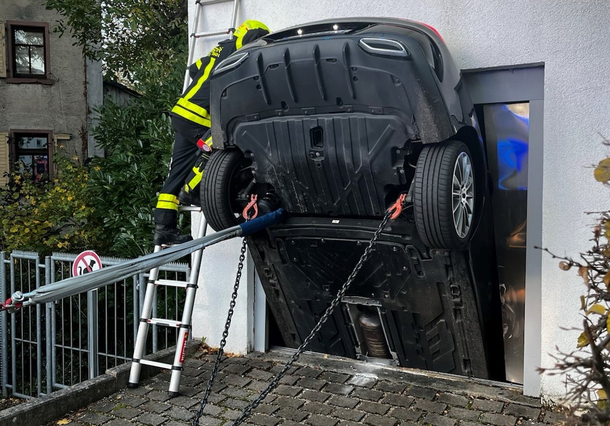 Die alarmierte Feuerwehr konnte die leichtverletzte Fahrerin sowie ihre 9- und 34-jährigen Mitfahrer aus dem Wagen befreien. Glücklicherweise blieben die beiden Mitfahrer unverletzt. Das Fahrzeug wurde anschließend mit einer Winde geborgen. An dem Fahrzeug und dem Aufzug entstand erheblicher Sachschaden. Die Polizei stellte den Mercedes sicher, um weitere technische Untersuchungen durchzuführen. Die Ermittlungen zur Unfallursache laufen.