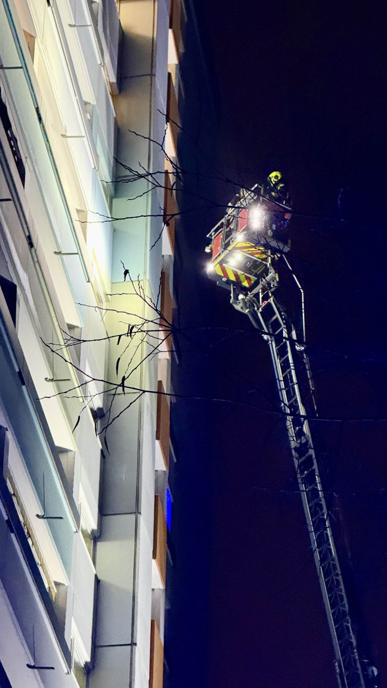 Beim Eintreffen der Feuerwehr brannte die Wohnungseingangstür inklusive Adventskranz und Fußmatte, der Flur war stark verraucht. Rauch zog in mehrere Wohnungen und die beiden darüberliegenden Stockwerke. Mehrere Bewohner hatten sich auf Balkone geflüchtet und wurden mit Fluchthauben ins Freie gebracht.