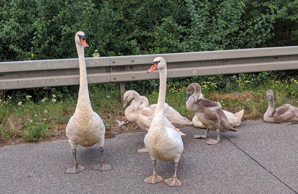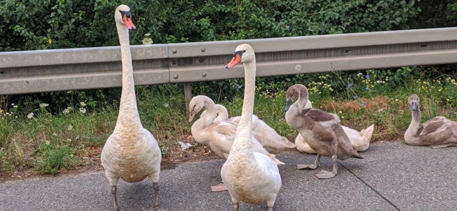 Bensheim – Eine auf Wanderschaft befindliche siebenköpfige Schwanenfamilie legte am Dienstagmorgen gegen 6.30 Uhr, auf der A 5, zwischen den Anschlussstellen Heppenheim und Bensheim, den Verkehr für fast zwei Stunden nahezu lahm. Zum Teil konnten die Verkehrsteilnehmer aber auch von der Polizei an der Gefahrenstelle vorbeigeleitet werden. Das Elternpaar mit seinen fünf Kleinen hatte sich auf die Autobahn verirrt.
