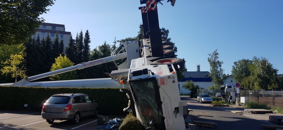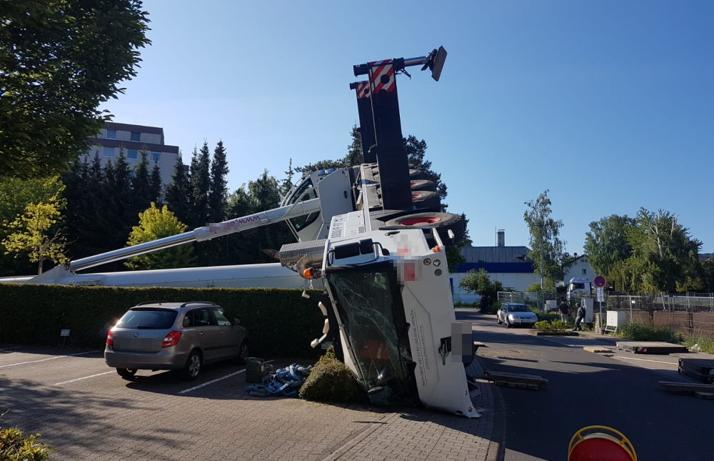 Taunusstein – Am Mittwochmorgen gegen 08:10 Uhr ist in der Grillparzerstraße in Taunusstein-Hahn aus bisher unbekannter Ursache ein Baukran beim Ausrichten des Kranarmes zur Seite umgekippt. Das 160 Tonnen schwere Gerät blieb neben der Straße auf dem Gehweg liegen, der Kranarm schlug auf einem angrenzenden Parkplatz ein. Der 60-jährige Kranführer, der zum Zeitpunkt des Unfalles in der Kranführerkabine saß, wurde bei dem Unfall leicht verletzt.
