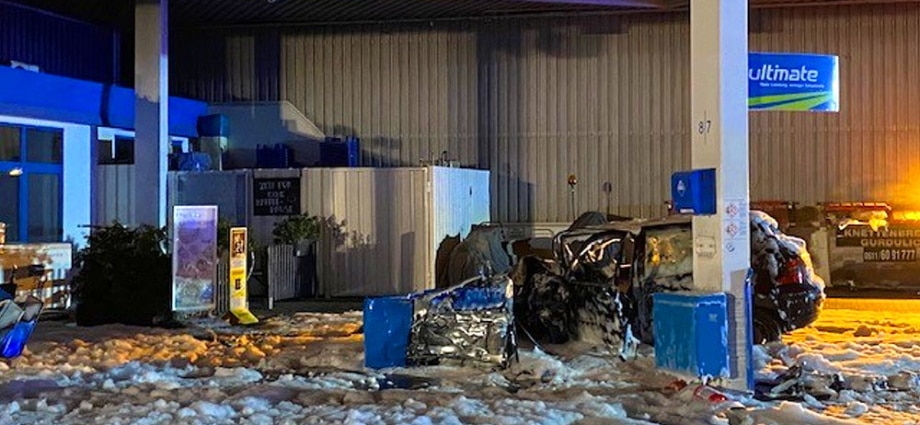 Das Fahrzeug fing sofort Feuer. Der Angestellte der Tankstelle drückte geistesgegenwärtig den sogenannten „Not-Aus-Schalter“ und verhinderte damit, dass Benzin austreten konnte. Polizeibeamte der Frankfurter und der Wiesbadener Polizei retteten den eingeklemmten Fahrer aus dem brennenden Fahrzeug und brachten ihn in Sicherheit. Wenig später traf die Berufsfeuerwehr Wiesbaden ein. Vor Ort wurde ein ausgedehnter Fahrzeugbrand festgestellt, welcher bereits auch auf den Verkaufsraum der Tankstelle übergegriffen hatte. Der verunfallte PKW hatte eine komplette Zapfsäule durch den Aufprall abgerissen und deren Teile in den Eingangsbereich des Tankstellengebäudes geschleudert. Die Feuerwehr konnte den Brand schnell unter Kontrolle bringen. Der verunfallte Fahrer wurde schwer- aber nicht lebensgefährlich verletzt in ein Wiesbadener Krankenhaus eingeliefert. Aufgrund der augenscheinlichen Alkoholisierung wurde dort eine Blutentnahme durchgeführt. Bei der Rettung wurden vier Polizeibeamte durch Rauchgasintoxikation leicht verletzt und mussten ambulant behandelt werden. Der Tankstellenmitarbeiter erlitt ebenfalls eine leichte Rauchvergiftung.