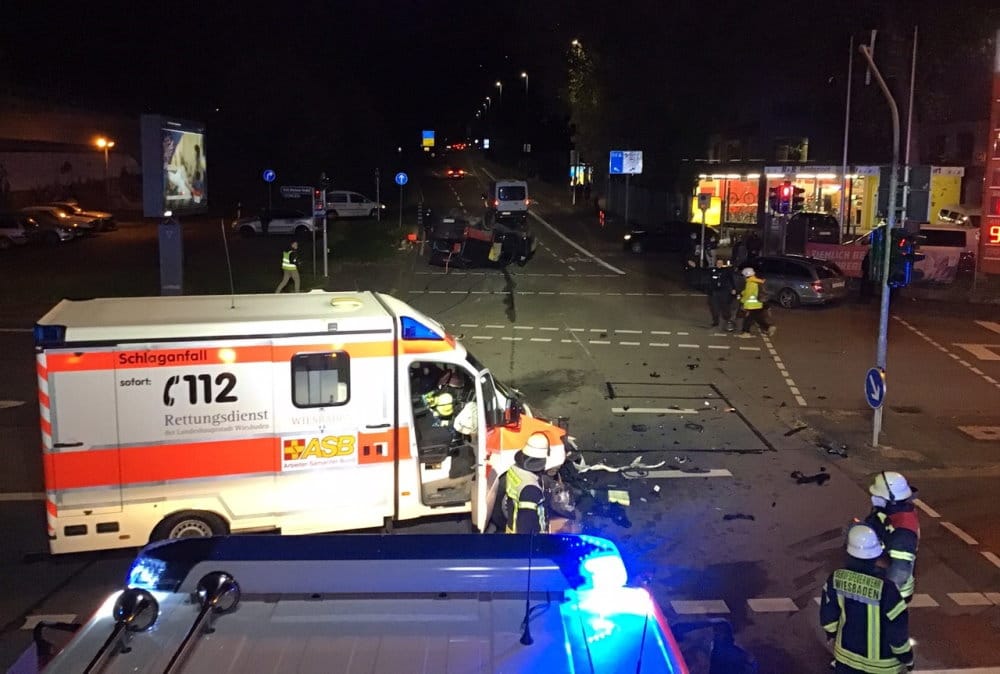 Dessen PKW überschlug sich infolge der Kollision und kam auf dem Dach zum Liegen Der PKW- Fahrer wurde bei dem Zusammenstoß schwer, jedoch glücklicherweise nicht lebensgefährlich verletzt und wurde in ein Wiesbadener Krankenhaus eingeliefert. Die dreiköpfige Besatzung des Rettungswagen wurde ebenfalls verletzt und bedurfte medizinischer Behandlung im Krankenhaus. Der Patient im Rettungswagen wurde durch den Unfall nicht zusätzlich verletzt. Nach bisherigen Ermittlungen hatte die Ampel für den Rettungswagen „Rot“ gezeigt. Aufgrund der dringenden Verbringung des Patienten hatte der Rettungswagen Sondersignale geschaltet und befand sich auf Alarmfahrt. Offenbar hatte der PKW- Fahrer den Krankenwagen übersehen, als er bei „Grün“ in die Kreuzung einfuhr. Zur Ermittlung des konkreten Unfallhergangs und der Unfallursache wurde auf Anordnung der Staatsanwaltschaft ein Gutachter eingesetzt. Die beteiligten Fahrzeuge waren nicht mehr fahrbereit und mussten abgeschleppt werden. Während der Unfallaufnahme musste die Unfallstelle voll gesperrt werden, wodurch es zu Verkehrsbehinderungen kam.