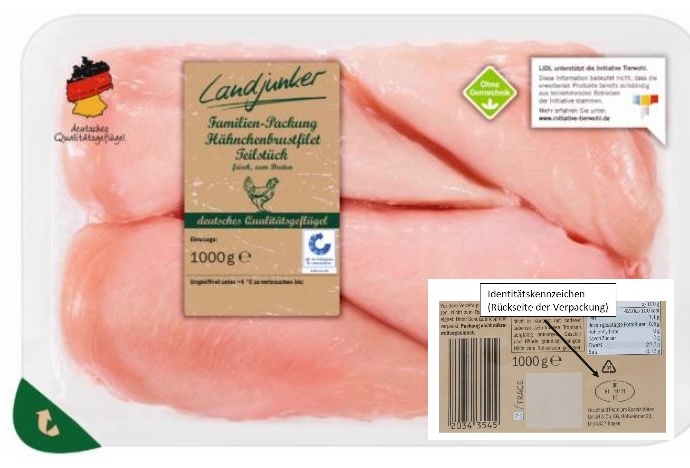 Lidl ruft das Produkt „Landjunker Familien-Packung Hähnchenbrustfilet Teilstück 1.000g“ mit der DE NI 11101 EG Nummer die auf der Rückseite vom Produkt zu finden ist. Das MHD ist der 04.12.2017. Grund der Warnung: Metallfremdkörper auf der Oberfläche des Produkts. Die Warnung betrifft: Hessen, Niedersachsen, Nordrhein-Westfalen, Rheinland-Pfalz