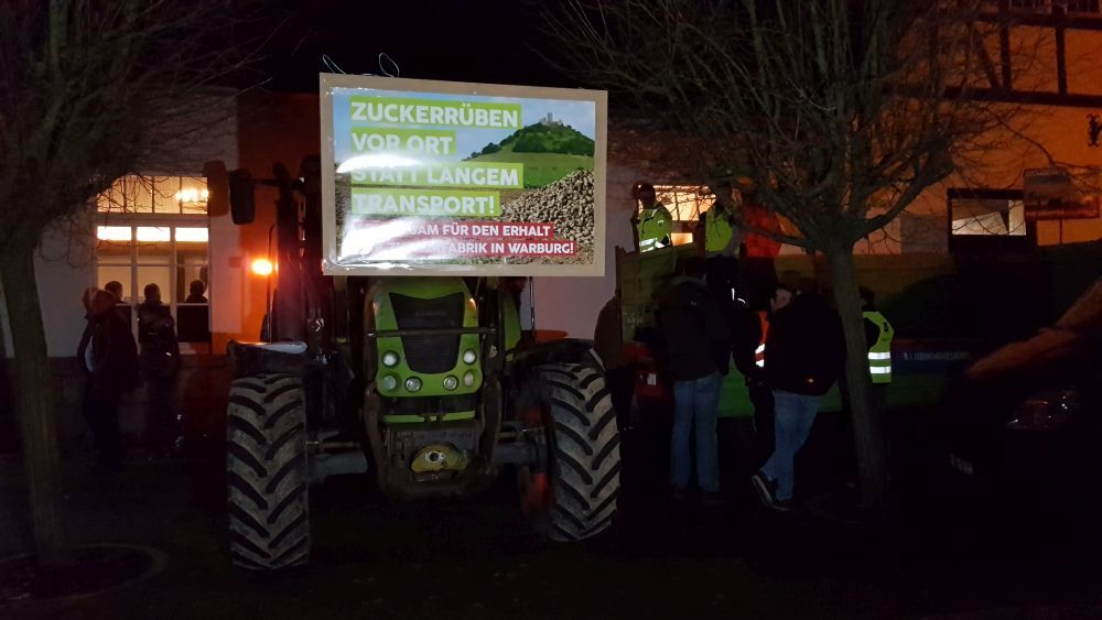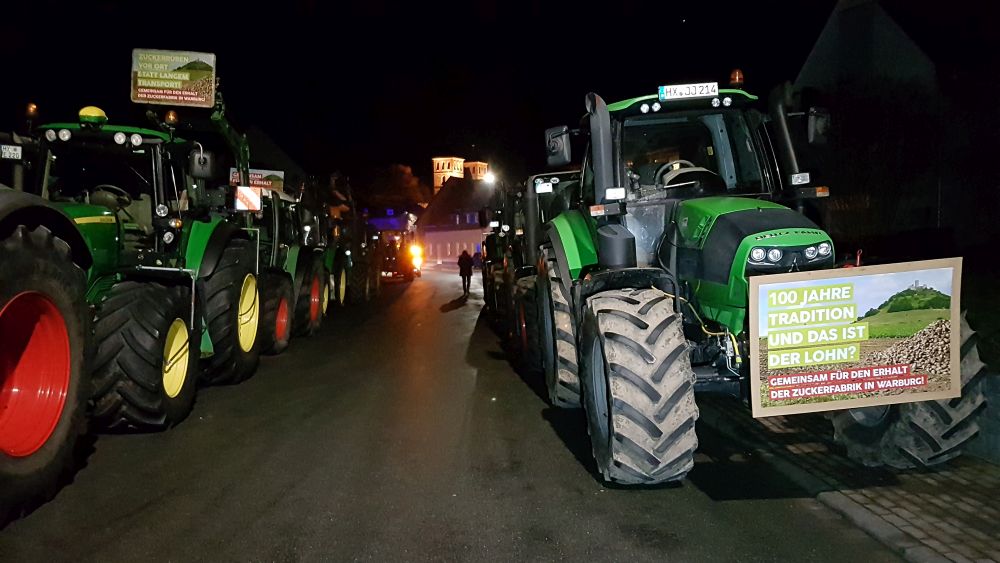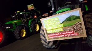 die Kosten des Unternehmens gesenkt werden. 60 Mitarbeiter die im Werk derzeit tätig sind, würden nach der Schließung auf der Strasse stehen, oder müssten in einer anderen Region sesshaft werden. Nachdem die Pläne des Unternehmens bekannt wurden, waren sich alle einig, wir werden kämpfen, dass der Standort Warburg nicht geschlossen wird. Mit über 100 Traktoren zeigten die Bauern ihren Unmut und protestierten friedlich in der Gemeinde „Hohenwepel“ bei Warburg. Viele hundert Menschen kamen zu der Protestaktion um die Landwirte und Arbeiter zu unterstützen. Bürgermeister Michael Stickeln ist sich sicher, dass es ein Fehler wäre das Werk zu schließen, weil der Standort mitten in Deutschland ist und weil seit Jahren aus der Region sehr gute Rüben geliefert wurden. Einen endgültigen Beschluss will der Aufsichtsrat der Südzucker AG jedoch erst am 25. Februar treffen, erst dann steht fest was die Zukunft bringen wird.
