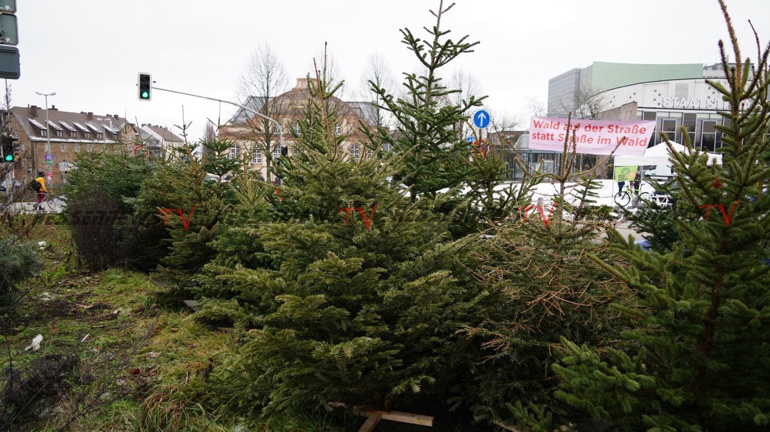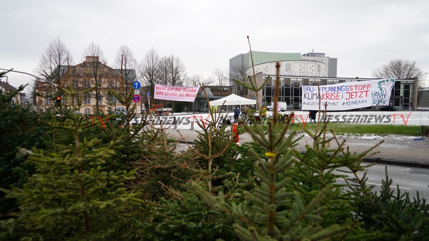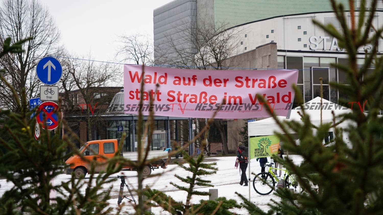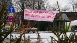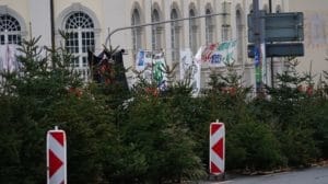 Kassel – Viele engagierte Initiativen machten am Montagmorgen im Rahmen einer Protestaktion auf die anhaltende Umweltzerstörung durch den Straßenbau aufmerksam. Nach dem Motto „Wenn ihr Straßen durch den Wald baut, bauen wir einen Wald auf die Straße“ wurden 200 Tannenbaume auf der Fahrbahn in Höhe des Staatstheaters aufgestellt. Nach Angaben der Verantwortlichen wurden die Bäume in der Stadt eingesammelt und entweder zu Fuß oder mit dem Fahrrad transportiert. Die Bäume sollen nun für sich sprechen zu größeren Staus kam es nicht, denn die Fahrzeuge konnten um die Bäume drum herumfahren. Die Stadtreiniger haben sich bereit erklärt, die Bäume nach der Aktion fachgerecht zu entsorgen.