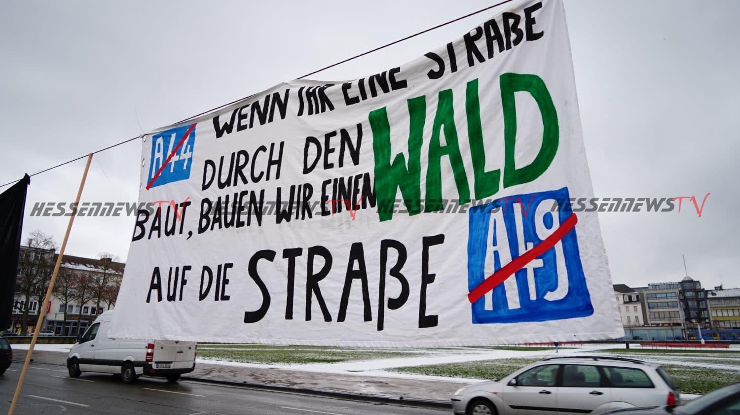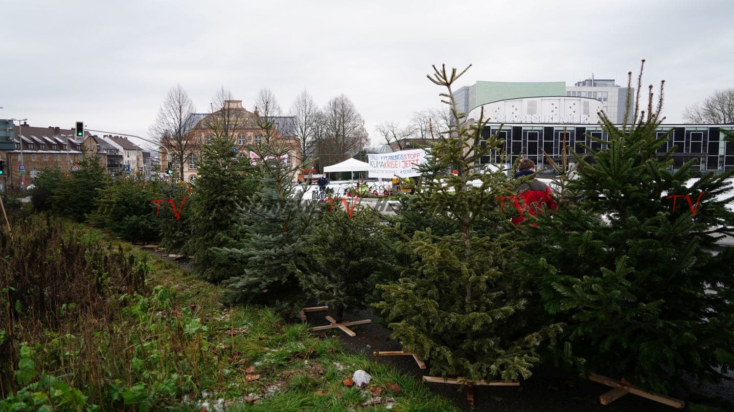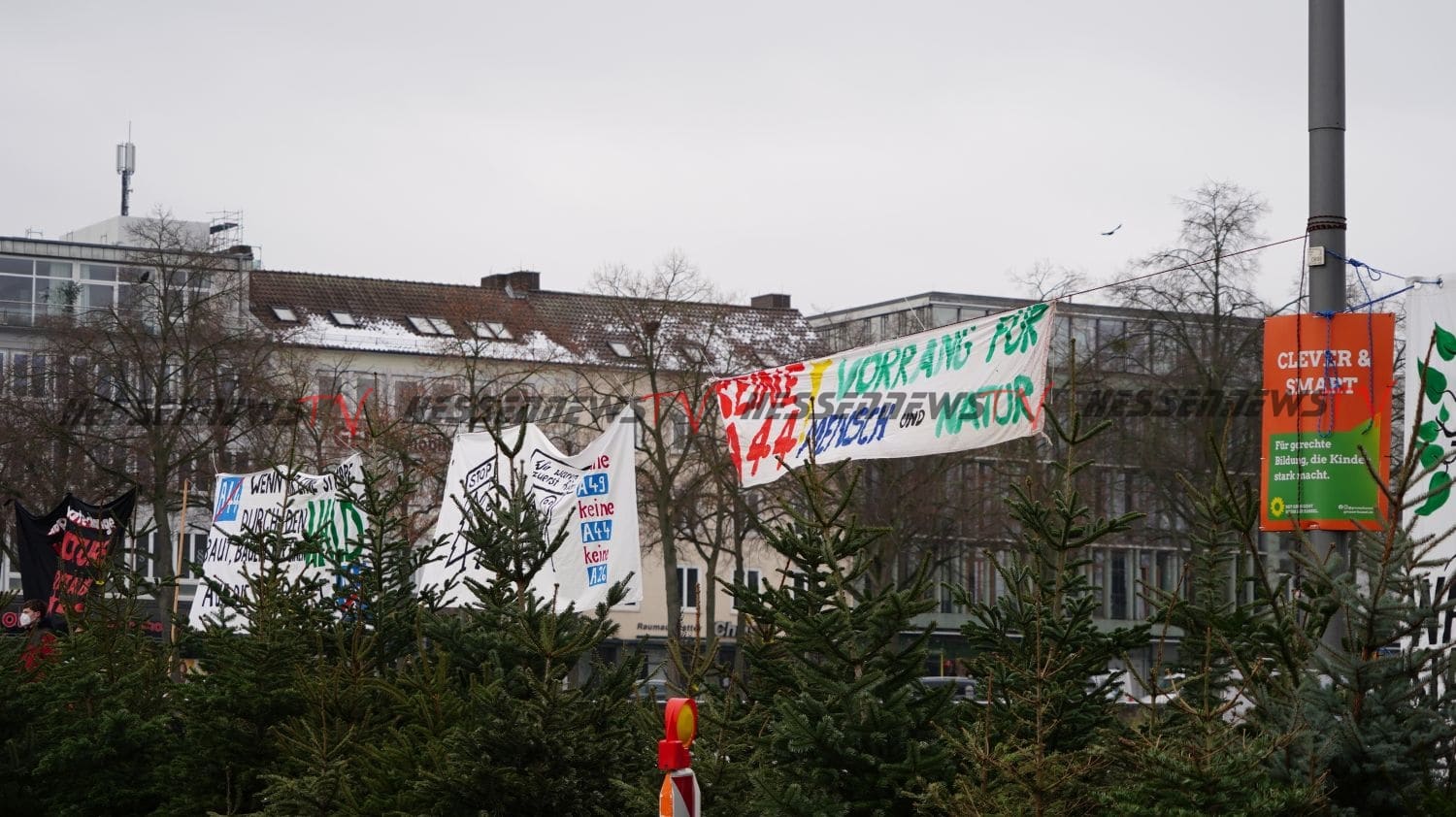 Kassel – Viele engagierte Initiativen machten am Montagmorgen im Rahmen einer Protestaktion auf die anhaltende Umweltzerstörung durch den Straßenbau aufmerksam. Nach dem Motto „Wenn ihr Straßen durch den Wald baut, bauen wir einen Wald auf die Straße“ wurden 200 Tannenbaume auf der Fahrbahn in Höhe des Staatstheaters aufgestellt. Nach Angaben der Verantwortlichen wurden die Bäume in der Stadt eingesammelt und entweder zu Fuß oder mit dem Fahrrad transportiert. Die Bäume sollen nun für sich sprechen zu größeren Staus kam es nicht, denn die Fahrzeuge konnten um die Bäume drum herumfahren. Die Stadtreiniger haben sich bereit erklärt, die Bäume nach der Aktion fachgerecht zu entsorgen.
