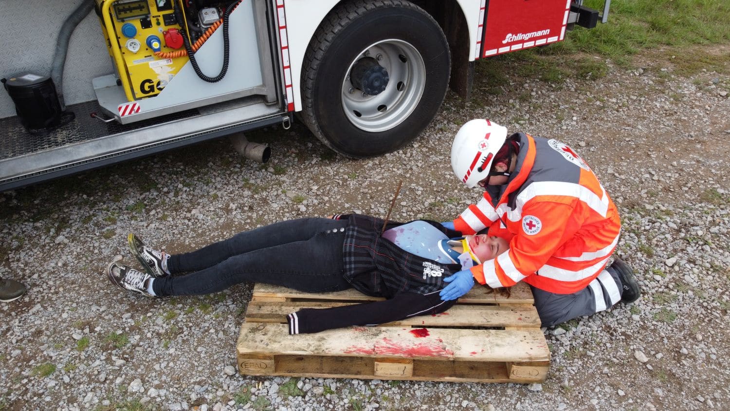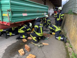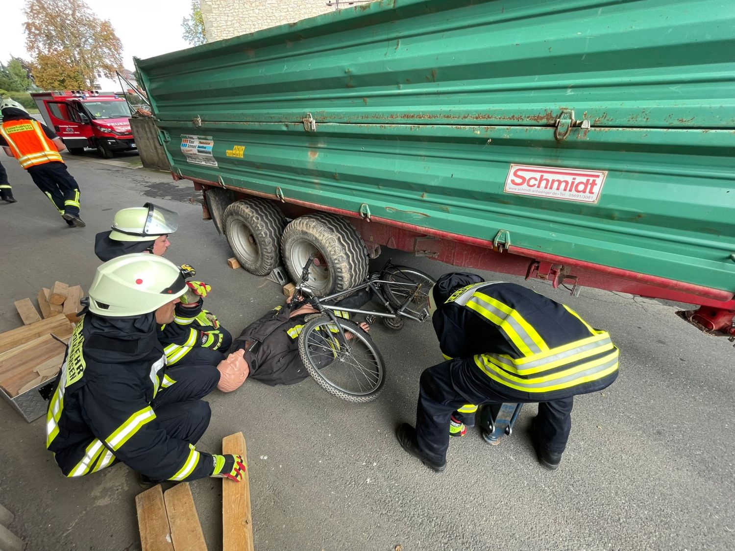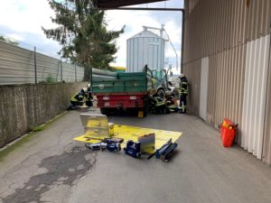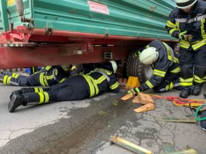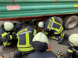 – Abbiegeunfall mit einer eingeklemmten Person unter einem Anhänger