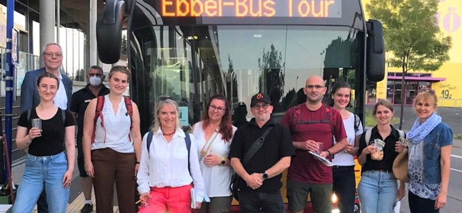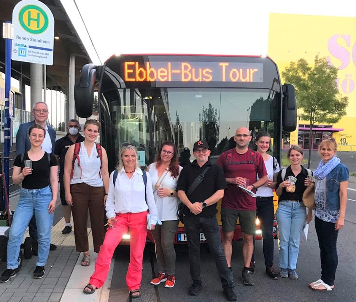 Hanau – „Trinken für den Naturschutz“ – mit diesem Motto startete die erste „Ebbel-Bus-Tour“ im Rahmen eines Treffens des Nachhaltigen Netzwerks – Hanau und Region. Die Tour kam durch eine Kooperation von gleich drei Netzwerkpartnern zustande: Hanauer Straßenbahn (HSB), Kelterei Stier und MainGenussLaden sowie Umweltzentrum Hanau. „Wir freuen uns seit Kurzem Teil des Nachhaltigen Netzwerks zu sein und den ‚Ebbel-Bus‘ als neue Marke bereitzustellen. Fahren mit dem Bus ist grundsätzlich nachhaltig, insofern ist es folgerichtig, dass wir uns dem Netzwerk angeschlossen haben,“ begrüßte HSB-Geschäftsführer Thomas Schulte die Teilnehmenden. Die Leiterin des Umweltzentrums, Gabriele Schaar-von Römer, sagte: „Die Ebbel-Bus-Tour soll langfristig Teil des Nachhaltigen Tourismus in Hanau werden, der gerade im Rahmen eines gemeinsamen Projekts mit dem Spessart-Tourismus in einem Forschungsprojekt des Bundesministeriums für Bildung und Forschung zu Tagestourismus und Naherholung entwickelt wird.“ Von der Bushaltestelle „Rondo“ in Steinheim führte die Tour zu Fuß weiter am Naturschutzgebiet „Amerikafeld“ vorbei, durch den Wald zum Steinheimer „Galgen“ und weiter zur Streuobstwiese an der Grenze zu Lämmerspiel. Schaar-von Römer referierte dabei vor allem über den Kreislauf, in dem sich Menschen und Tiere mit der Natur befinden, über die Artenvielfalt und Pflege einer Streuobstwiese sowie über die Geschichte Steinheims. Anschließend traf die Gruppe Jörg Stier. ER sprach über sein Liebstes, den „Ebbelwoi“ und seine Geschichte. Schnell wurde klar, wie verwoben der Apfelwein mit der Region ist und welche Tradition dahintersteckt. So wurde Apfelwein beispielsweise auch zur Heilung von Krankheiten verwendet und ist bekannt für seine recht „aufmunternde Wirkung bei schlechter Laune“, wie Stier schmunzelnd meinte. Ein guter Apfelwein habe seinen Preis, so der Kelterer weiter. Das merkten die Netzwerkpartnerinnen und -partner bei der Verkostung: Jeder der drei Apfelweine hatte seinen eigenen Charakter. Kurzer Hand wurde das nächste Netzwerktreffen im „Geripptes Museum – Raum für Apfelweinkultur“ geplant, welches bald am Hanauer Heumarkt eröffnet wird, um von Stier noch mehr Geschichten über den „Ebbelwoi“ zu hören.