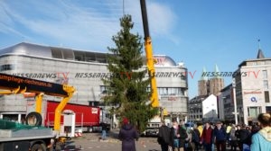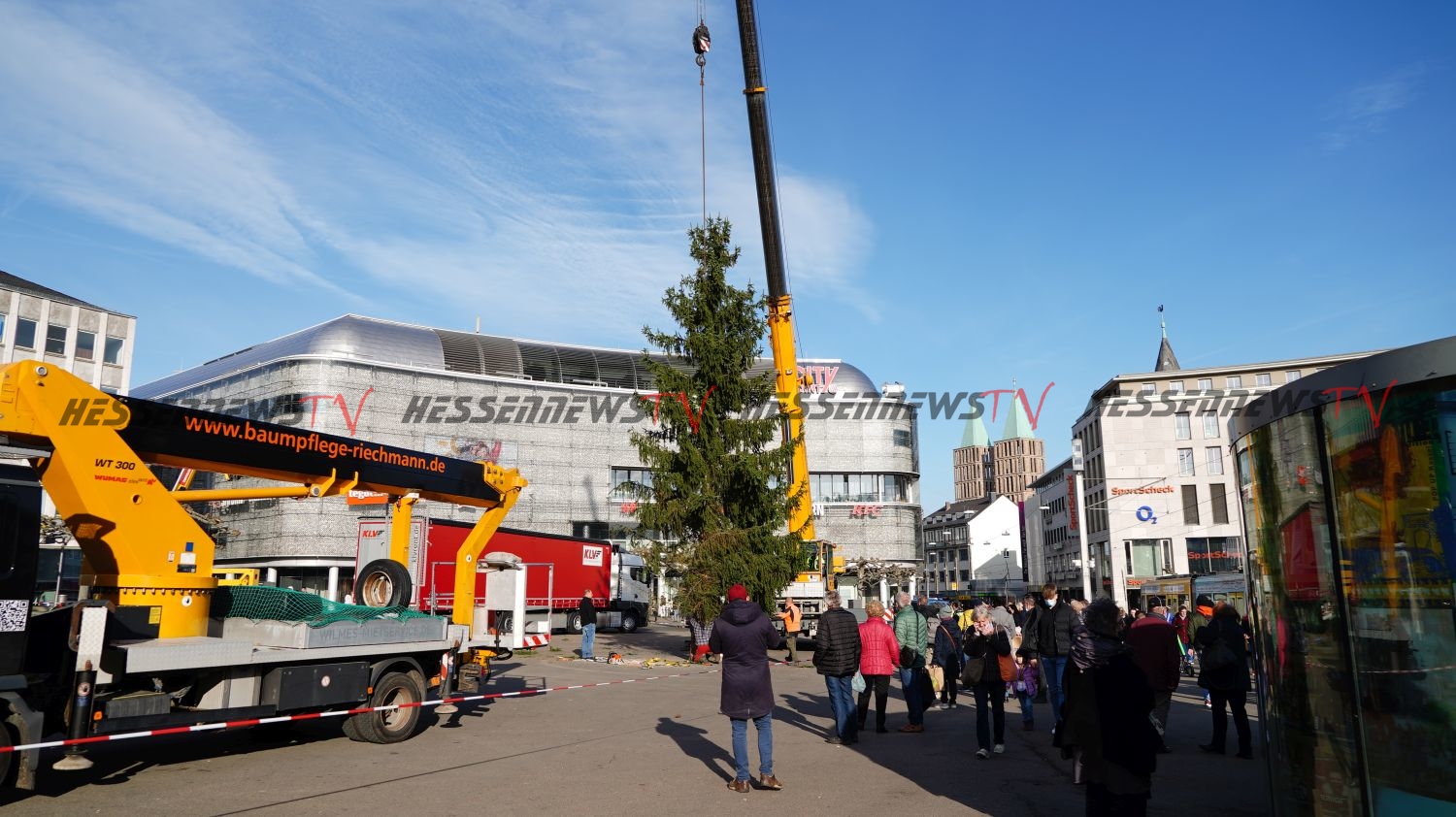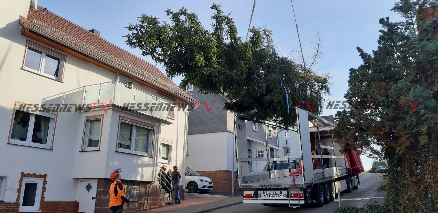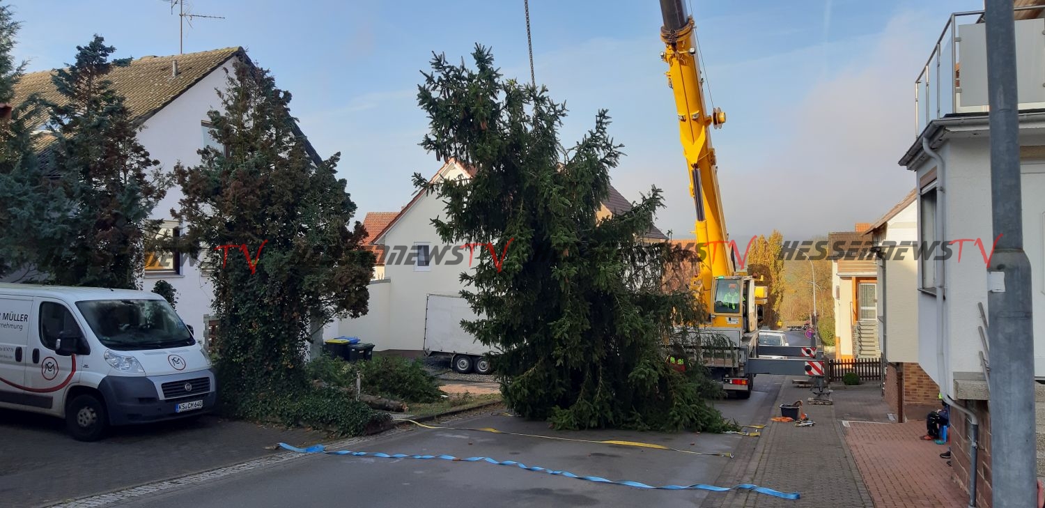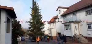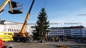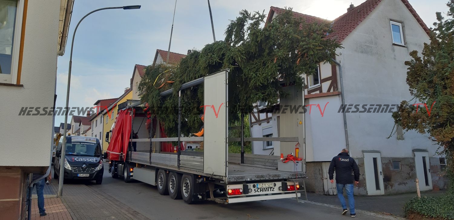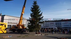 Kassel/Niedenstein – Ab dem kommenden Wochenende hat der Kasseler Königsplatz seinen Weihnachtsbaum wieder. Los ging es bereits am Samstagmorgen gegen 9 Uhr in Niedenstein-Kirchberg. Eine rund 14 Meter hohe Fichte aus einem Vorgarten in Niederstein, wurde der Auserwählte für den Kasseler Märchenweihnachtsmarkt. Die Familie hatte ihn gespendet, weil er zu groß geworden ist und bei stürmischen Tagen drohte auf das Haus zu kippen. Kurz nachdem er mit einem Kran gesichert wurde war der Baum auch schon ab. Verladen auf einem LKW kam er dann gegen 13 Uhr auf dem Königsplatz in Kassel an. Unter den Augen zahlreicher Zuschauer wurde der Baum aufgestellt. Jetzt wird er geschmückt und vorbereitet, damit am 22.11.2021 wie gewohnt auf dem Märchenweihnachtsmarkt in seiner vollen Pracht erstrahlen kann.