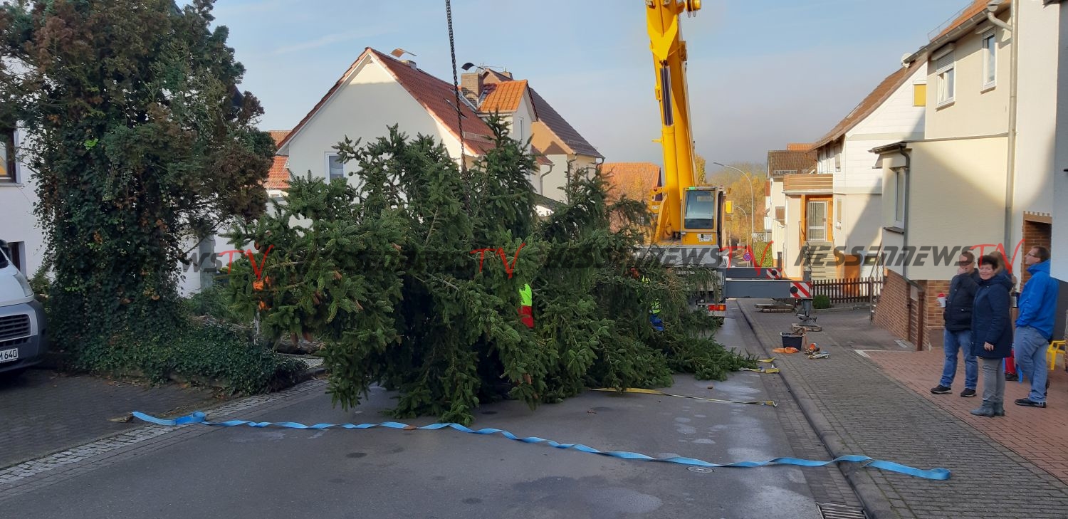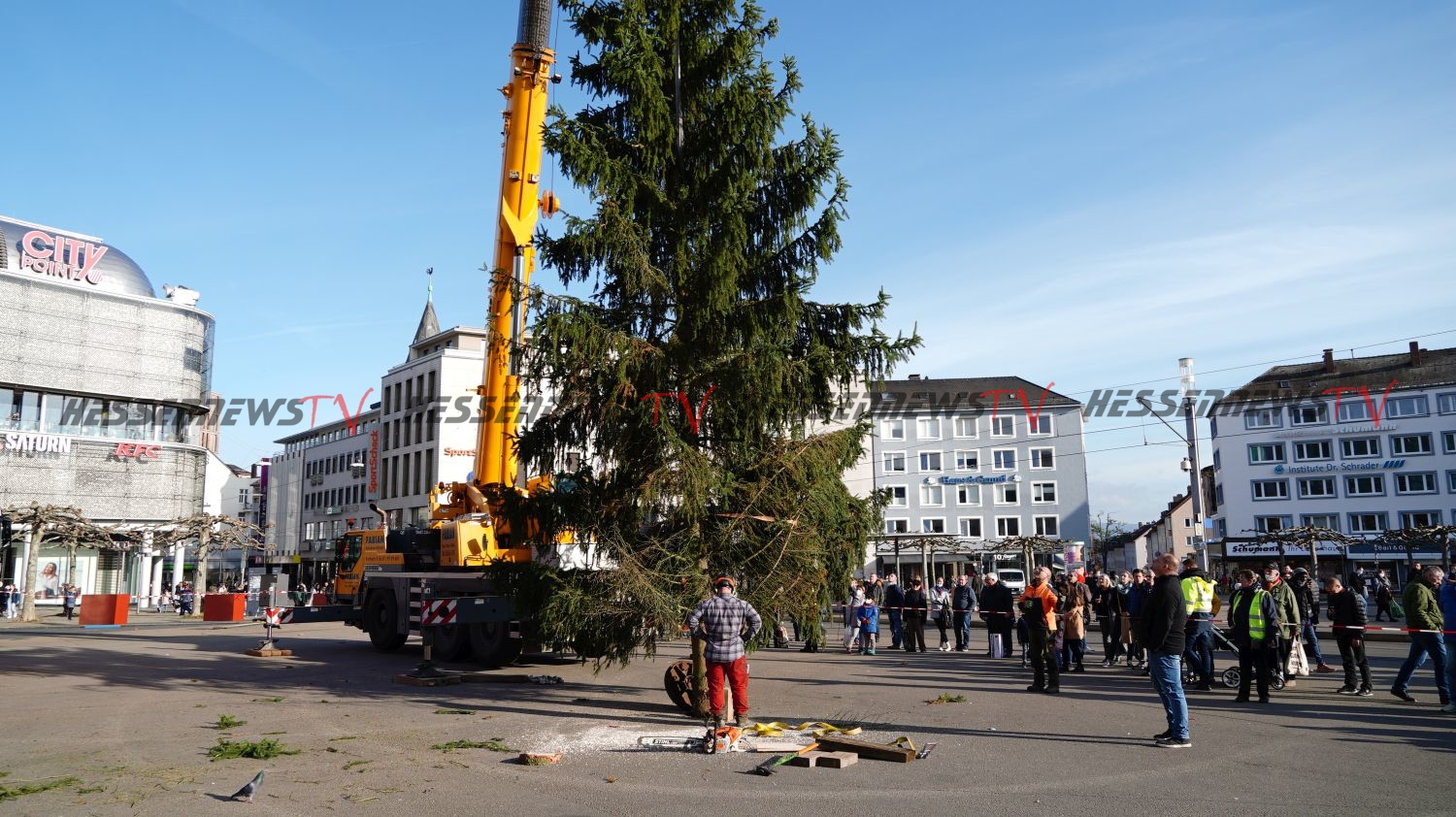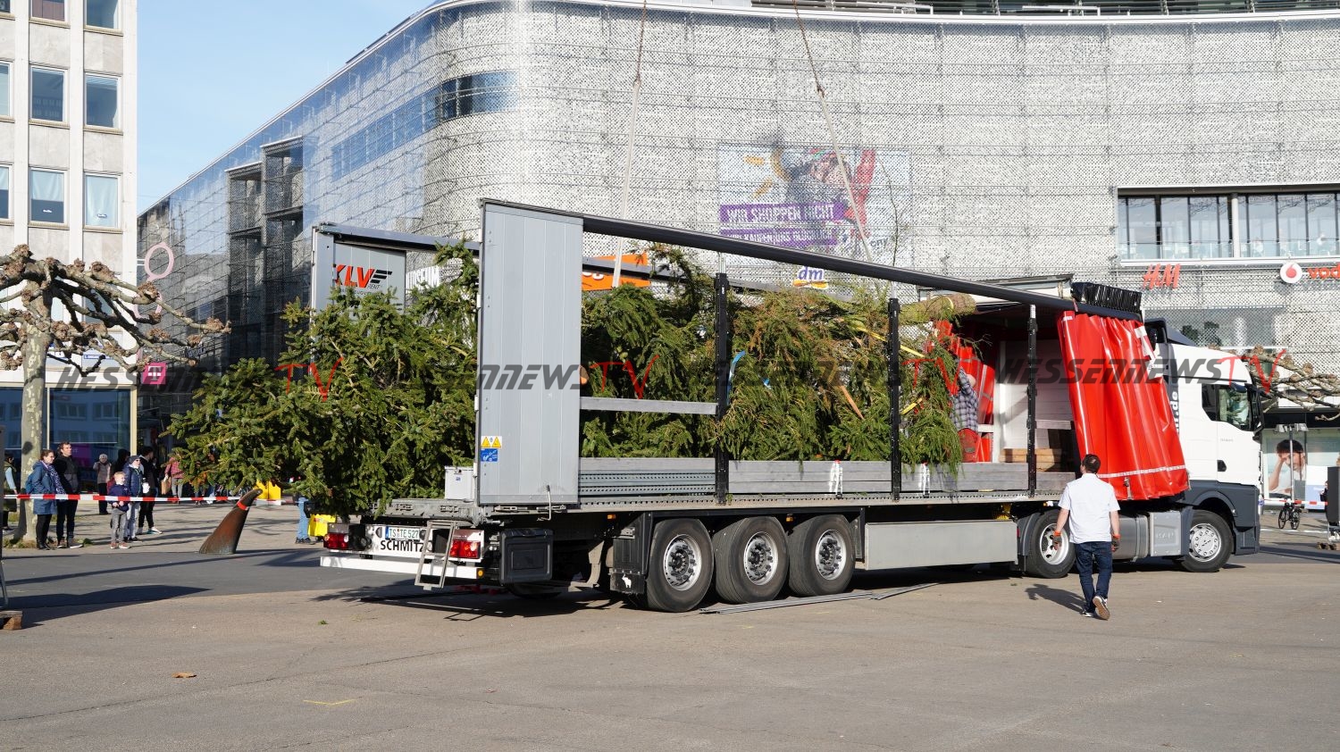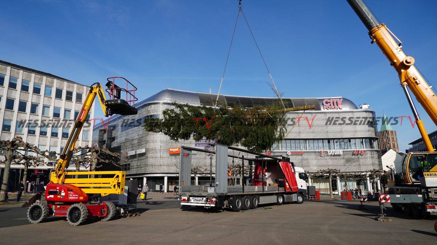 Kassel/Niedenstein – Ab dem kommenden Wochenende hat der Kasseler Königsplatz seinen Weihnachtsbaum wieder. Los ging es bereits am Samstagmorgen gegen 9 Uhr in Niedenstein-Kirchberg. Eine rund 14 Meter hohe Fichte aus einem Vorgarten in Niederstein, wurde der Auserwählte für den Kasseler Märchenweihnachtsmarkt. Die Familie hatte ihn gespendet, weil er zu groß geworden ist und bei stürmischen Tagen drohte auf das Haus zu kippen. Kurz nachdem er mit einem Kran gesichert wurde war der Baum auch schon ab. Verladen auf einem LKW kam er dann gegen 13 Uhr auf dem Königsplatz in Kassel an. Unter den Augen zahlreicher Zuschauer wurde der Baum aufgestellt. Jetzt wird er geschmückt und vorbereitet, damit am 22.11.2021 wie gewohnt auf dem Märchenweihnachtsmarkt in seiner vollen Pracht erstrahlen kann.