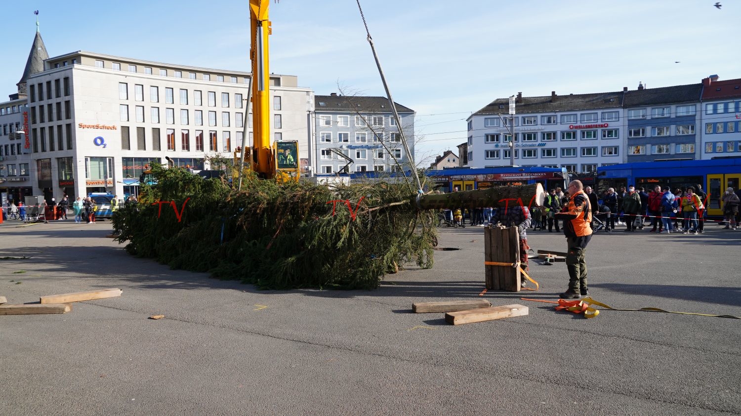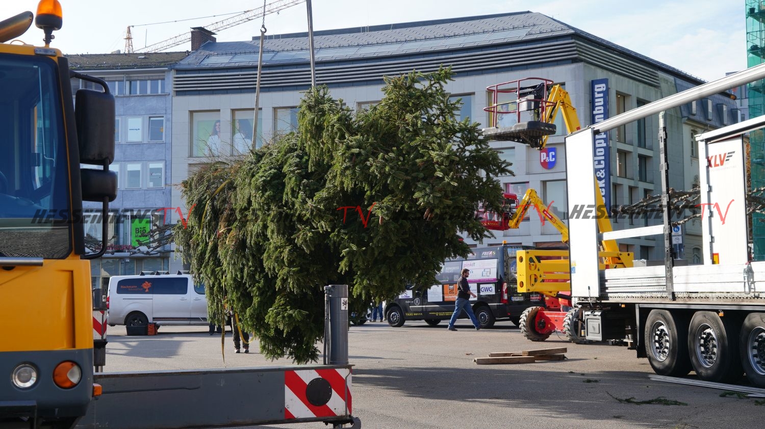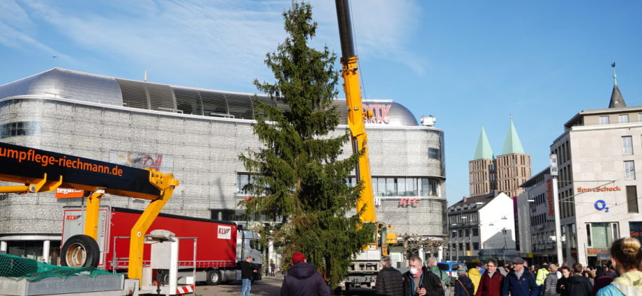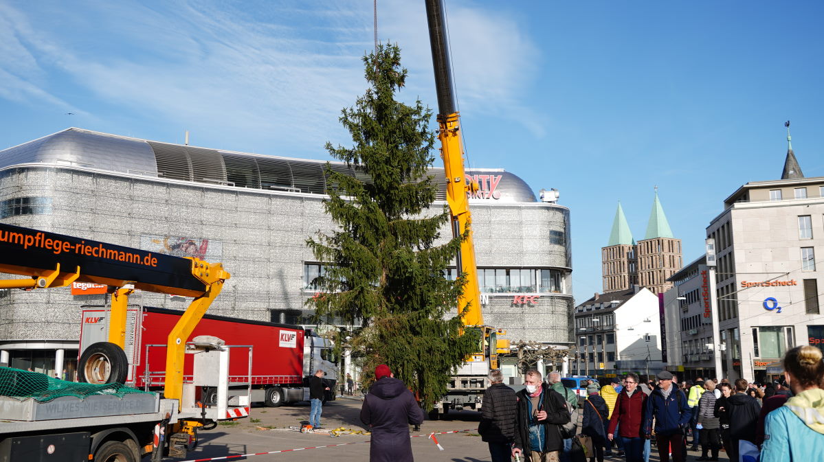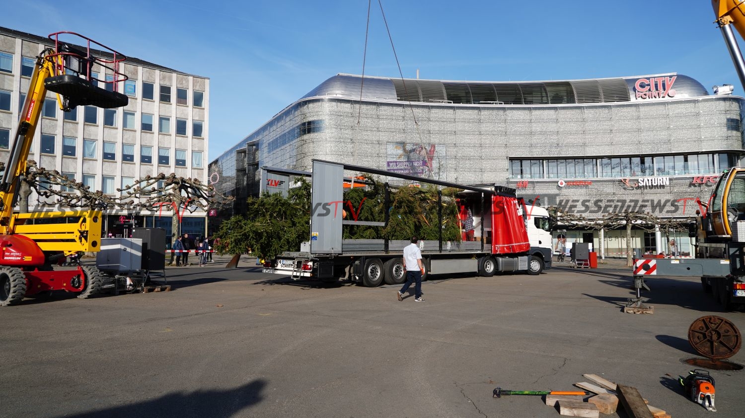 Kassel/Niedenstein – Ab dem kommenden Wochenende hat der Kasseler Königsplatz seinen Weihnachtsbaum wieder. Los ging es bereits am Samstagmorgen gegen 9 Uhr in Niedenstein-Kirchberg. Eine rund 14 Meter hohe Fichte aus einem Vorgarten in Niederstein, wurde der Auserwählte für den Kasseler Märchenweihnachtsmarkt. Die Familie hatte ihn gespendet, weil er zu groß geworden ist und bei stürmischen Tagen drohte auf das Haus zu kippen. Kurz nachdem er mit einem Kran gesichert wurde war der Baum auch schon ab. Verladen auf einem LKW kam er dann gegen 13 Uhr auf dem Königsplatz in Kassel an. Unter den Augen zahlreicher Zuschauer wurde der Baum aufgestellt. Jetzt wird er geschmückt und vorbereitet, damit am 22.11.2021 wie gewohnt auf dem Märchenweihnachtsmarkt in seiner vollen Pracht erstrahlen kann.