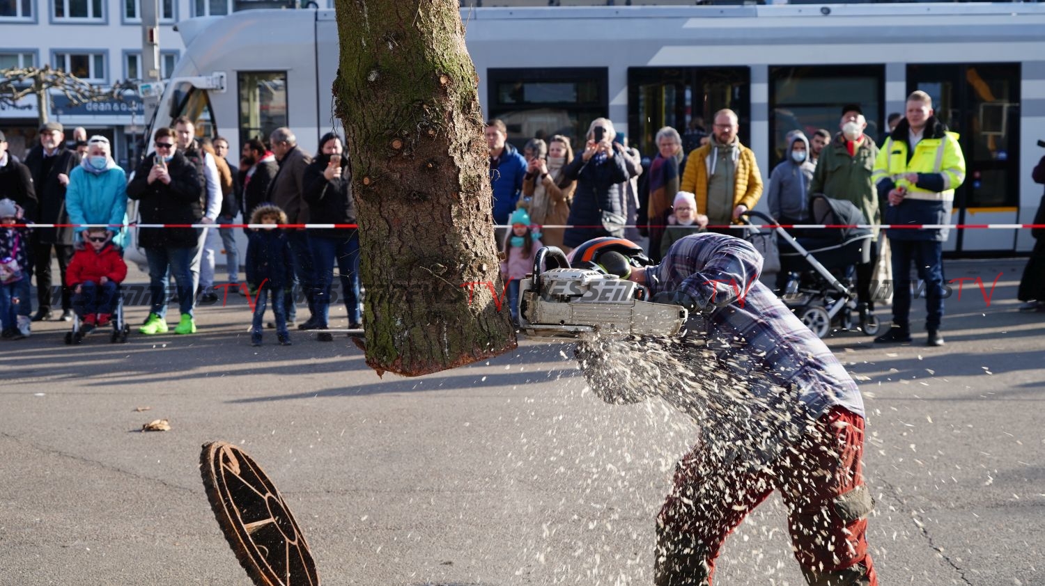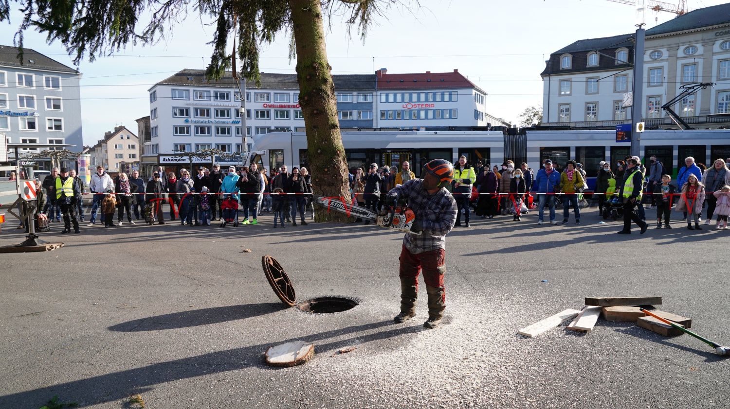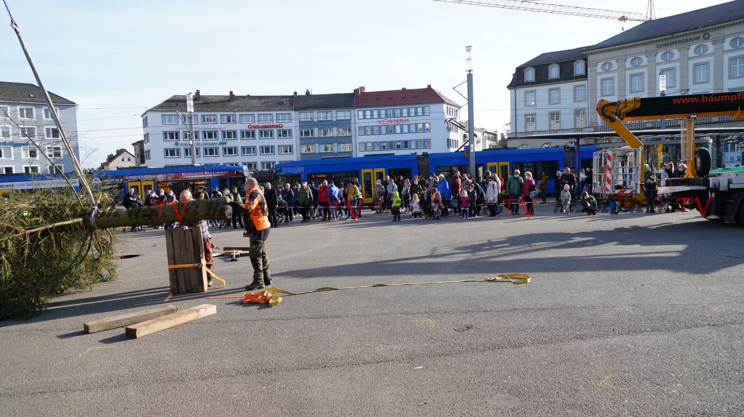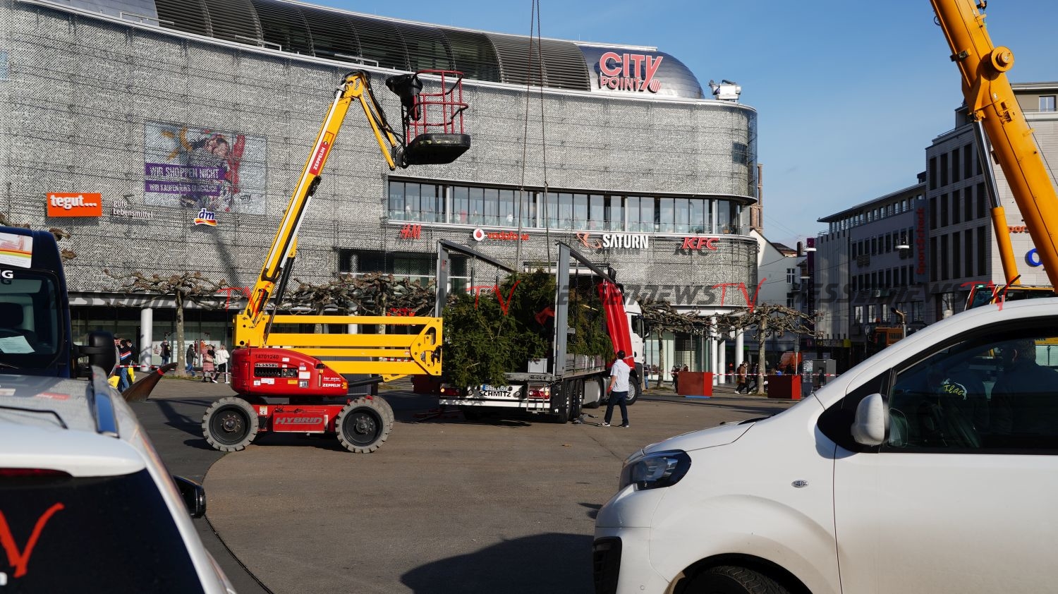 Kassel/Niedenstein – Ab dem kommenden Wochenende hat der Kasseler Königsplatz seinen Weihnachtsbaum wieder. Los ging es bereits am Samstagmorgen gegen 9 Uhr in Niedenstein-Kirchberg. Eine rund 14 Meter hohe Fichte aus einem Vorgarten in Niederstein, wurde der Auserwählte für den Kasseler Märchenweihnachtsmarkt. Die Familie hatte ihn gespendet, weil er zu groß geworden ist und bei stürmischen Tagen drohte auf das Haus zu kippen. Kurz nachdem er mit einem Kran gesichert wurde war der Baum auch schon ab. Verladen auf einem LKW kam er dann gegen 13 Uhr auf dem Königsplatz in Kassel an. Unter den Augen zahlreicher Zuschauer wurde der Baum aufgestellt. Jetzt wird er geschmückt und vorbereitet, damit am 22.11.2021 wie gewohnt auf dem Märchenweihnachtsmarkt in seiner vollen Pracht erstrahlen kann.