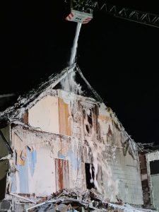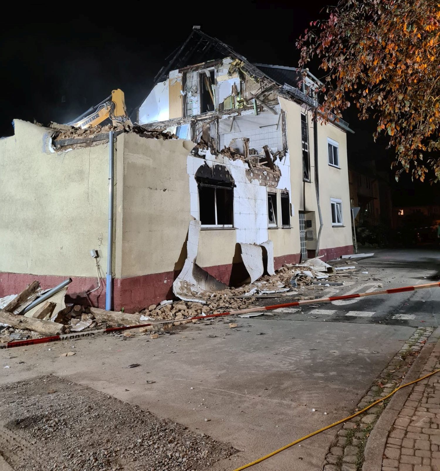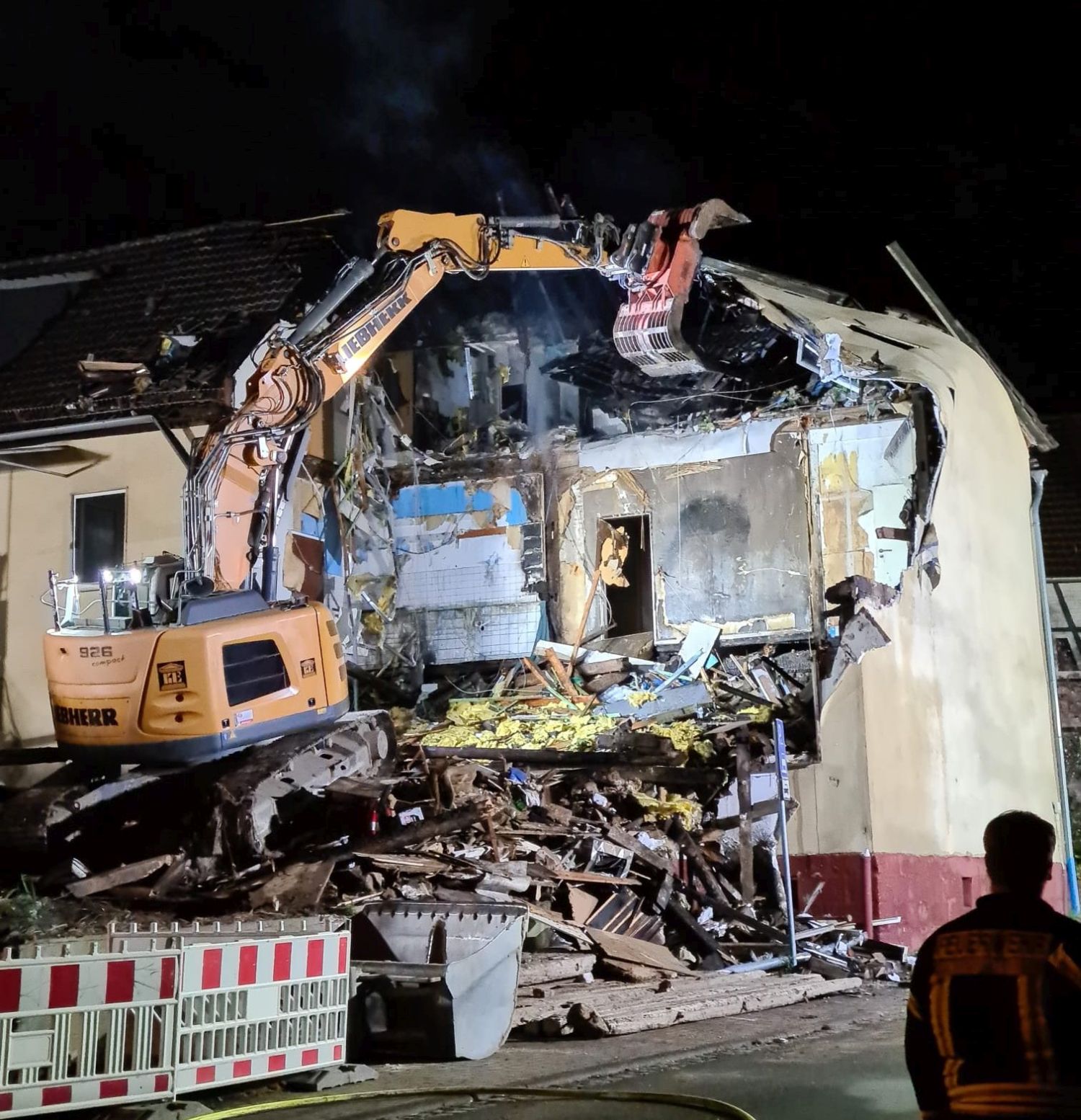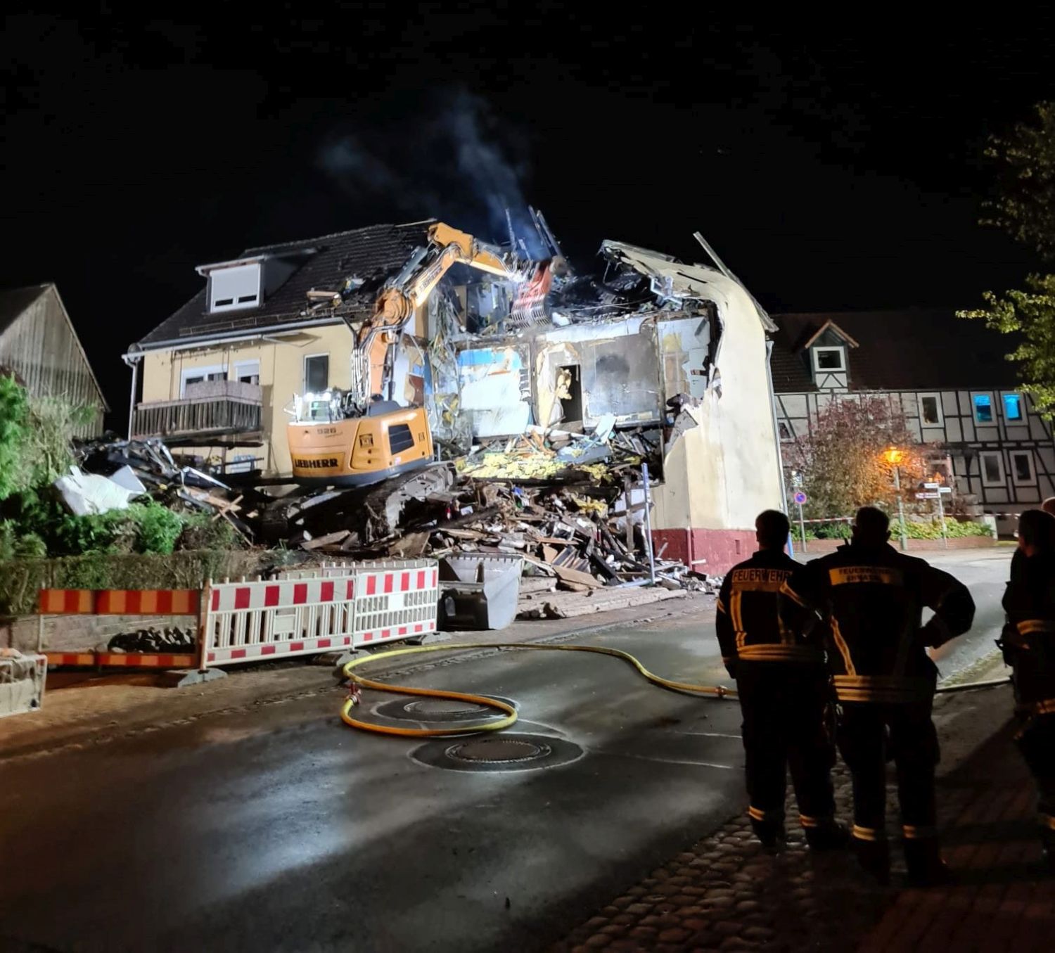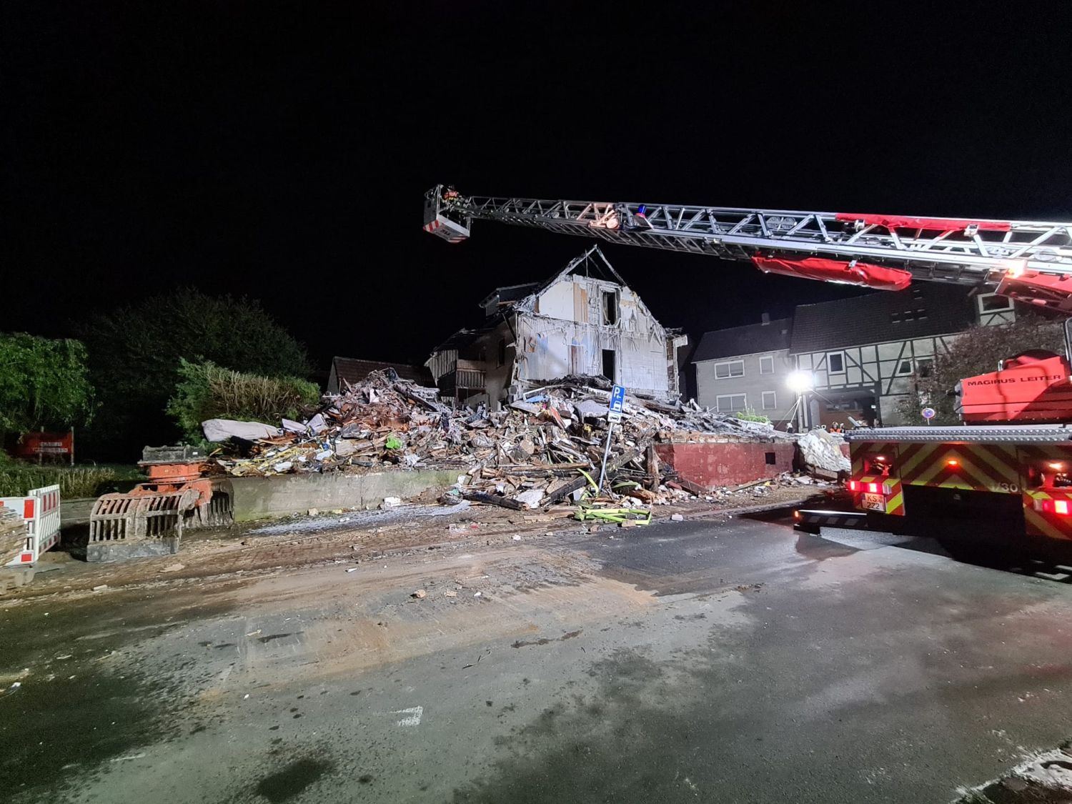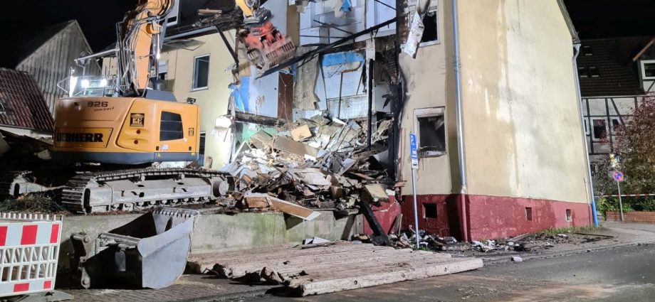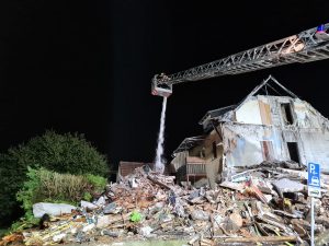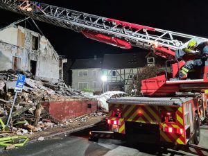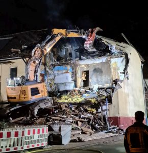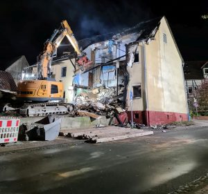 Ahnatal – Nachdem am Montagabend gegen 23:45 Uhr zum Brand eines Mehrfamilienhauses im Ahnataler Ortsteil Heckershausen gekommen war (- Wir berichteten -), haben Brandermittler ihre Ermittlungen vor Ort aufgenommen. Wie sie berichten, ist das Haus in der Straße „Am Rain“ durch das Feuer vollständig zerstört worden. Aufgrund des hohen Zerstörungsgrades lässt sich nicht mehr abschließend klären, wie das Feuer in der Erdgeschosswohnung des Hauses entstanden war. Hinweise auf eine vorsätzliche Brandstiftung liegen den Ermittlern jedoch derzeit nicht vor. Bei dem Brand des Hauses waren insgesamt vier Bewohner verletzt worden. Ein 43-Jähriger musste mit Brandverletzungen, die nicht lebensgefährlich sind, in ein Krankenhaus gebracht und dort stationär aufgenommen werden. Die drei weiteren Verletzten konnten nach ambulanten Behandlungen vor Ort oder im Krankenhaus letztlich wieder entlassen werden. Der Sachschaden beläuft sich nach ersten vorsichtigen Schätzungen auf rund 300.000 Euro. Das Haus wurde in der Nacht auf Mittwoch zum größten Teil abgerissen, um an die letzten Glutnester ran zu kommen. Gegen 22.30 übernahm eine Abrissfirma die Brandstelle. Das THW aus Kassel leuchtete die Einsatzstelle aus. Die Drehleiter aus Vellmar und der Katastrophenschutz-Zug aus Wolfhagen übernahmen den Brandschutz bis in die frühen Morgenstunden.