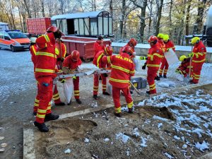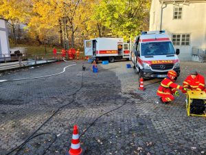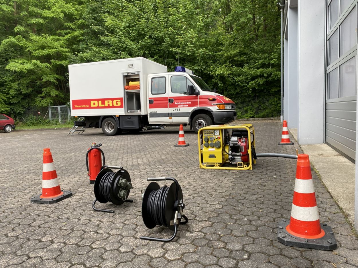 Die Katastrophenschutzausbilder in den Einheiten erarbeiteten gemeinsam ein Ausbildungskonzept, um unter Pandemiebedingungen möglichst effizient eine Vielzahl von Helfern ausbilden zu können. So fanden an jeweils einem Wochenende im Mai und im November gleich zwei Katastrophenschutzlehrgänge parallel statt. Dabei wurden zum einen Helfer in den Grundlagen des Katastrophenschutzes und der öffentlichen Gefahrenabwehr geschult und aufbauend darauf weitere Helfer im Bereich Technik und Sicherheit fortgebildet. Möglich wurde die Durchführung dieser parallel stattfindenden Lehrgänge nur dank der Hessische Landesfeuerwehrschule in Kassel, die ihre Räumlichkeiten und Übungsmöglichkeiten an den Wochenenden für die Katastrophenschutzausbildung zur Verfügung stellte. Unter idealen Rahmenbedingungen konnten die Helfer so neben der Theorie zu Führungsstrukturen und rechtlichen Grundlagen den Umgang mit Stromerzeugern und das Ausleuchten von Einsatzstellen üben. Auch ein Sandsackverbau zum Hochwasserschutz wurde errichtet und der praktische Umgang mit Tauchpumpen geübt.
