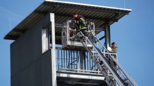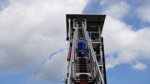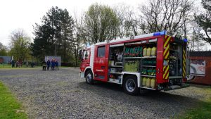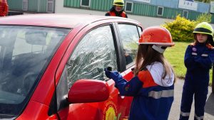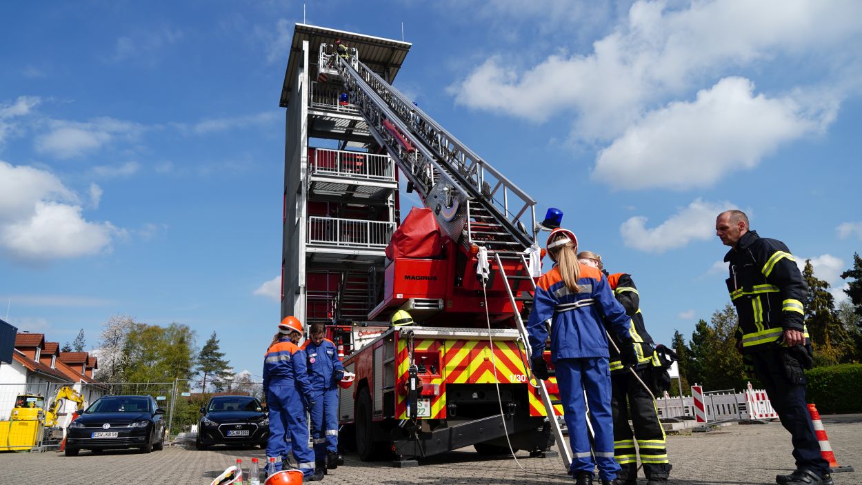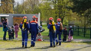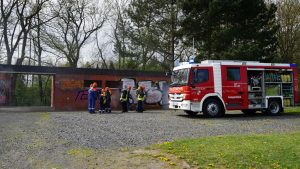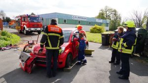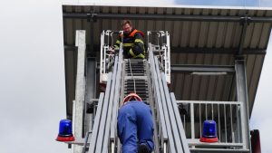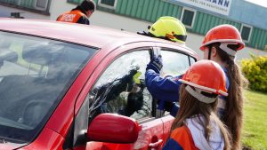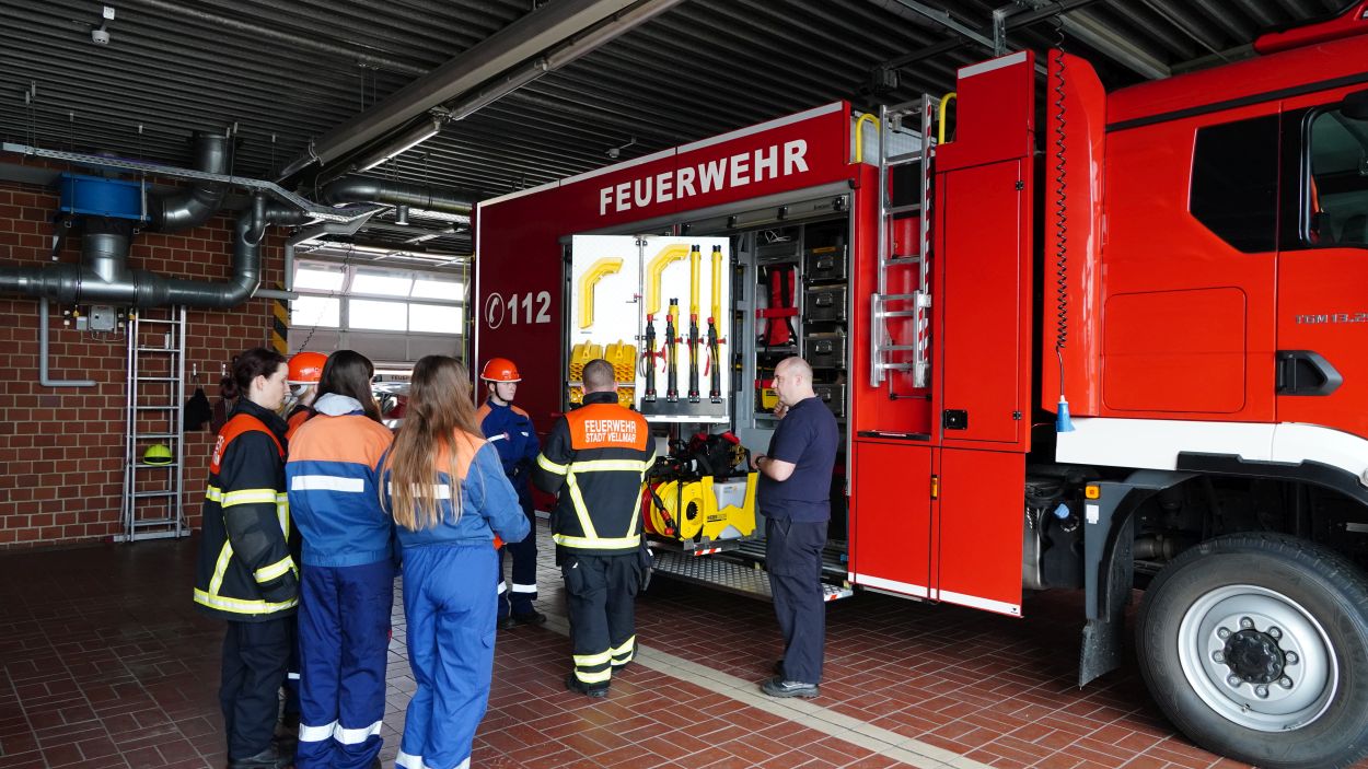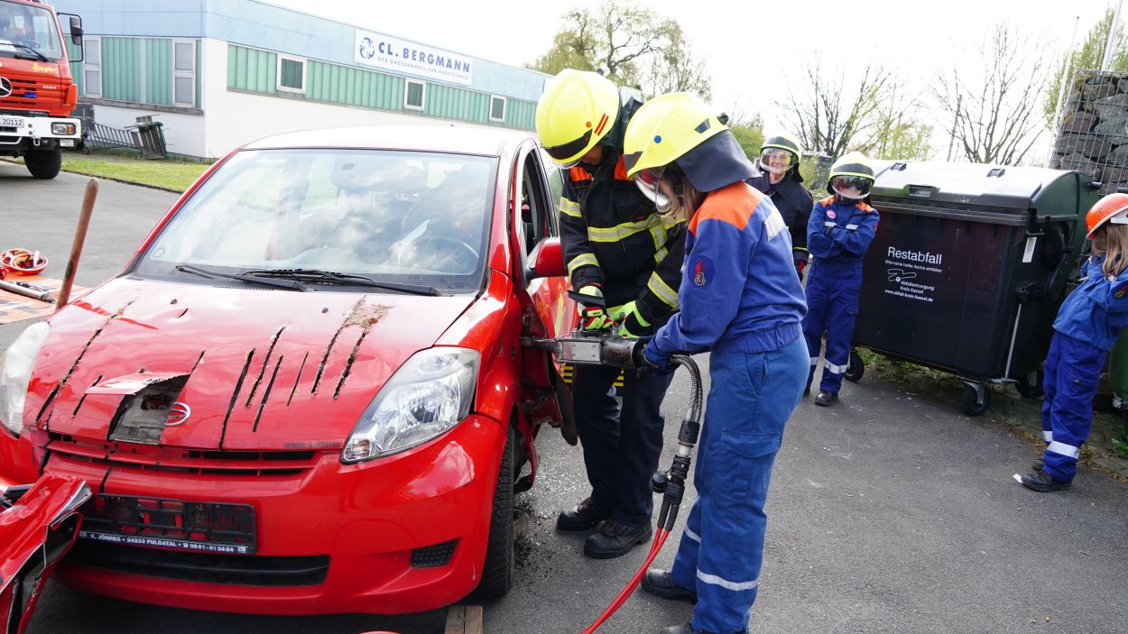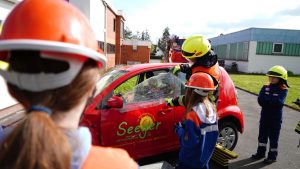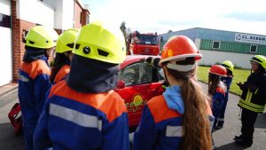 Bereits an der zweiten Station kam schon schweres Gerät zum Einsatz. Hier wurde ein Verkehrsunfall mit eingeklemmter Person dargestellt. Mit Helm, Visier und Handschuhe wurde zuerst die Scheibe abgeklebt und mit einem Federkorn zum Platzen gebracht und dann entfernt. Danach kam Schneid- und Spreizgerät zum Einsatz und die Tür wurde vom Fahrzeug abgetrennt. Bei dem schweren Gerät waren auch die Mitglieder der Feuerwehr zur Hilfe da. In luftiger Höhe ging es an Station 3. Hier kam auch die Drehleiter zum Einsatz. Höhenangst sollte man hier nicht haben, denn es ging rauf auf einen 15 Meter Turm. Mit einem Seil, gut gesichert, mit einem Rettungsknoten ging es dann die Leiter hoch. An der letzten Stadtion ging es dann mit einem Löschfahrzeug zum Festplatz. Hier wurde ein Brand in einem Gebäude simuliert. Im stark verrauchten Raum wurde auch ein Dummy versteckt, der gefunden werden musste. Mit einer Atemschutzattrappe speziell für Kinder und einer Wärmebildkamera gingen die Mädchen dann zu zweit auf die Rettungsmission. Mit Spaghetti Bolognese ging der Tag auch gegen 14 Uhr zu Ende. Auch wenn die Arbeit der Feuerwehr nicht auf jeden Geschmack der Teilnehmer gestoßen ist, war es dennoch ein aufregender Tag. Denn genau dafür ist der Girlsday auch gedacht.