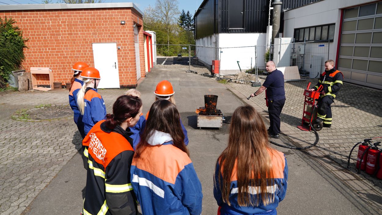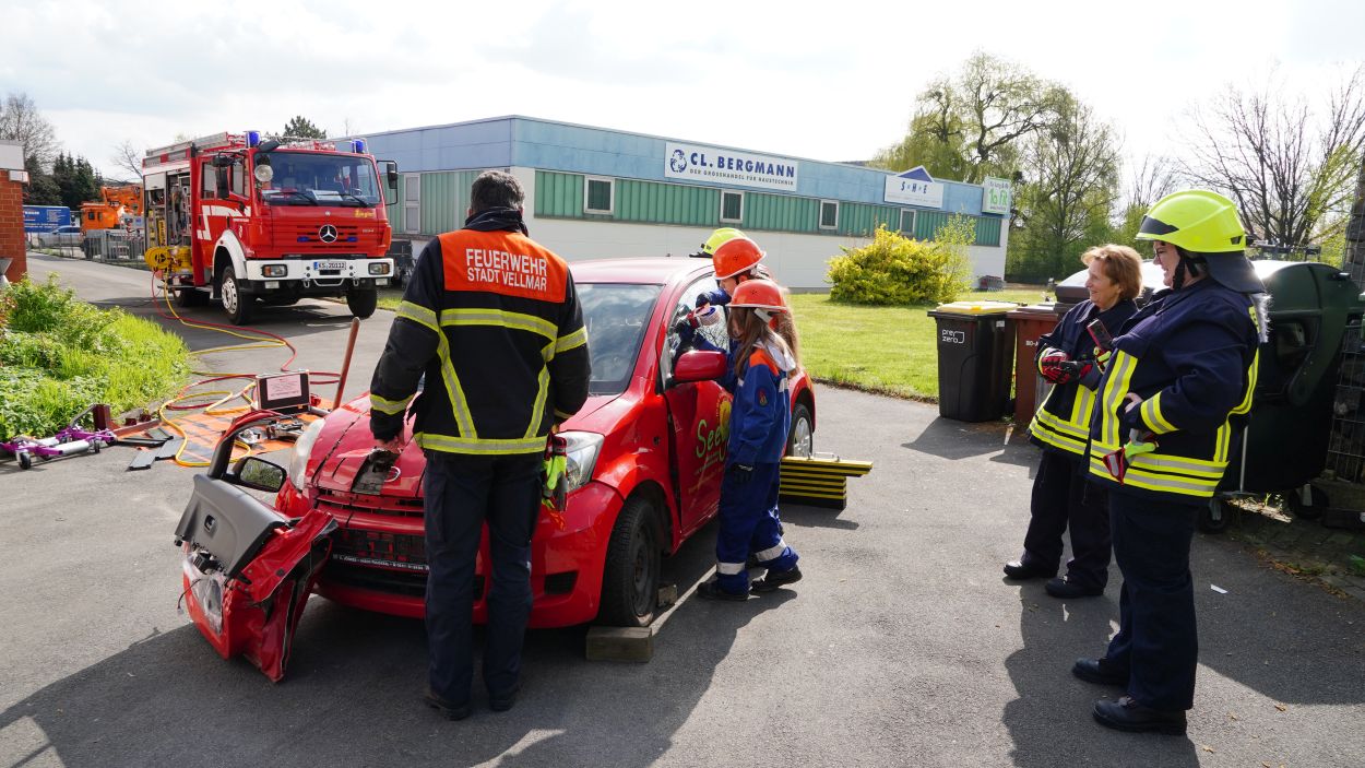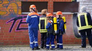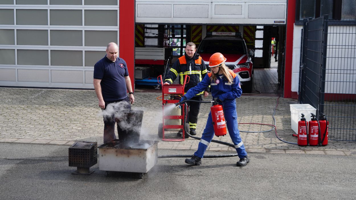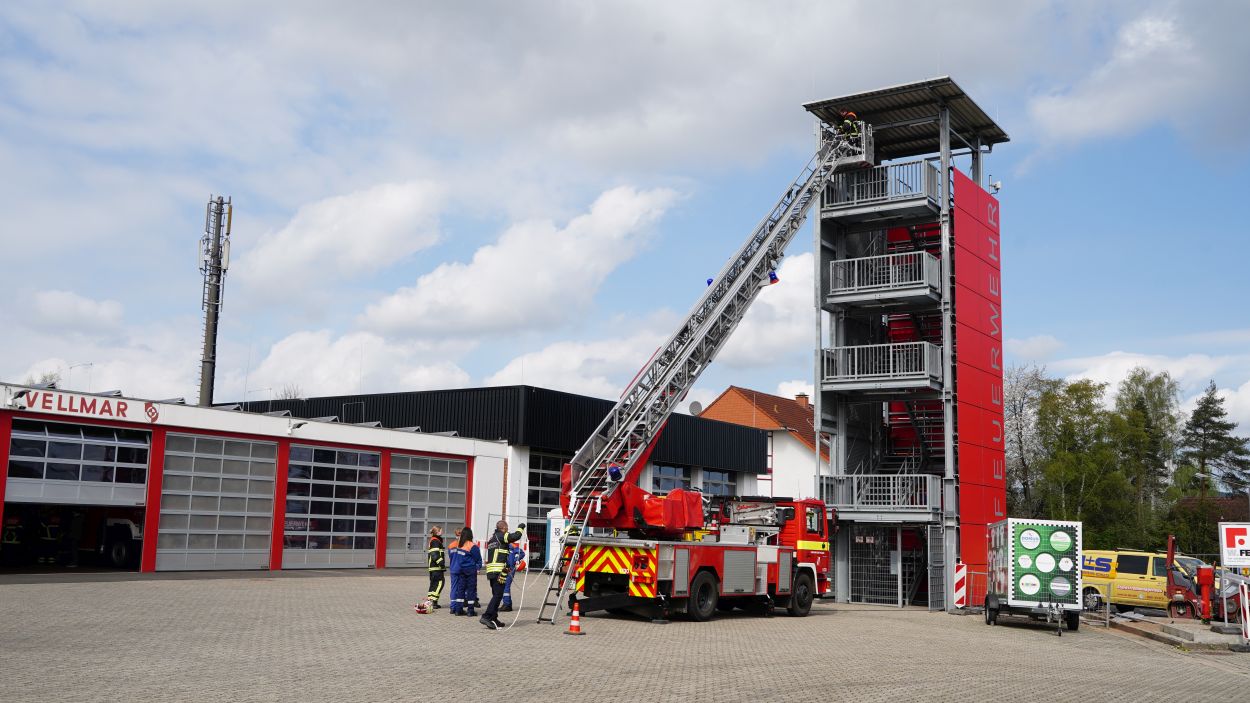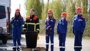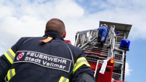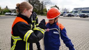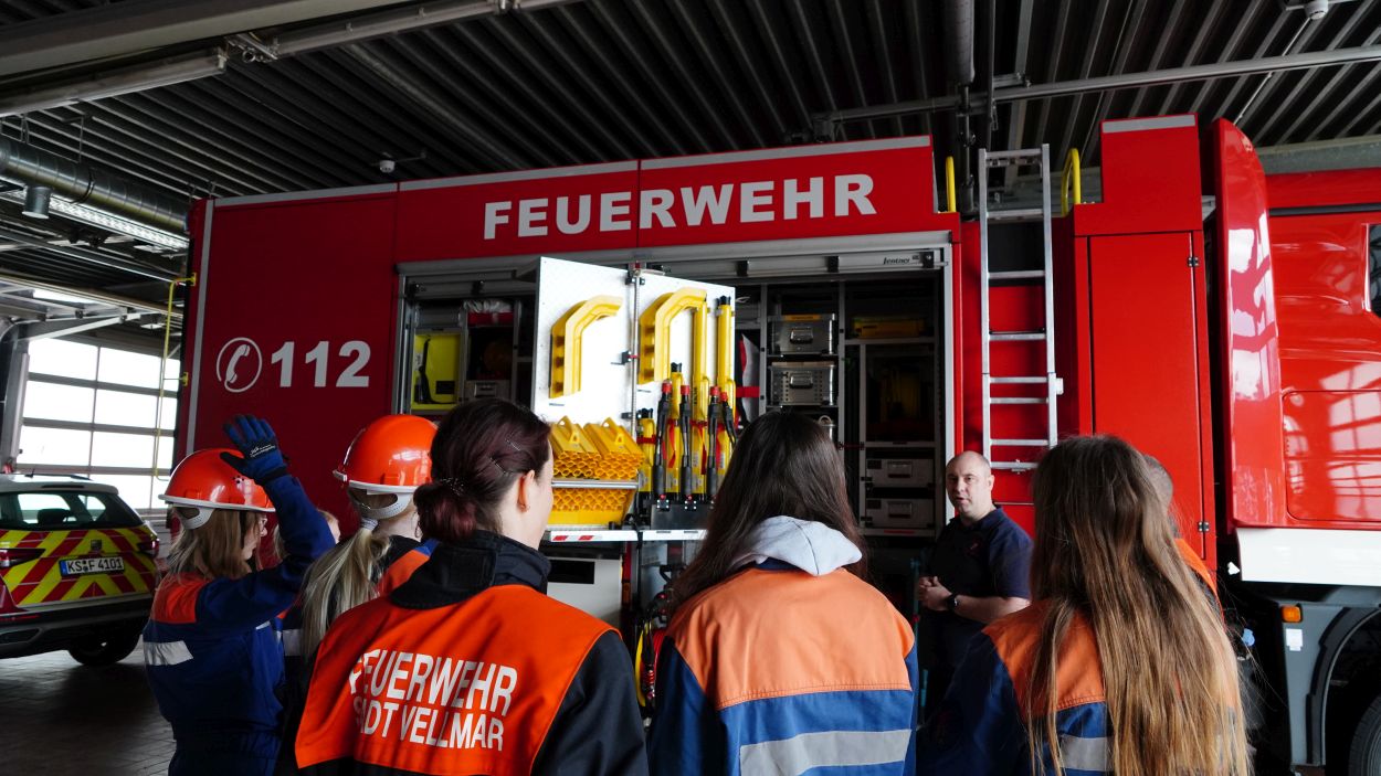 Vellmar – 23 junge Mädchen aus Stadt und Landkreis Kassel hatten am Donnerstag zum Girlsday die Möglichkeit, in den Beruf der Feuerwehr hineinzuschnuppern. Neben Feuer löschen und Personenrettung wurde auch an schweren Geräten geübt. Geplant und von Geraldine Köhler organisiert, ging es bereits um 8 Uhr mit einem Kennenlern-Frühstück los. Um 9 Uhr wurden die Mädchen aufgeteilt und es ging zu vier Übungsstationen. An der ersten Station wurde gezeigt, mit welchen Mittel man am besten ein Feuer unter Kontrolle bringt, auch das Zielen mit einem Schlauch wurde geübt. Ein Gasbrand wurde simuliert und musste mit Feuerlöschern unter Kontrolle gebracht werden.