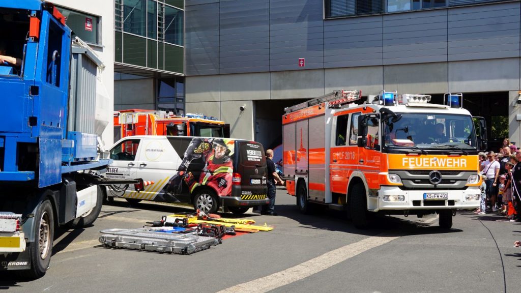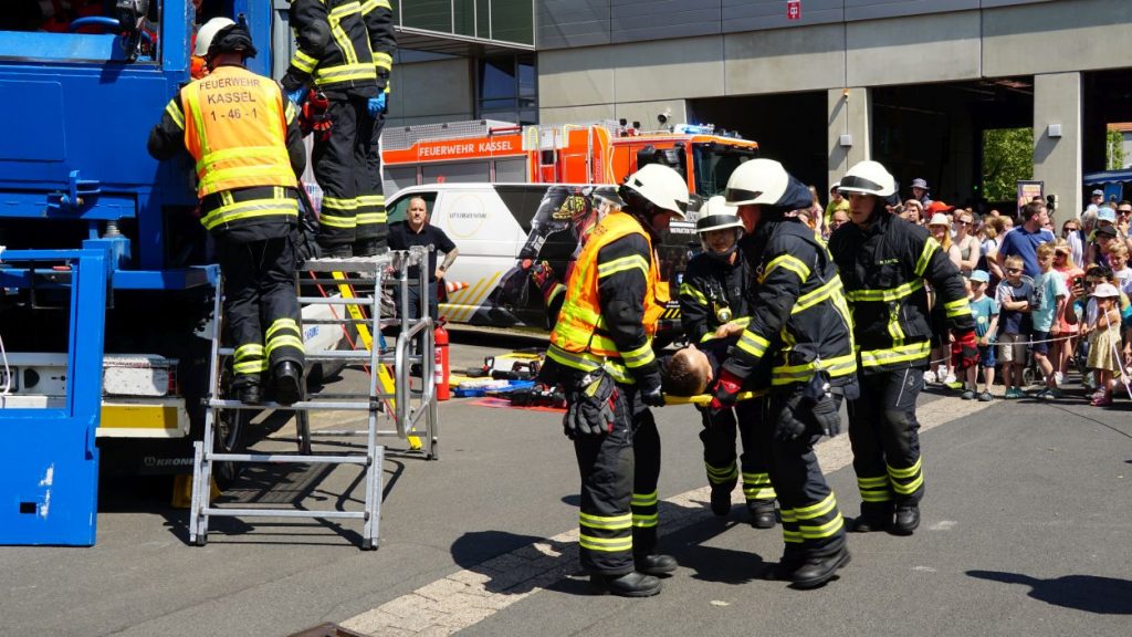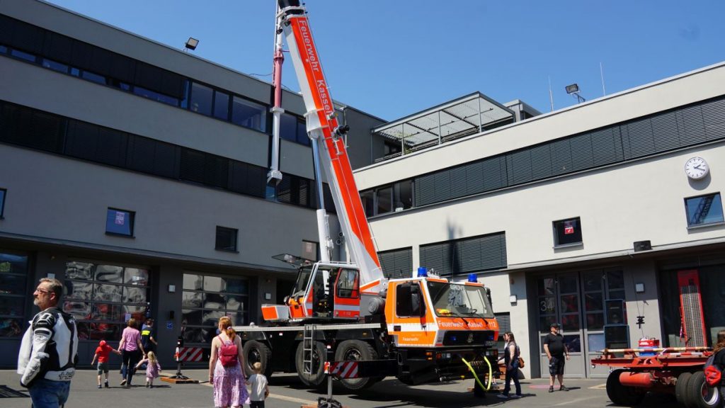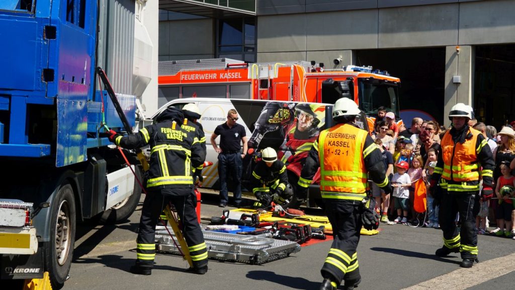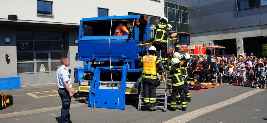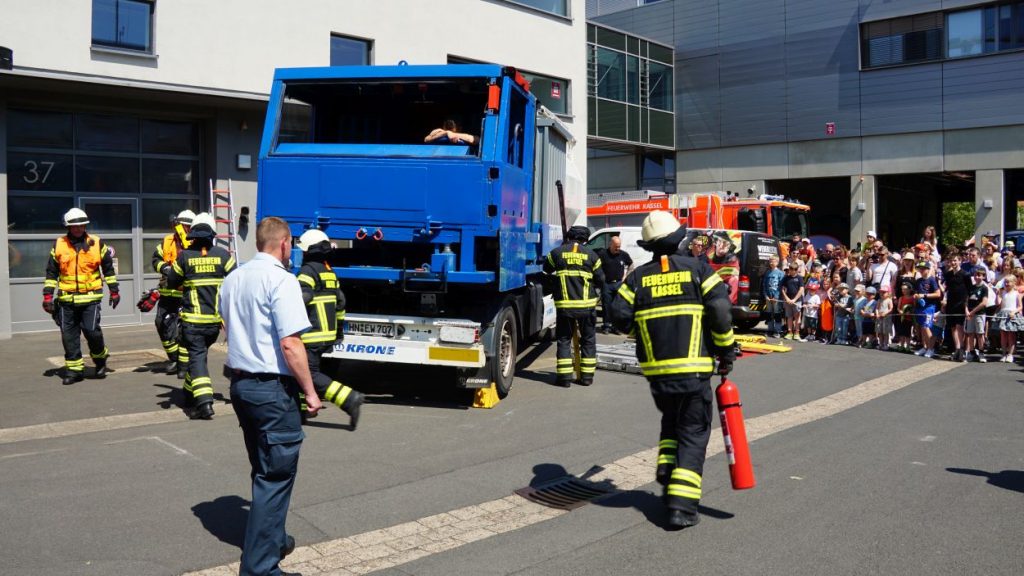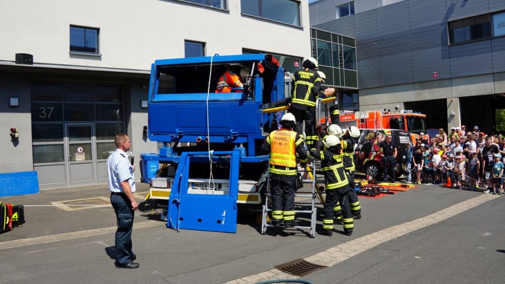Kassel – Zahlreiche Besucher besuchten am Sonntag den Tag der offenen Tür bei der Berufsfeuerwehr Kassel. Neben einer Führung durch das Gebäude wurden auch die verschiedenen Fahrzeuge präsentiert und die Besucher konnten so einen Einblick in die Arbeit der Feuerwehr bekommen. Auf dem Innenhof konnten die Besucher sehen, wie die Feuerwehr eine Person nach einem LKW-Unfall aus dem Fahrerhaus rettet. Obwohl ein realer größerer Einsatz die Berufs- und Freiwilligen Feuerwehren am Nachmittag gegen 15.30 Uhr erreichte (- wir berichteten -), konnte der Tag wie geplant um 18 Uhr beendet werden.