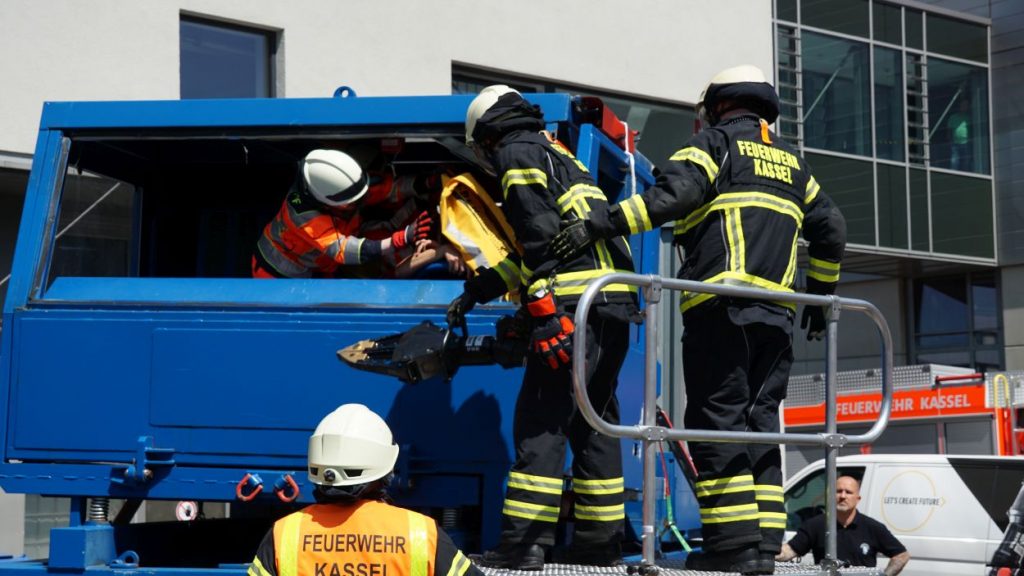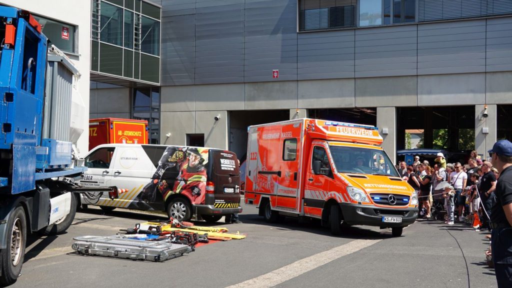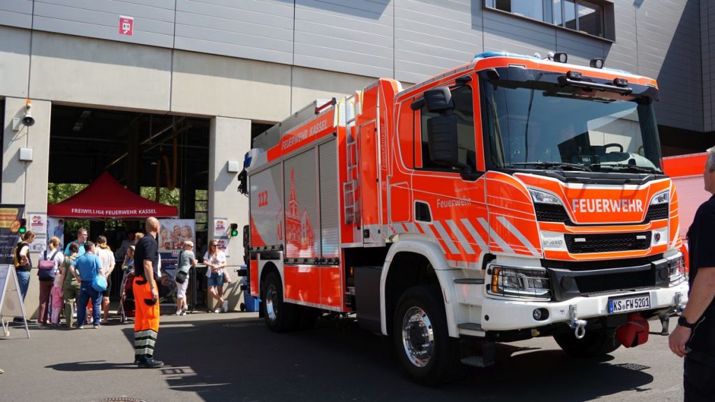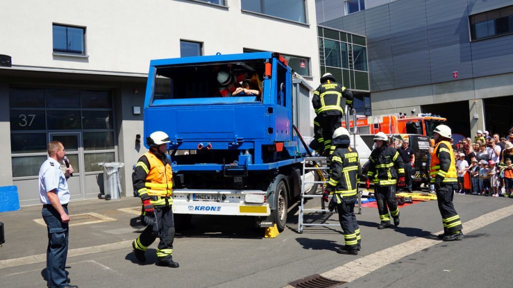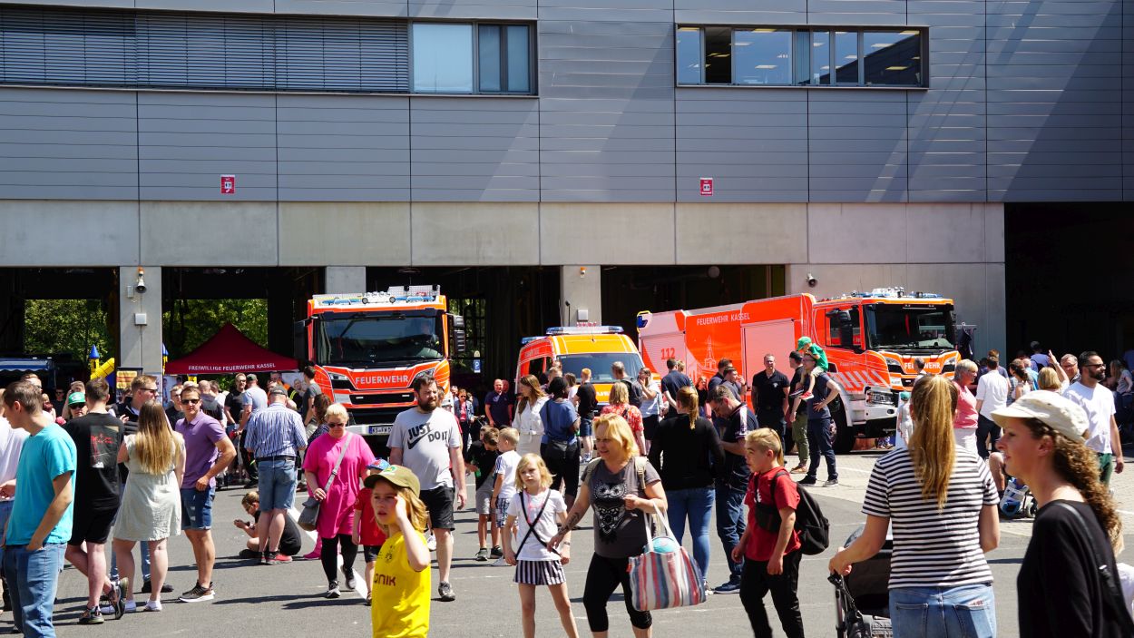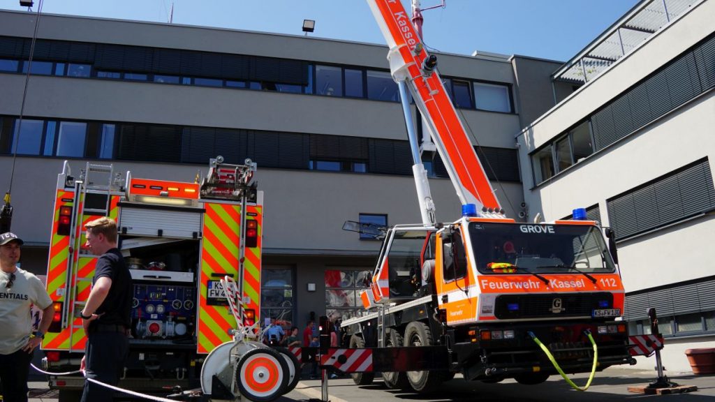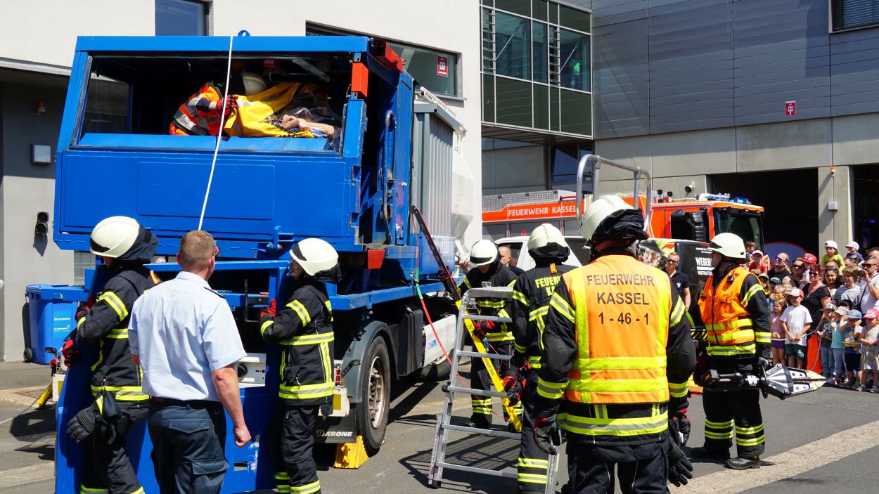 Kassel – Zahlreiche Besucher besuchten am Sonntag den Tag der offenen Tür bei der Berufsfeuerwehr Kassel. Neben einer Führung durch das Gebäude wurden auch die verschiedenen Fahrzeuge präsentiert und die Besucher konnten so einen Einblick in die Arbeit der Feuerwehr bekommen. Auf dem Innenhof konnten die Besucher sehen, wie die Feuerwehr eine Person nach einem LKW-Unfall aus dem Fahrerhaus rettet. Obwohl ein realer größerer Einsatz die Berufs- und Freiwilligen Feuerwehren am Nachmittag gegen 15.30 Uhr erreichte (- wir berichteten -), konnte der Tag wie geplant um 18 Uhr beendet werden.