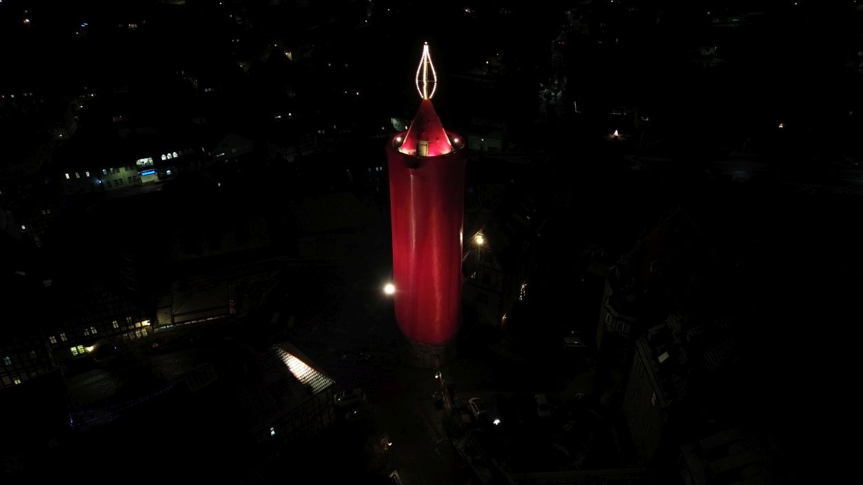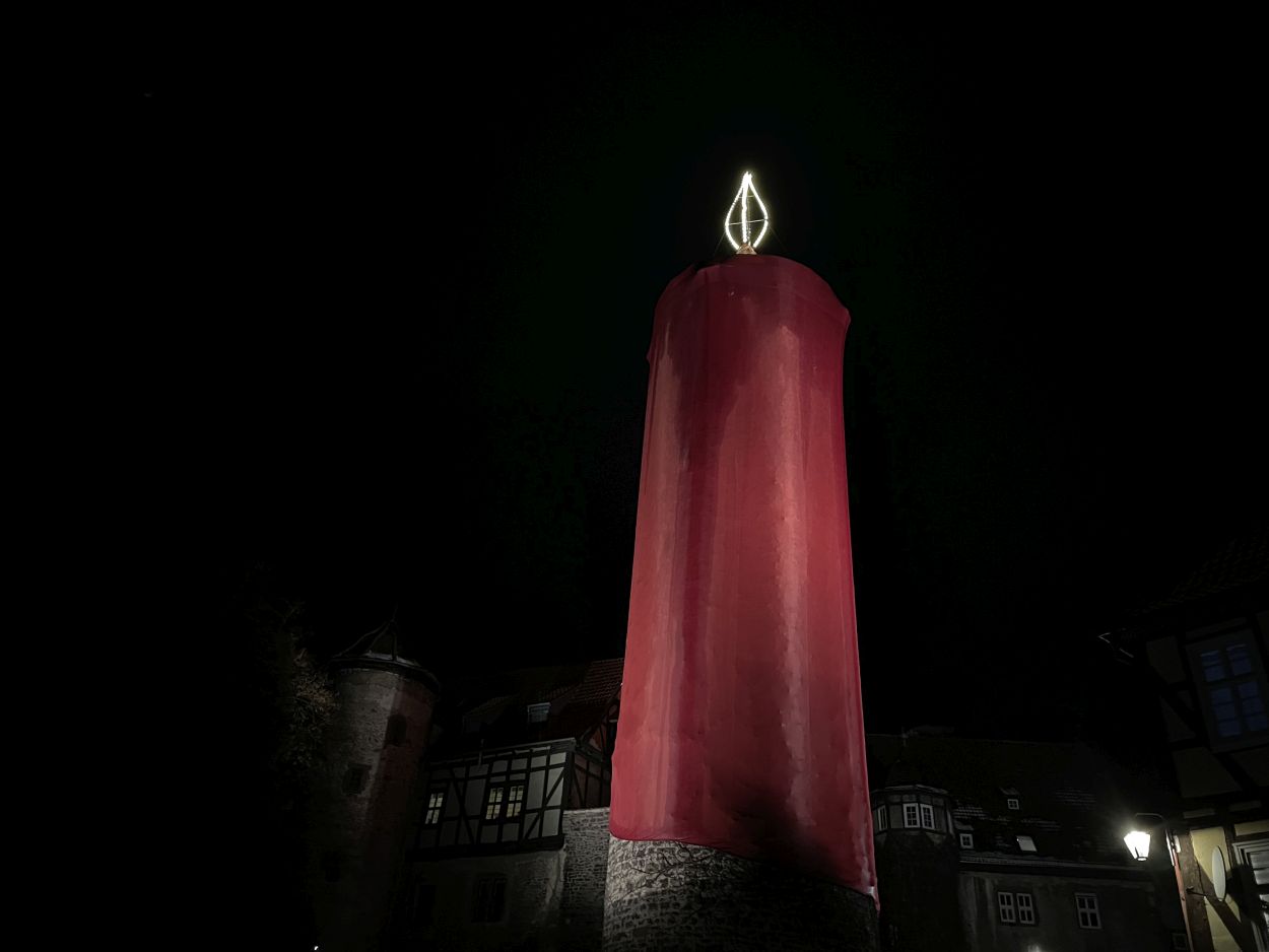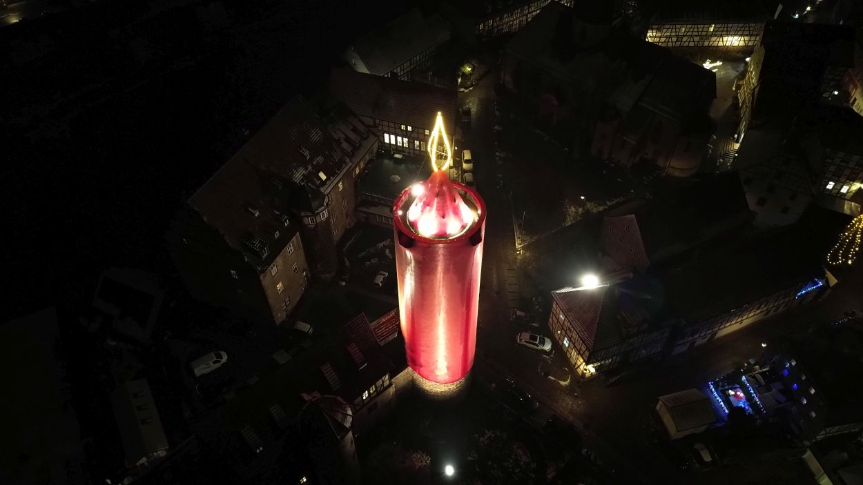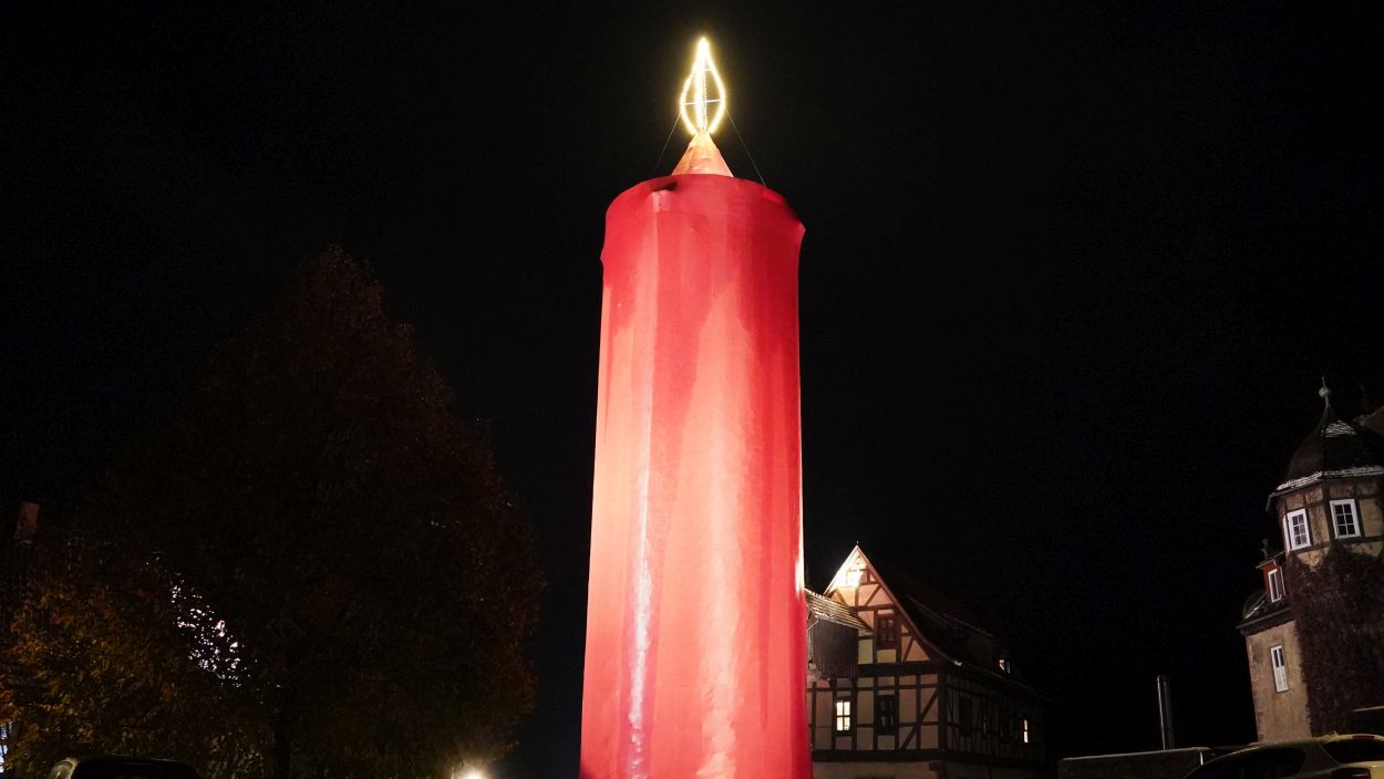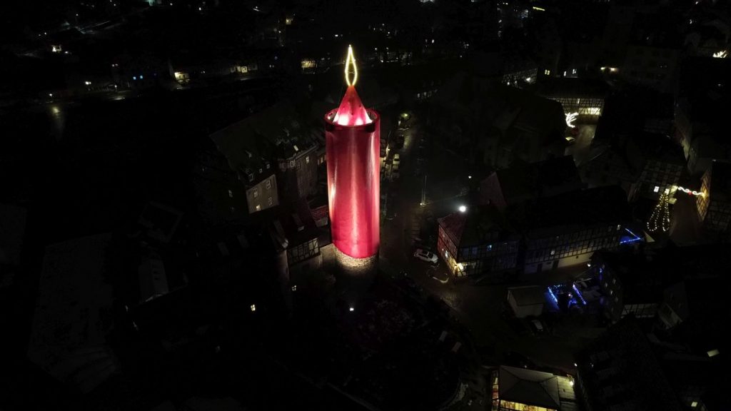 Schlitz – Sie ist 42 Meter groß und steht seit 1992 im Guinness-Buch der Rekorde. Die Schlitzer Weihnachtskerze in Mittelhessen ist die größte Kerze, die nicht aus Wachs besteht. Seit 1991 wird jedes Jahr im November der Turm der Hinterburg in ein rotes Tuch gehüllt. Der Turm selbst ist 36 Meter hoch und darauf kommt eine 6 Meter hohe Flamme aus 140 Glühlampen. An die Turmspitze kommt man mit einem Aufzug im Inneren des Turms. Die Kerze und der Ausblick dient als besondere Attraktion im Vogelsbergkreis.