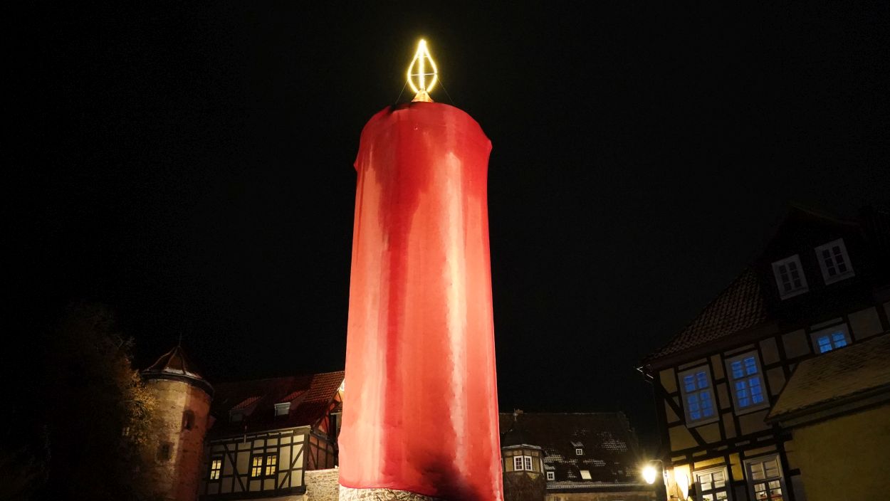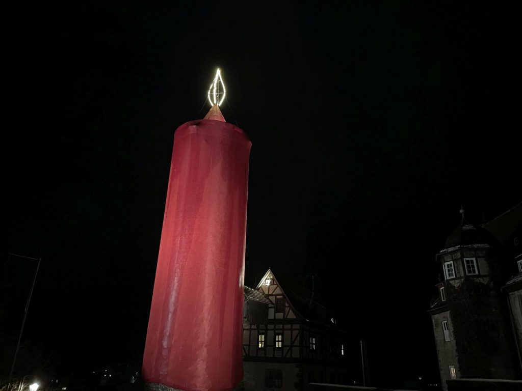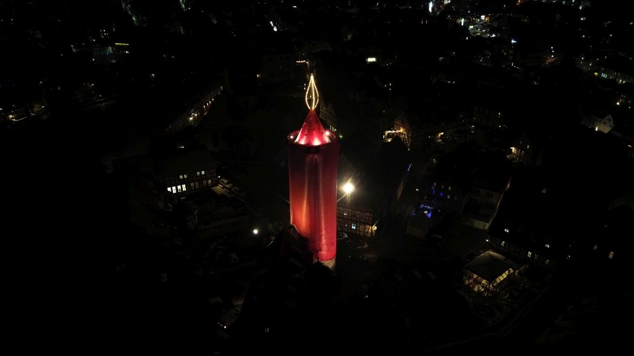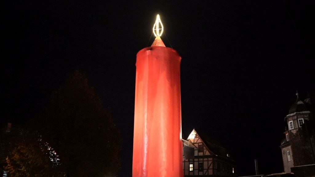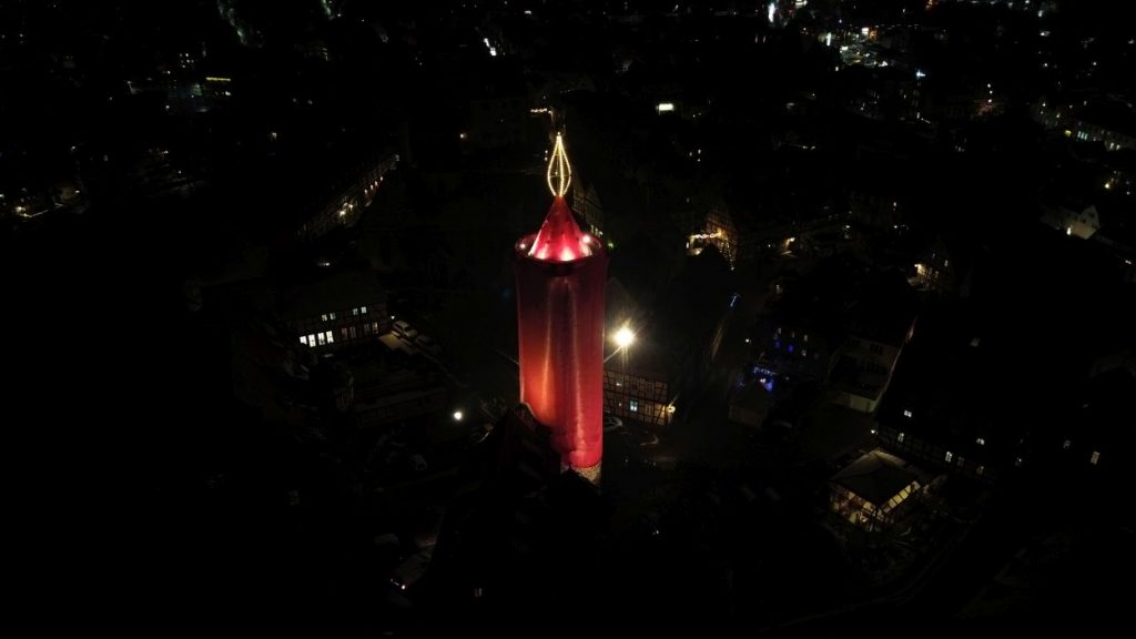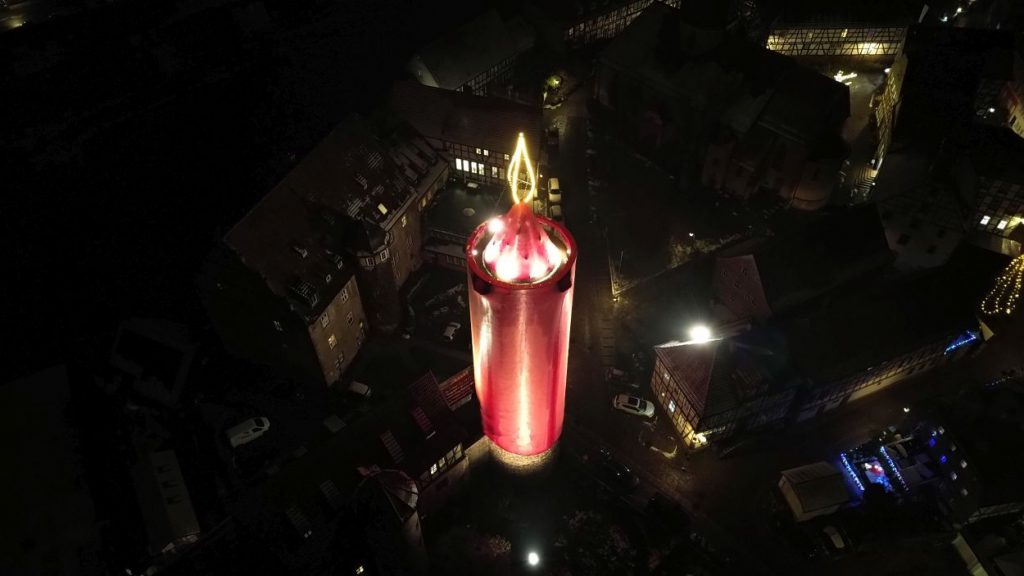 Schlitz – Sie ist 42 Meter groß und steht seit 1992 im Guinness-Buch der Rekorde. Die Schlitzer Weihnachtskerze in Mittelhessen ist die größte Kerze, die nicht aus Wachs besteht. Seit 1991 wird jedes Jahr im November der Turm der Hinterburg in ein rotes Tuch gehüllt. Der Turm selbst ist 36 Meter hoch und darauf kommt eine 6 Meter hohe Flamme aus 140 Glühlampen. An die Turmspitze kommt man mit einem Aufzug im Inneren des Turms. Die Kerze und der Ausblick dient als besondere Attraktion im Vogelsbergkreis.