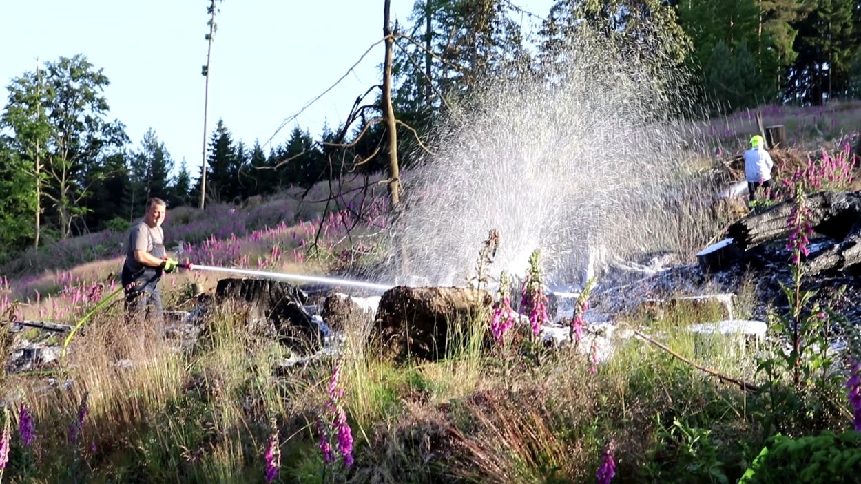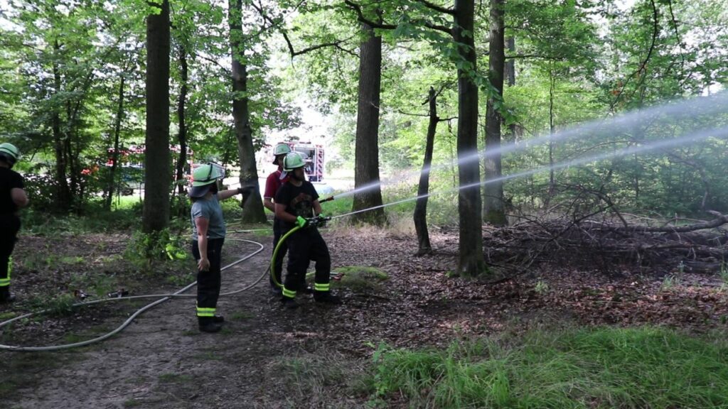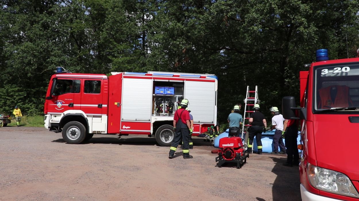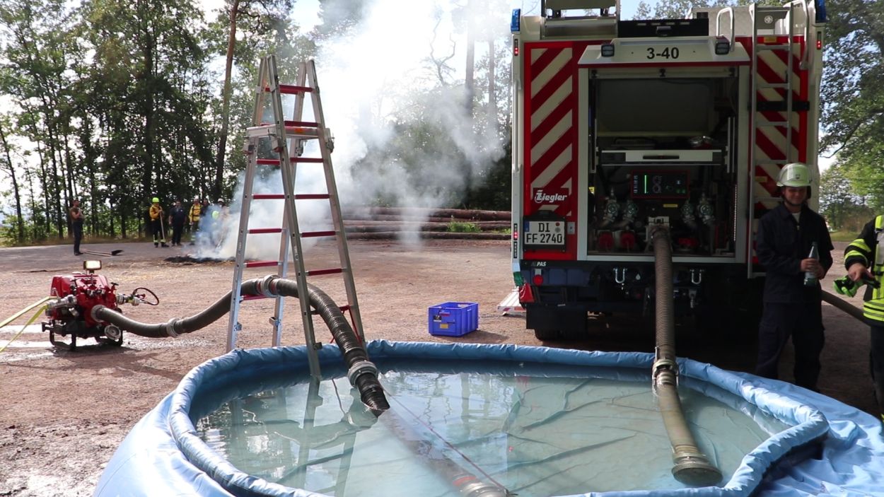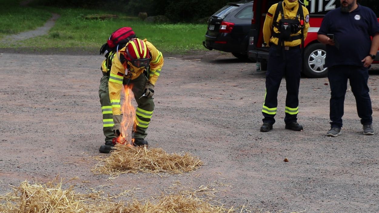 Bei besten Bedingungen wurde mit dem umfangreichen Spezialequipment möglichst realitätsnah und sicher der Umgang und das taktisch, richtige Vorgehen gelehrt und geübt. So wurden die Einsatzkräfte im richtigen Umgang mit den vorhanden Handwerkzeugen sowie dem Vorgehen mit leichten D-Schläuchen mit speziellen Waldbrandstrahlrohren im Gelände geschult. Ein Highlight bildete die Abschlussübung, bei welcher das gelernte mit „richtigen“ Feuer unter kontrollierten Bedingungen angewendet werden konnte. So musste das Feuer mit minimalen Wassereinsatz unter dem Einsatz von Handwerkzeugen und Löschrucksäcken gelöscht werden. Hier zeigte sich, dass auch kleine örtliche Feuerwehren mit wenigen Mitteln, besonders in der kritischen Erstphase des Einsatzes viel erreichen können.
