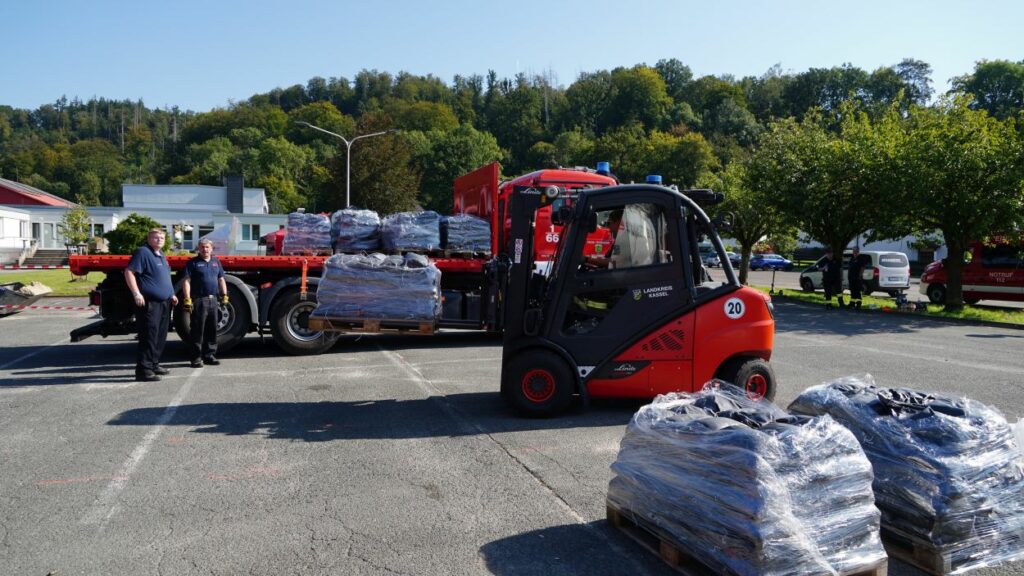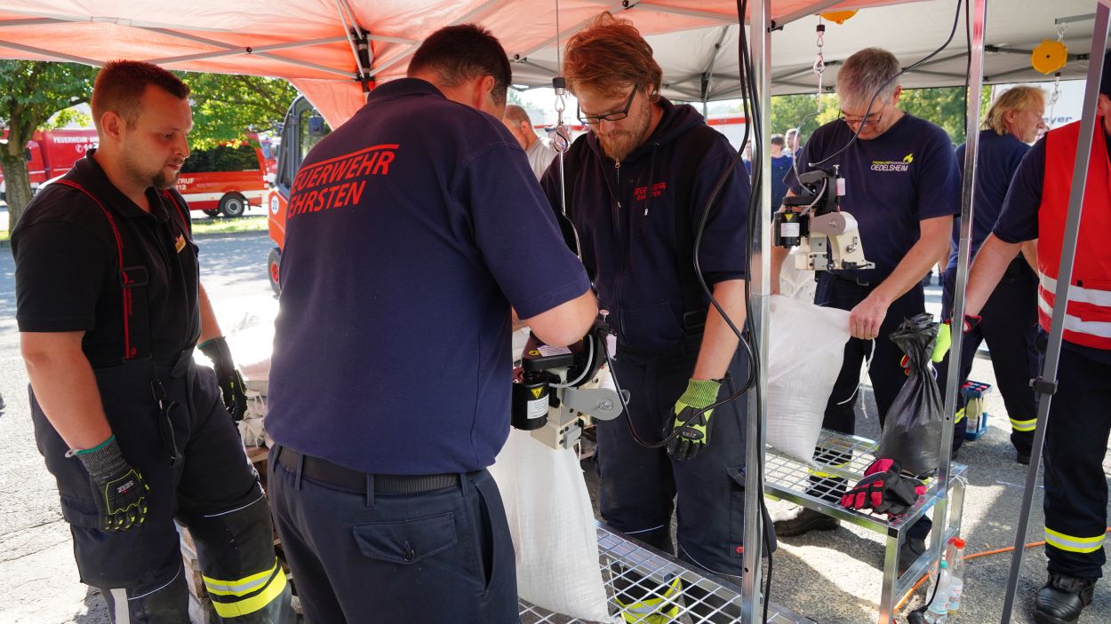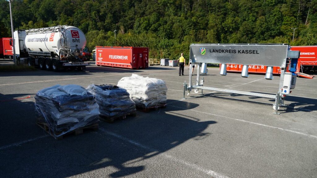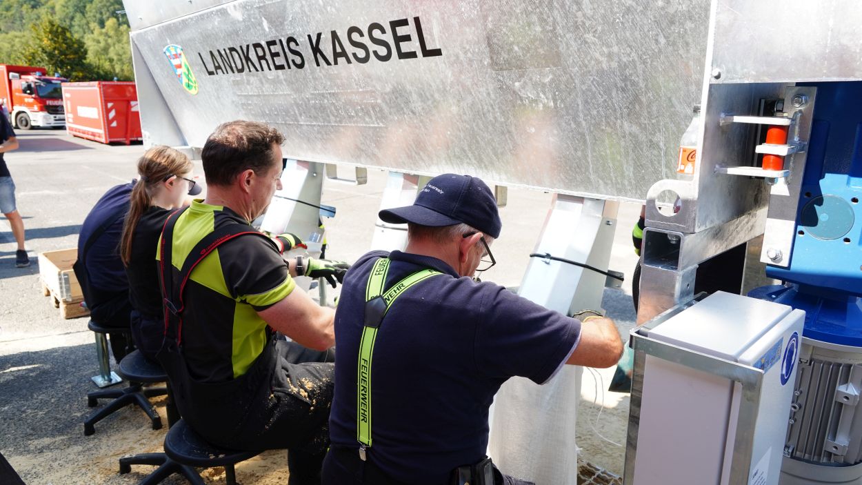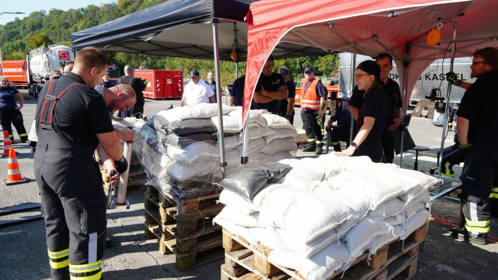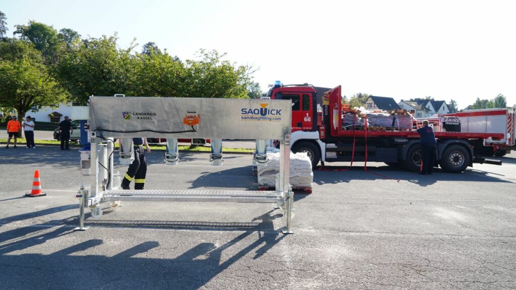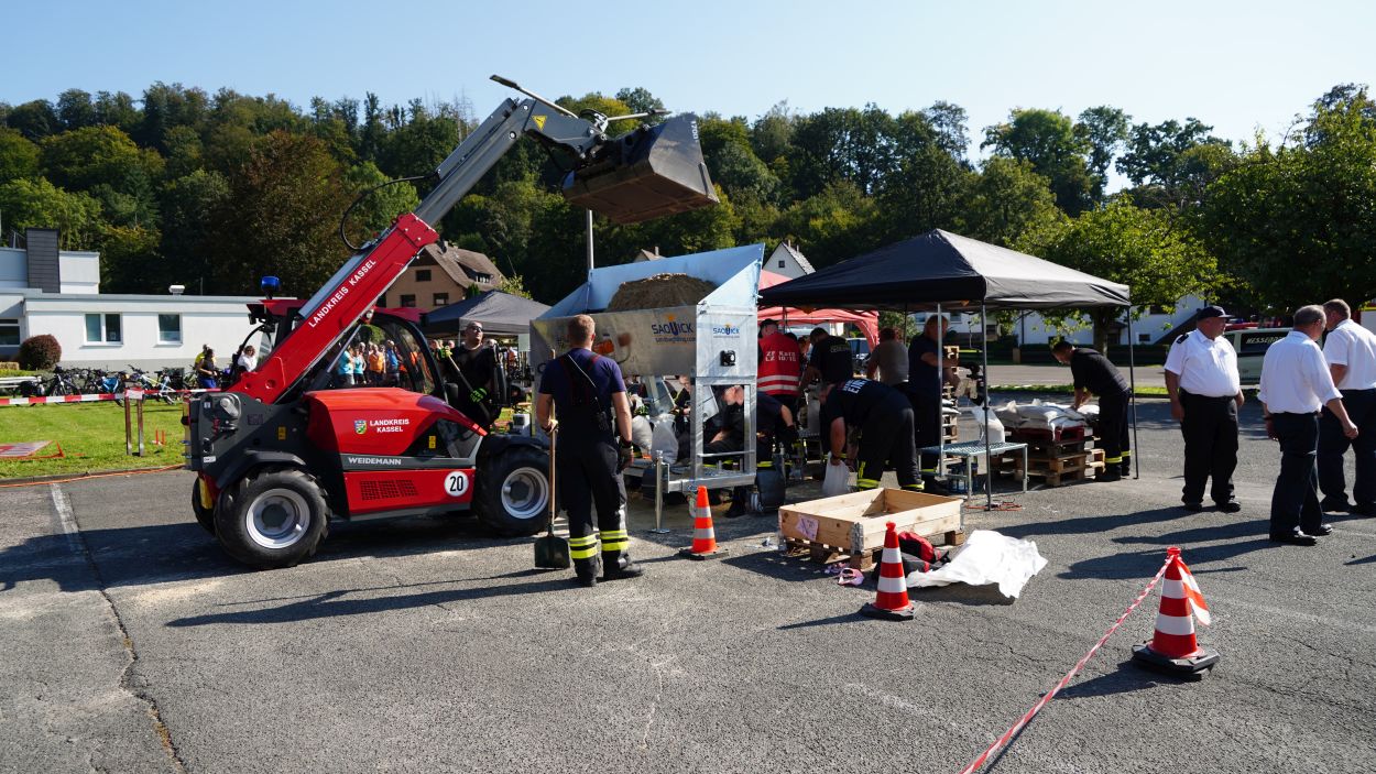 Bad Karlshafen – Am vergangenen Samstag übten 130 Einsatzkräfte anlässlich des zweiten bundesweiten Bevölkerungsschutztags in Helmarshausen. An diesem Tag soll ein besonderes Augenmerk auf den Zivil- und Katastrophenschutz im Landkreis Kassel gerichtet und die Leistungsfähigkeit der Katastrophenschutzeinheiten demonstriert werden. Insgesamt 4 Katastrophenschutz-Löschzüge der Feuerwehren im Landkreis Kassel übten in Stationsausbildung die Deichverteidigung von der Landseite und die Einrichtung und den Betrieb einer zentralen Sandsackfüllstelle sowie der damit verbundenen Logistik. Gleichzeitig waren Taucher und Strömungsretter der DLRG in der Deichsicherung von der Wasserseite aus im Einsatz. Bei der Deichsicherung wurden verschiedene Varianten gezeigt, wie man einen Deich mit Sandsäcken stabilisieren kann. Auch, wenn bereits Löscher entstanden sind. Bei der Sandsackfüllstation kam eine Maschine zu Hilfe, die der Landkreis erst vor Kurzem besorgt hat. Diese ermöglicht, bis zu 2.600 Sandsäcke in einer Stunde zu füllen. Das System ist zwar dennoch sehr Personal kräftig, allerdings leichter und für den Körper nicht so belastender als zuvor. Zudem werden sie vernäht und nicht wie sonst nur verschnürt. Somit sind Sie richtig Dicht und können nicht mehr aufgehen. Die Maschine steht im Katastrophenschutzlager Baunatal und kann bei Bedarf überall hin transportiert werden, wo sie benötigt wird.