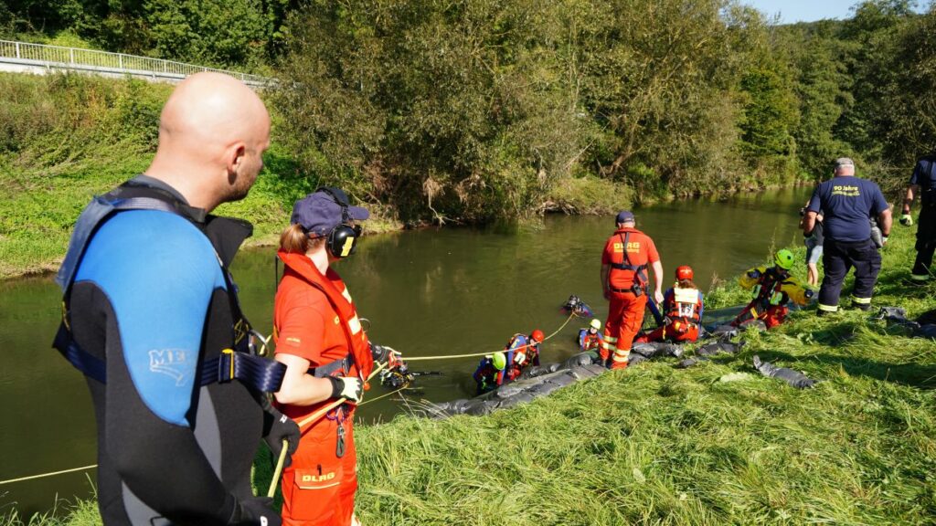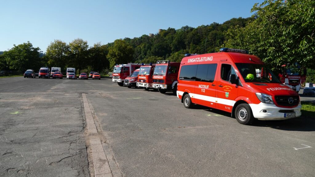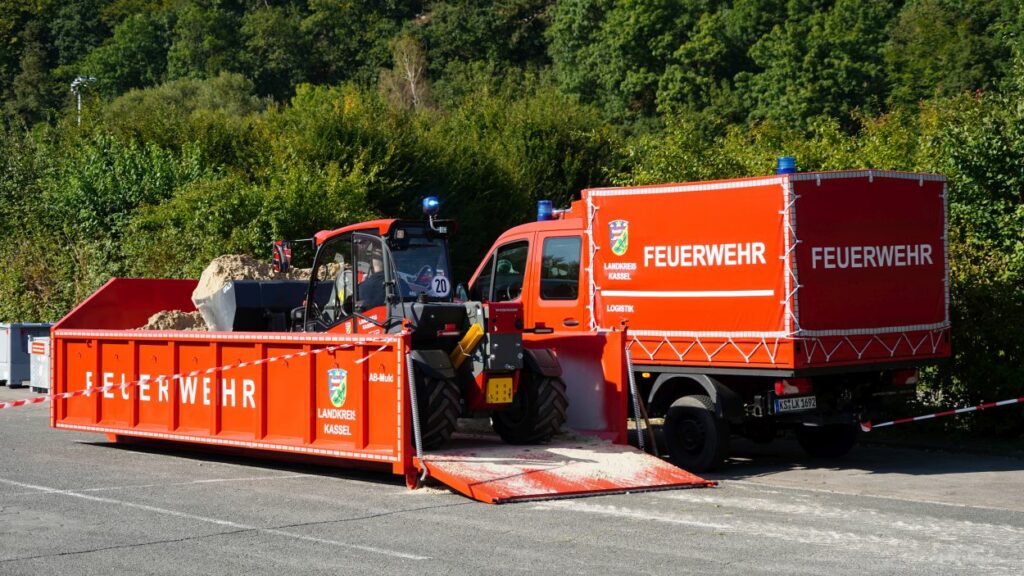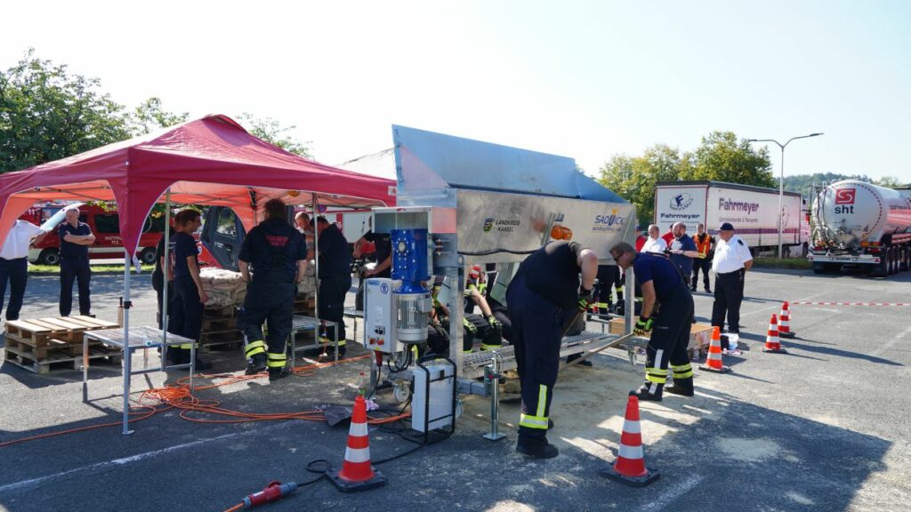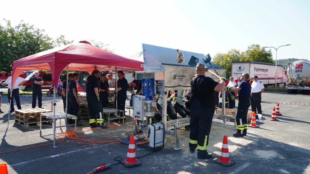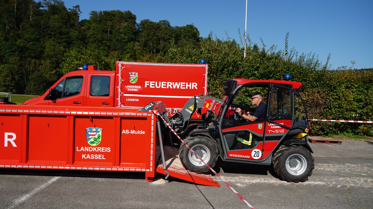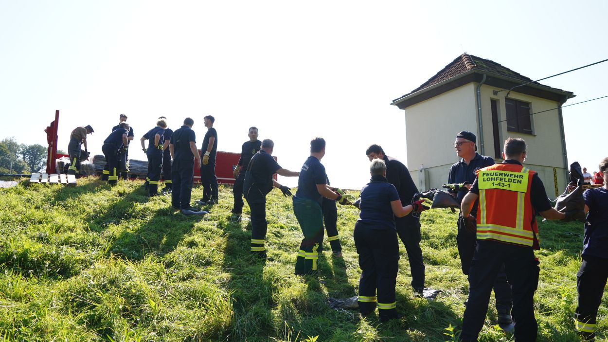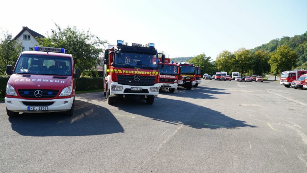 Bad Karlshafen – Am vergangenen Samstag übten 130 Einsatzkräfte anlässlich des zweiten bundesweiten Bevölkerungsschutztags in Helmarshausen. An diesem Tag soll ein besonderes Augenmerk auf den Zivil- und Katastrophenschutz im Landkreis Kassel gerichtet und die Leistungsfähigkeit der Katastrophenschutzeinheiten demonstriert werden. Insgesamt 4 Katastrophenschutz-Löschzüge der Feuerwehren im Landkreis Kassel übten in Stationsausbildung die Deichverteidigung von der Landseite und die Einrichtung und den Betrieb einer zentralen Sandsackfüllstelle sowie der damit verbundenen Logistik. Gleichzeitig waren Taucher und Strömungsretter der DLRG in der Deichsicherung von der Wasserseite aus im Einsatz. Bei der Deichsicherung wurden verschiedene Varianten gezeigt, wie man einen Deich mit Sandsäcken stabilisieren kann. Auch, wenn bereits Löscher entstanden sind. Bei der Sandsackfüllstation kam eine Maschine zu Hilfe, die der Landkreis erst vor Kurzem besorgt hat. Diese ermöglicht, bis zu 2.600 Sandsäcke in einer Stunde zu füllen. Das System ist zwar dennoch sehr Personal kräftig, allerdings leichter und für den Körper nicht so belastender als zuvor. Zudem werden sie vernäht und nicht wie sonst nur verschnürt. Somit sind Sie richtig Dicht und können nicht mehr aufgehen. Die Maschine steht im Katastrophenschutzlager Baunatal und kann bei Bedarf überall hin transportiert werden, wo sie benötigt wird.