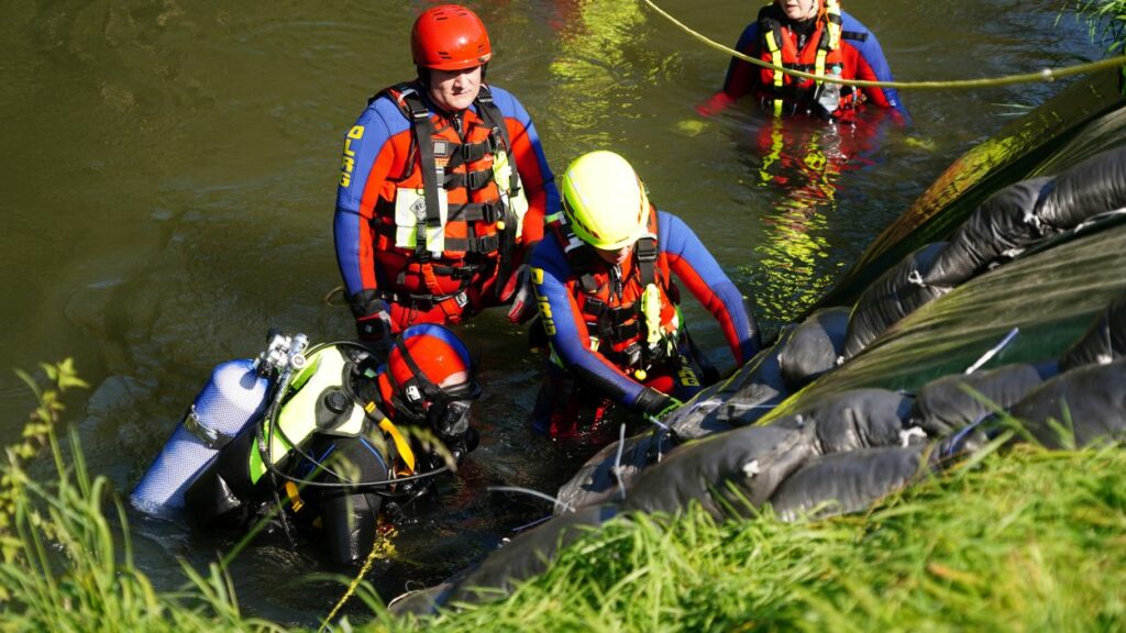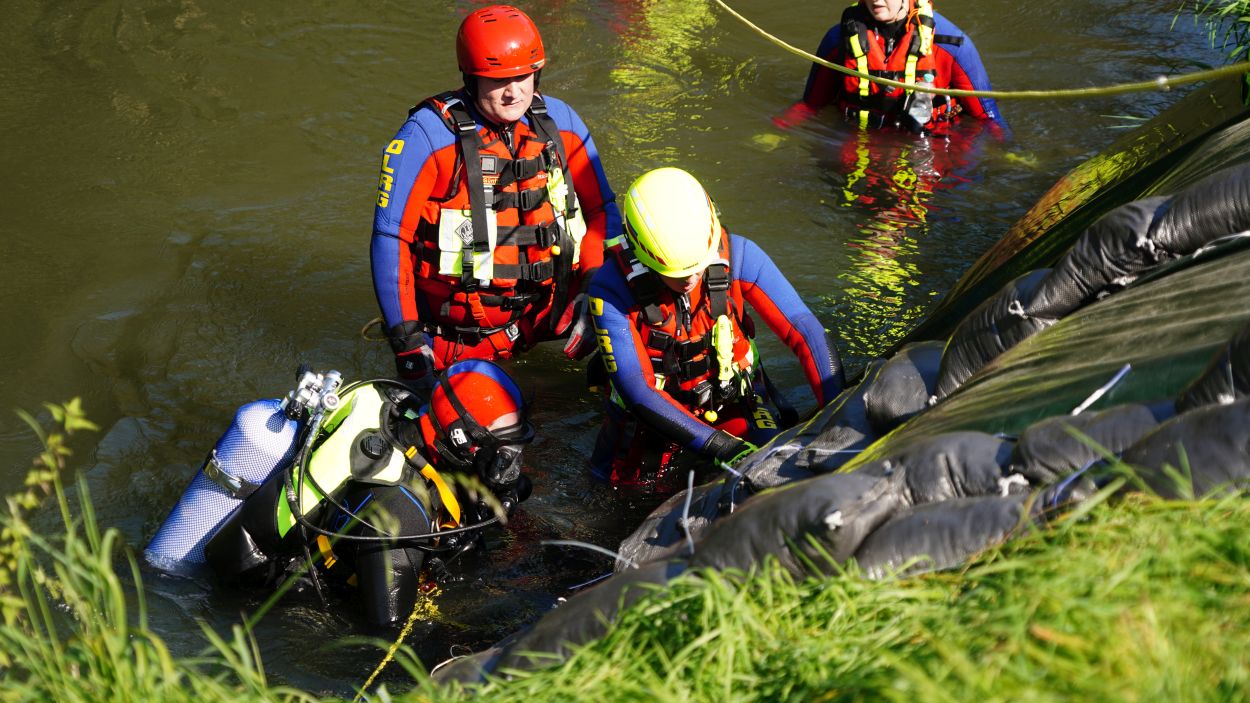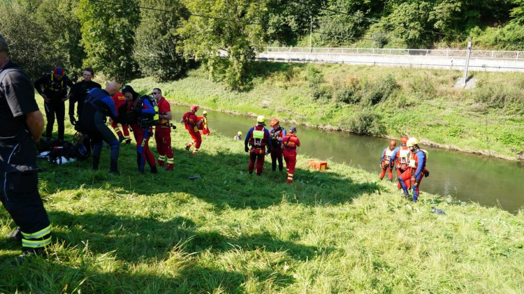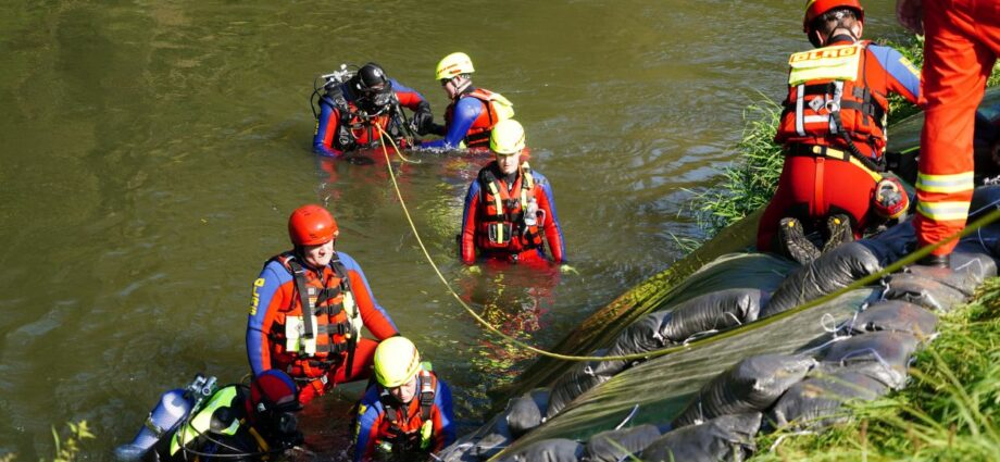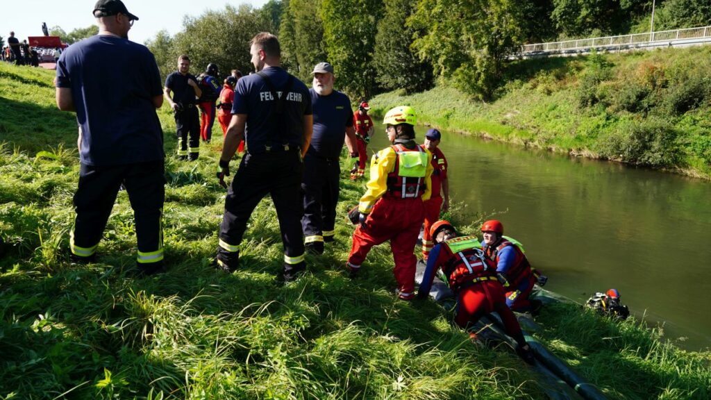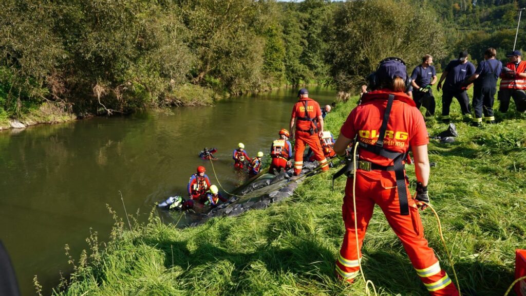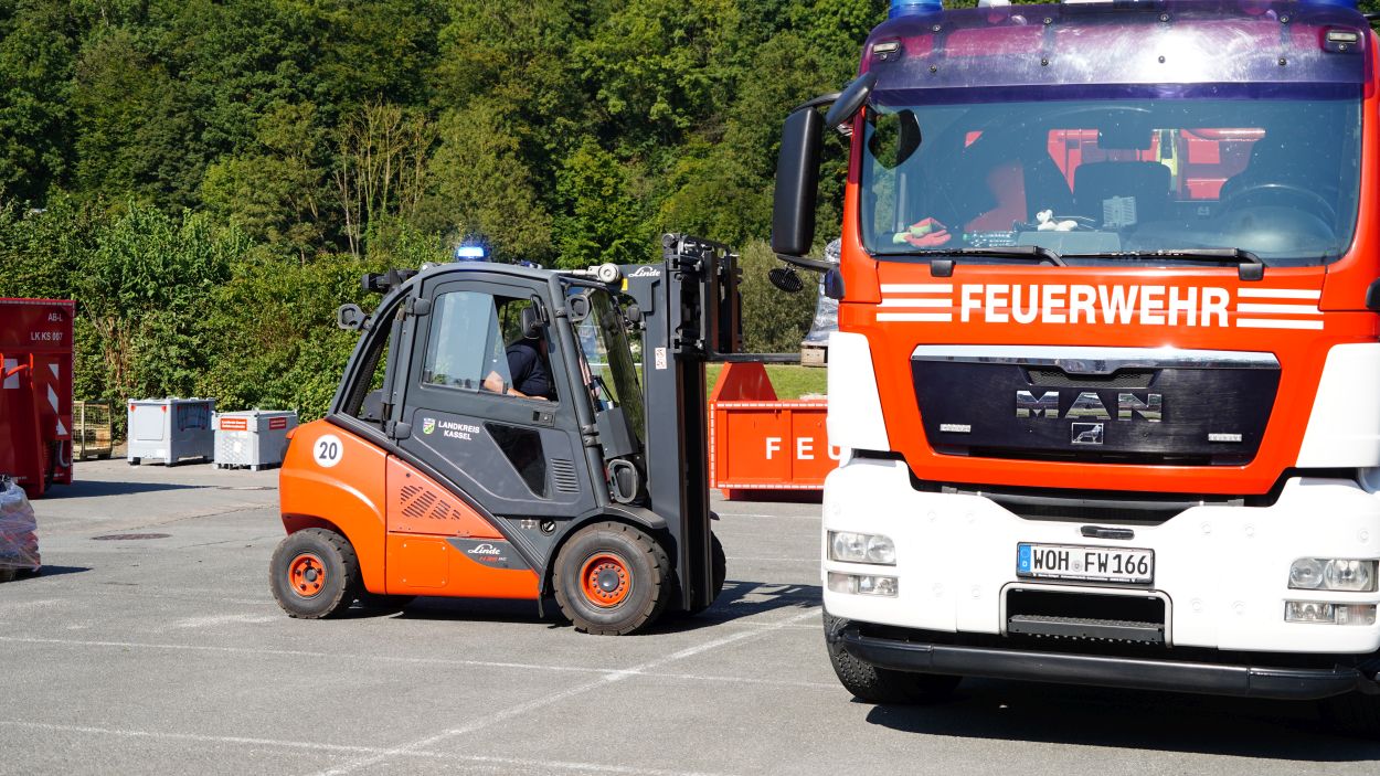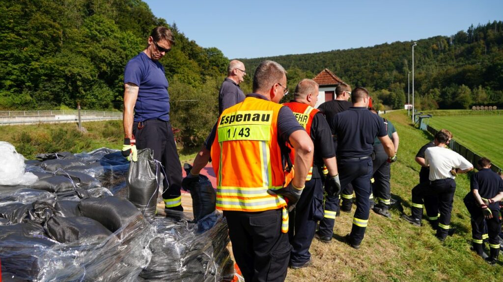 Bad Karlshafen – Am vergangenen Samstag übten 130 Einsatzkräfte anlässlich des zweiten bundesweiten Bevölkerungsschutztags in Helmarshausen. An diesem Tag soll ein besonderes Augenmerk auf den Zivil- und Katastrophenschutz im Landkreis Kassel gerichtet und die Leistungsfähigkeit der Katastrophenschutzeinheiten demonstriert werden. Insgesamt 4 Katastrophenschutz-Löschzüge der Feuerwehren im Landkreis Kassel übten in Stationsausbildung die Deichverteidigung von der Landseite und die Einrichtung und den Betrieb einer zentralen Sandsackfüllstelle sowie der damit verbundenen Logistik. Gleichzeitig waren Taucher und Strömungsretter der DLRG in der Deichsicherung von der Wasserseite aus im Einsatz. Bei der Deichsicherung wurden verschiedene Varianten gezeigt, wie man einen Deich mit Sandsäcken stabilisieren kann. Auch, wenn bereits Löscher entstanden sind. Bei der Sandsackfüllstation kam eine Maschine zu Hilfe, die der Landkreis erst vor Kurzem besorgt hat. Diese ermöglicht, bis zu 2.600 Sandsäcke in einer Stunde zu füllen. Das System ist zwar dennoch sehr Personal kräftig, allerdings leichter und für den Körper nicht so belastender als zuvor. Zudem werden sie vernäht und nicht wie sonst nur verschnürt. Somit sind Sie richtig Dicht und können nicht mehr aufgehen. Die Maschine steht im Katastrophenschutzlager Baunatal und kann bei Bedarf überall hin transportiert werden, wo sie benötigt wird.