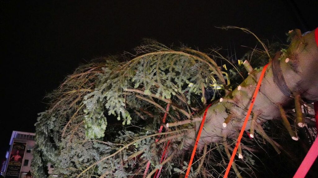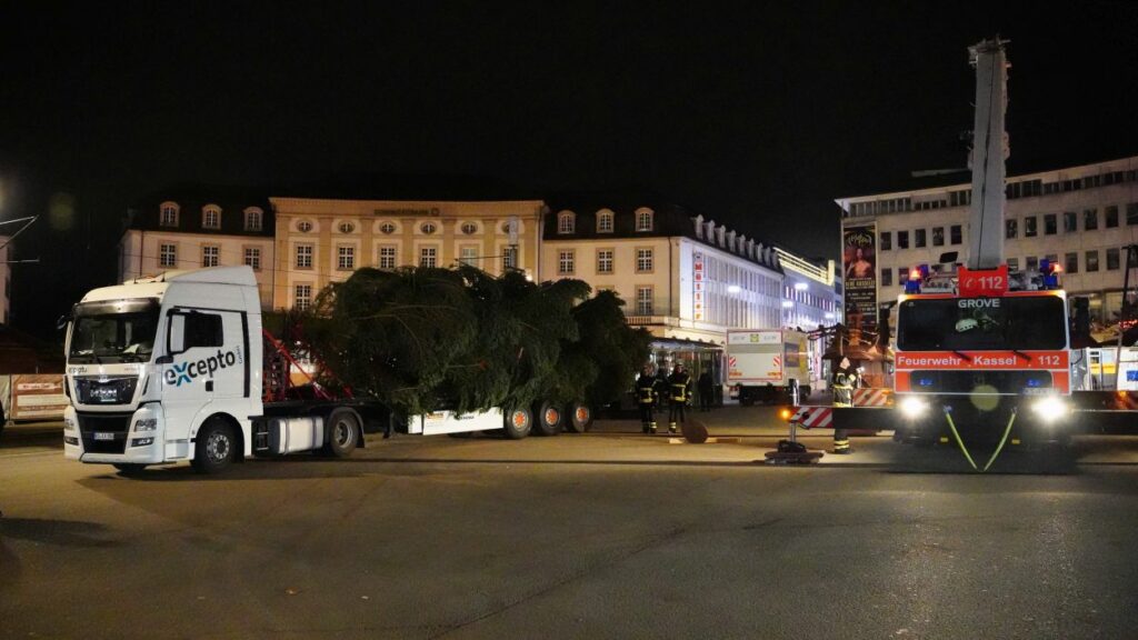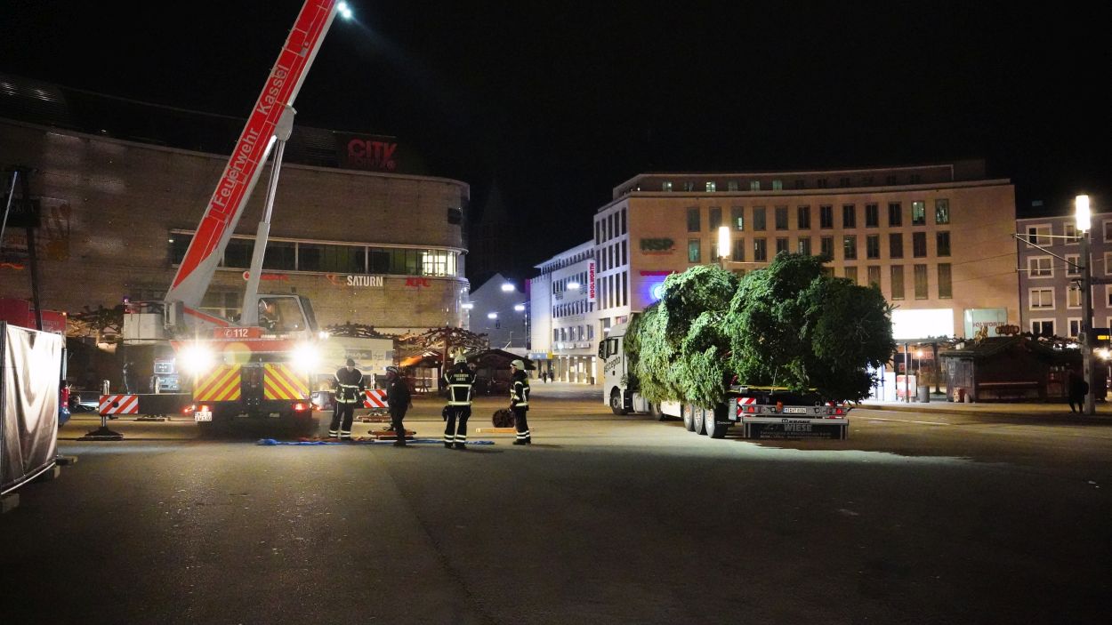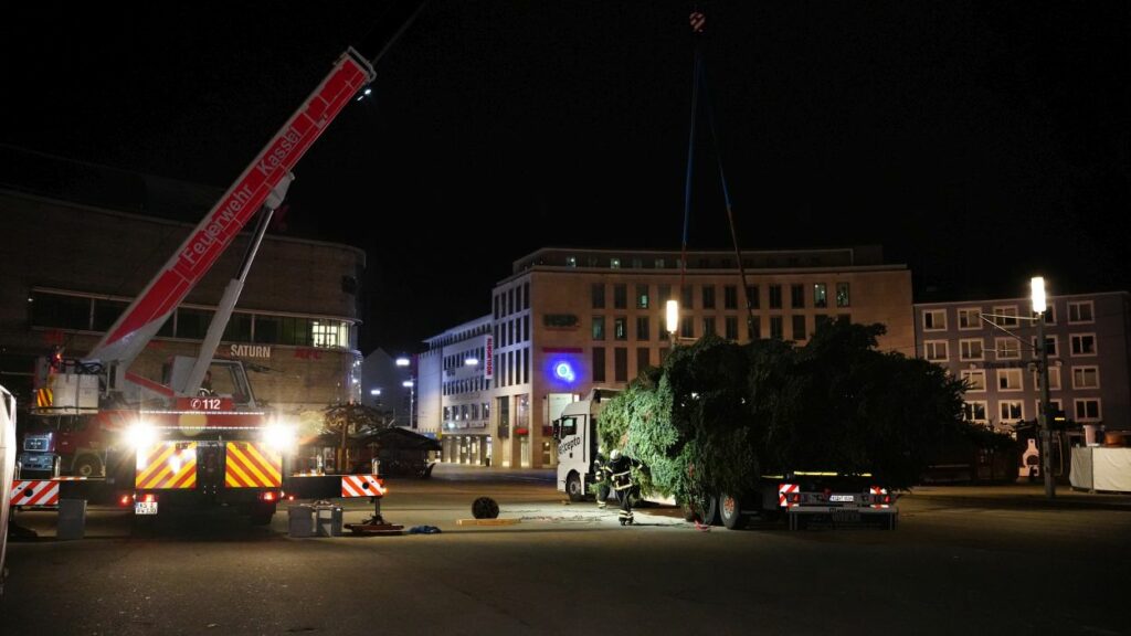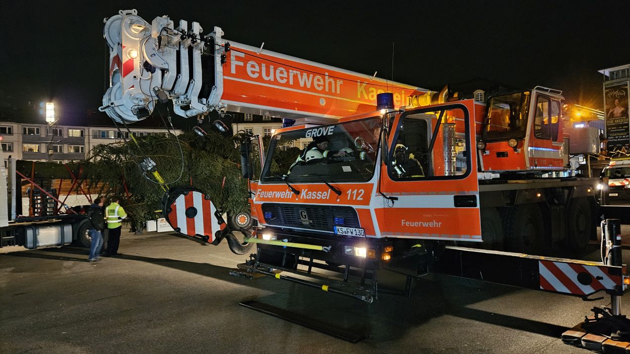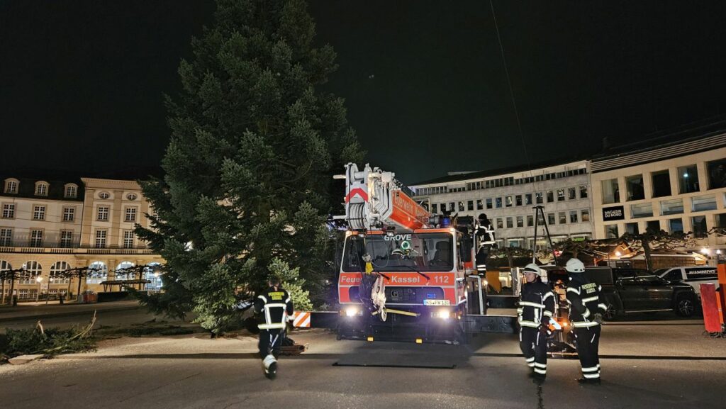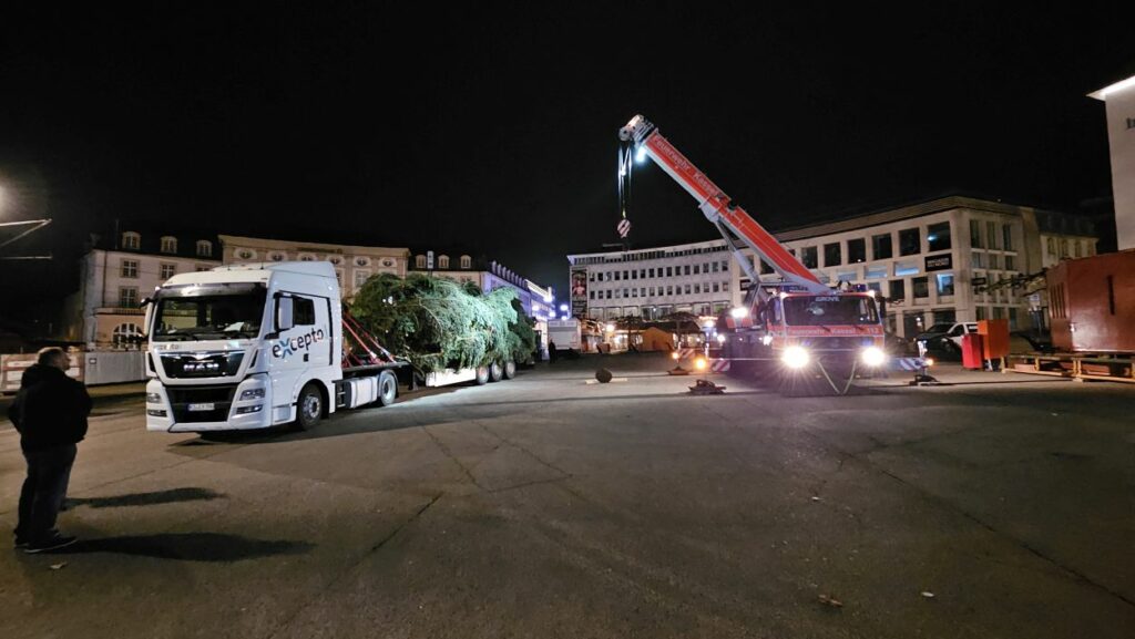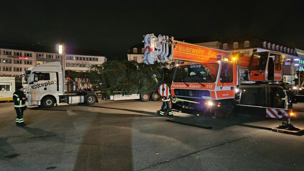 Kassel – Nun ist er auch endlich in Kassel angekommen: Der Kasseler Weihnachtsbaum. Nachdem am Samstag der Weitertransport in Freudenthal bei Borken aufgrund der Überbreite nicht möglich war, musste eine neue Sondergenehmigung her. Diese kam dann kurzfristig am späten Dienstagabend und der Transport konnte um 22 Uhr nach Kassel starten. Kurz vor Mitternacht erreichte der Weihnachtsbaum unbeschadet den Königsplatz, wo die Berufsfeuerwehr mit Kran bereits wartete. Baumpfleger Mark Riechmann ging in den Baum, um die Transportseile zu lösen. Dann wurde der Baum angehoben und vom Tieflader gehoben. Mit der Kettensäge wurde der Stamm angepasst, damit er auch in das Loch im Boden passt. Gegen 2 Uhr hat dann Ludwig-Emil, wie der Baum getauft wurde, seinen Platz gefunden, wo ihn ab dem 25.11 Tausende Menschen auf dem Weihnachtsmarkt bewundern können.