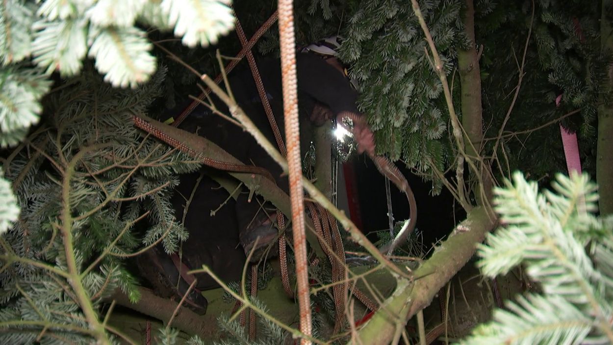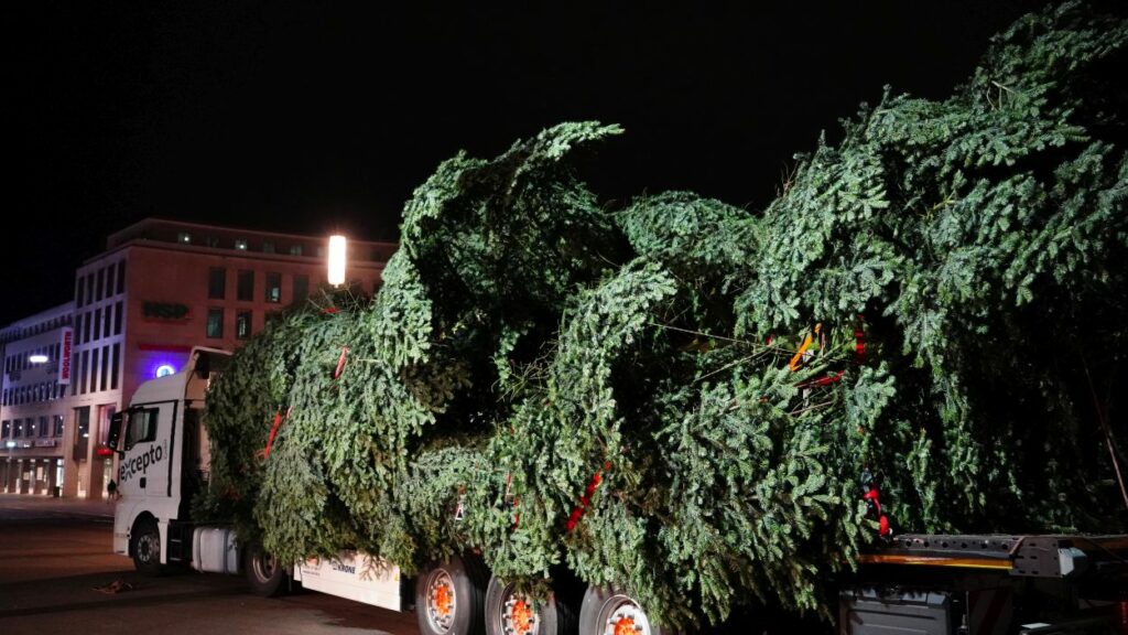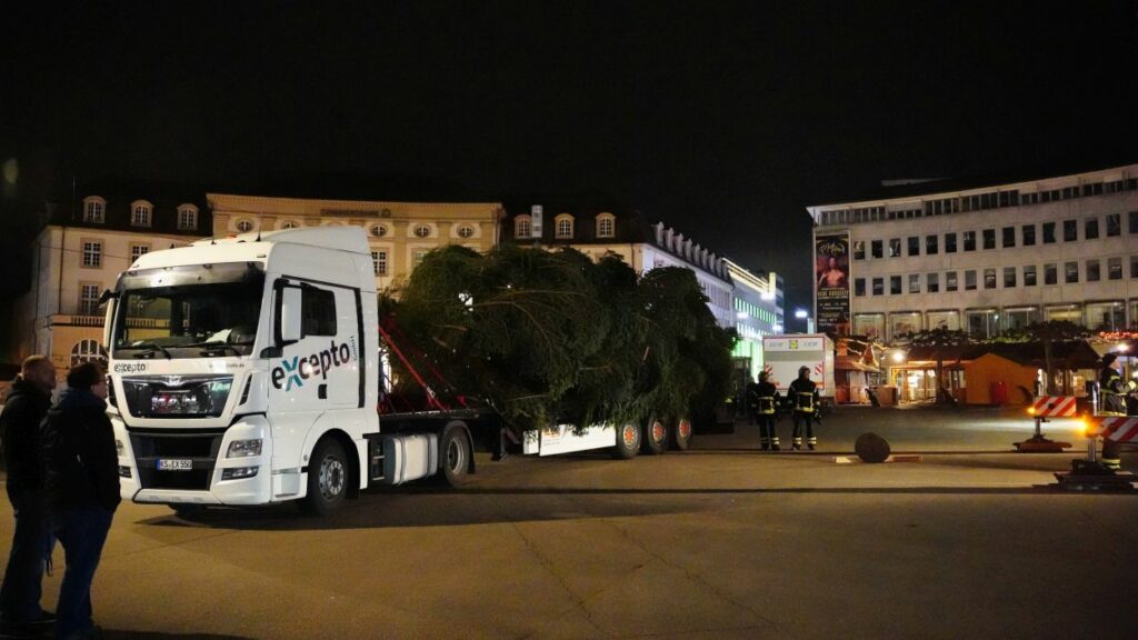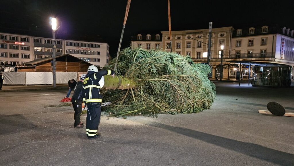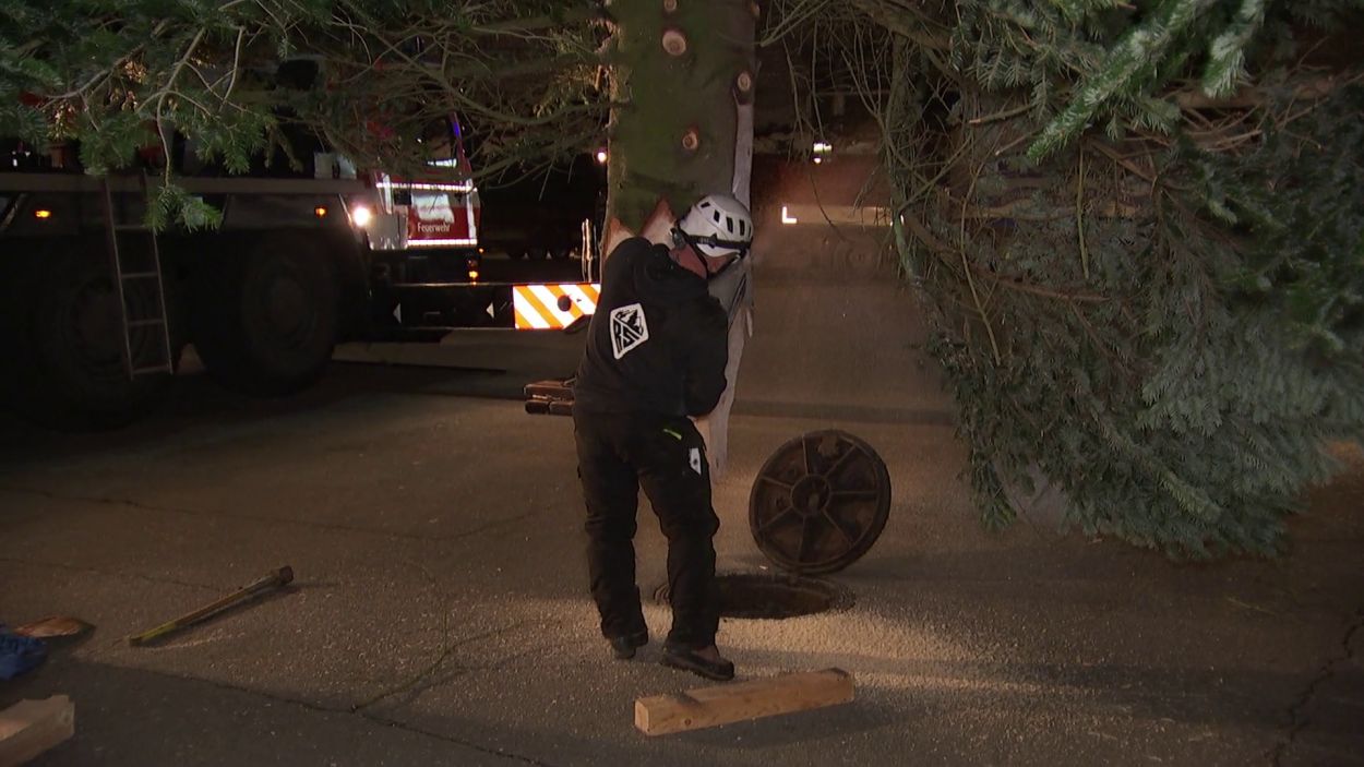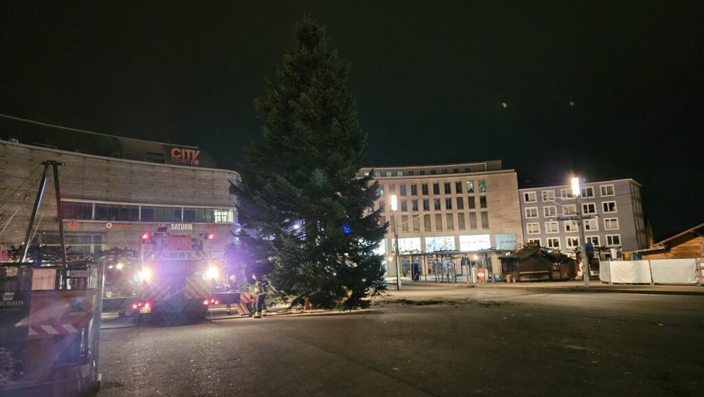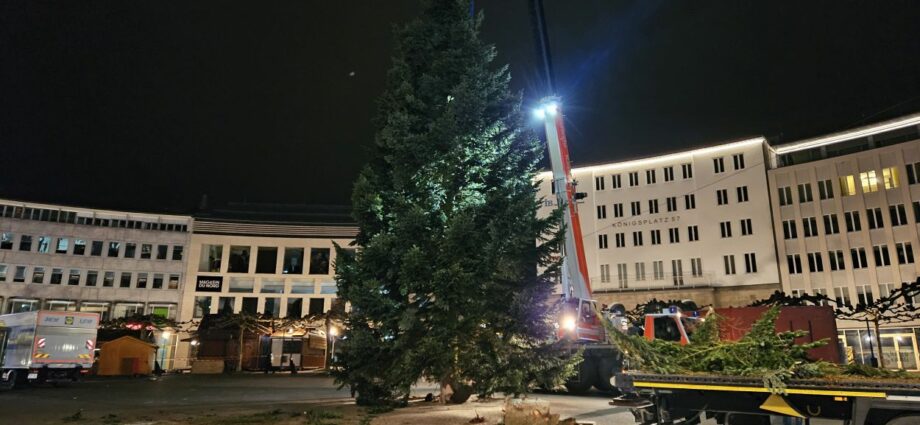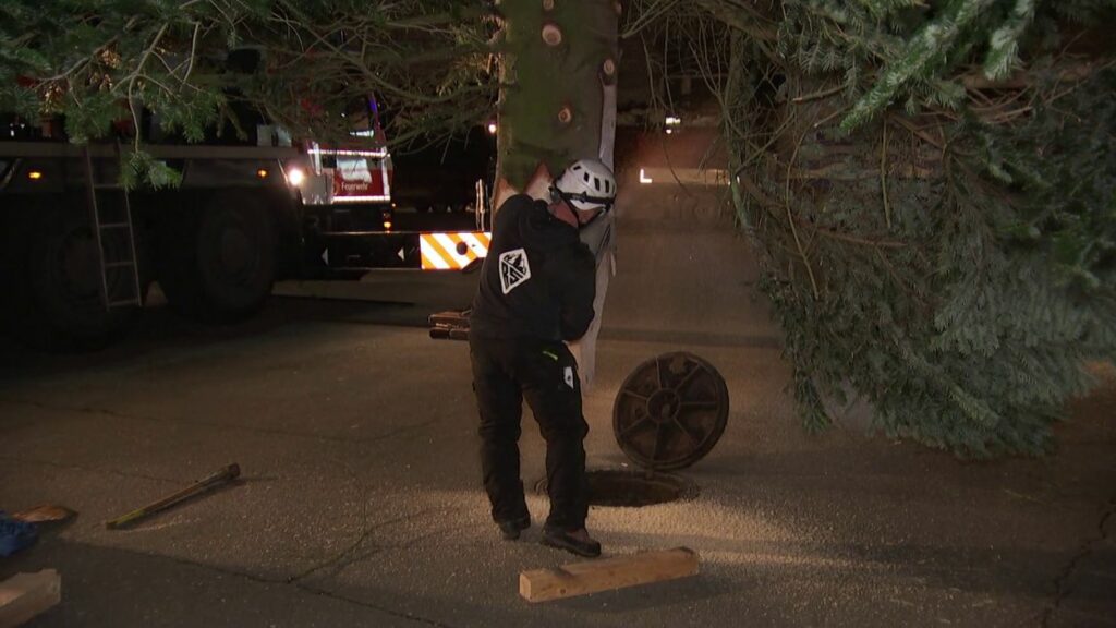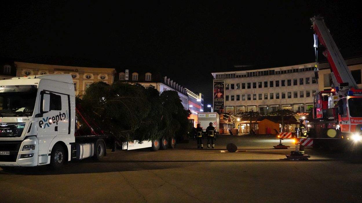 Kassel – Nun ist er auch endlich in Kassel angekommen: Der Kasseler Weihnachtsbaum. Nachdem am Samstag der Weitertransport in Freudenthal bei Borken aufgrund der Überbreite nicht möglich war, musste eine neue Sondergenehmigung her. Diese kam dann kurzfristig am späten Dienstagabend und der Transport konnte um 22 Uhr nach Kassel starten. Kurz vor Mitternacht erreichte der Weihnachtsbaum unbeschadet den Königsplatz, wo die Berufsfeuerwehr mit Kran bereits wartete. Baumpfleger Mark Riechmann ging in den Baum, um die Transportseile zu lösen. Dann wurde der Baum angehoben und vom Tieflader gehoben. Mit der Kettensäge wurde der Stamm angepasst, damit er auch in das Loch im Boden passt. Gegen 2 Uhr hat dann Ludwig-Emil, wie der Baum getauft wurde, seinen Platz gefunden, wo ihn ab dem 25.11 Tausende Menschen auf dem Weihnachtsmarkt bewundern können.