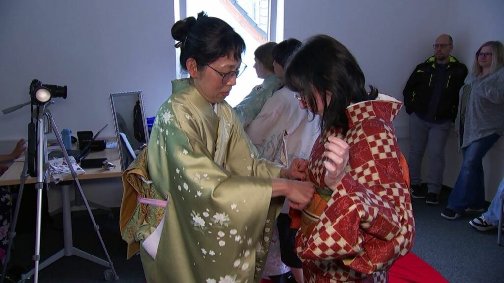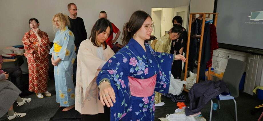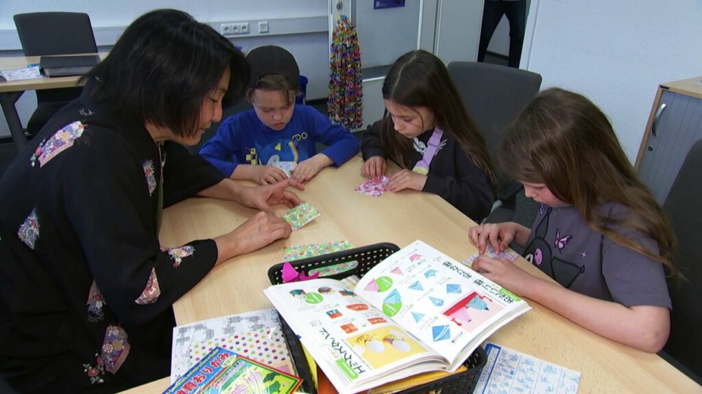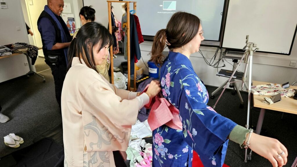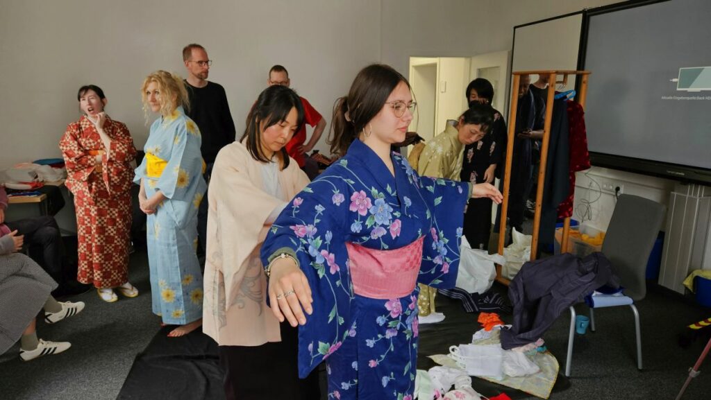 Das Thema des ersten Treffens war „Kimono und Origami“. Der Kimono, ein traditionelles, mehrlagiges Kleidungsstück, das tief mit der japanischen Kultur verbunden ist, kann von den Teilnehmenden direkt anprobiert werden. Der Kimono ist nicht nur ein Kleidungsstück, sondern auch ein Symbol für japanische Ästhetik und Tradition, das besonders bei festlichen Anlässen getragen wird. Die Teilnehmer konnten in die feine Kunst des Origami eintauchen, der japanischen Kunst des Papierfaltens. Origami hat nicht nur eine künstlerische Bedeutung, sondern fördert auch Geduld und Präzision. Neben den praktischen Aktivitäten hatten die Teilnehmenden die Möglichkeit, in einer entspannten Atmosphäre Gespräche mit japanischen Muttersprachlern zu führen und ihre Sprachkenntnisse zu üben. Für die jüngeren Besucher gab es zudem Mitmach-Aktionen, die Spaß und Bildung vereinten.