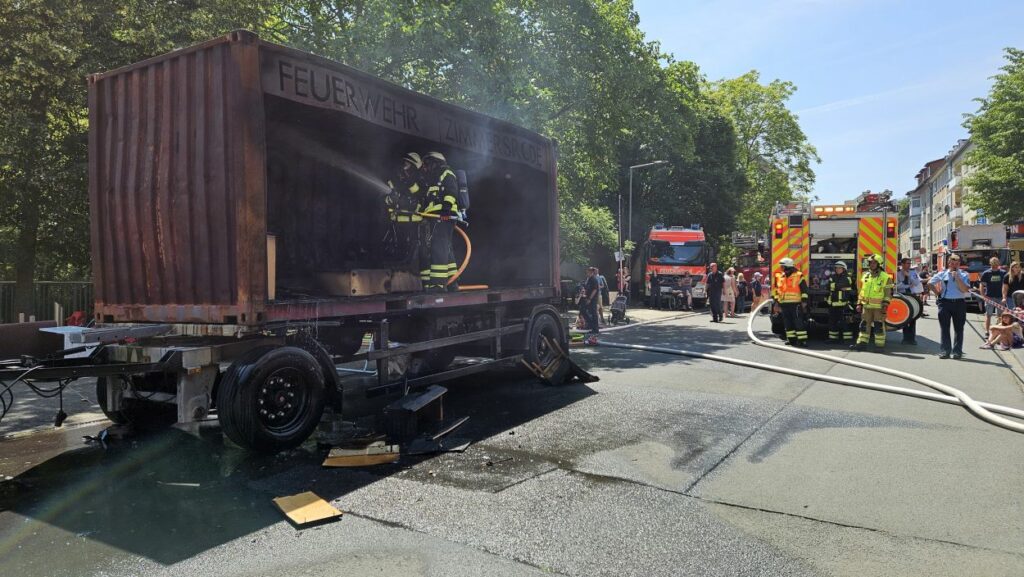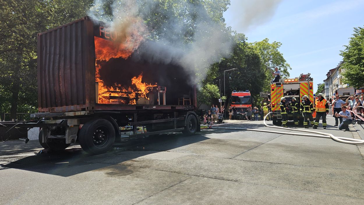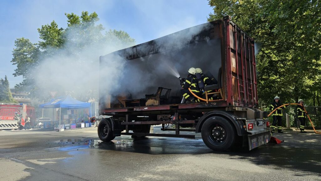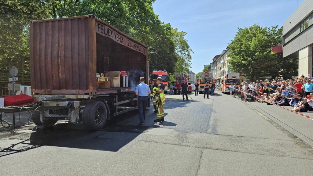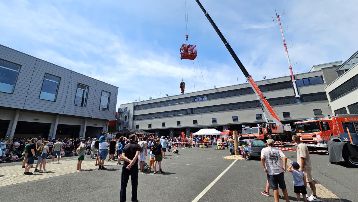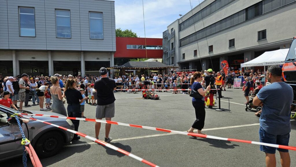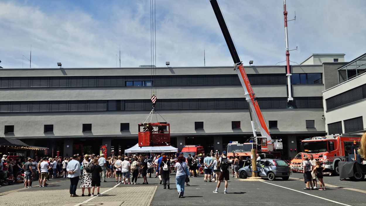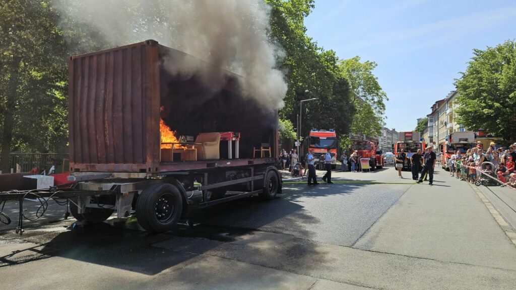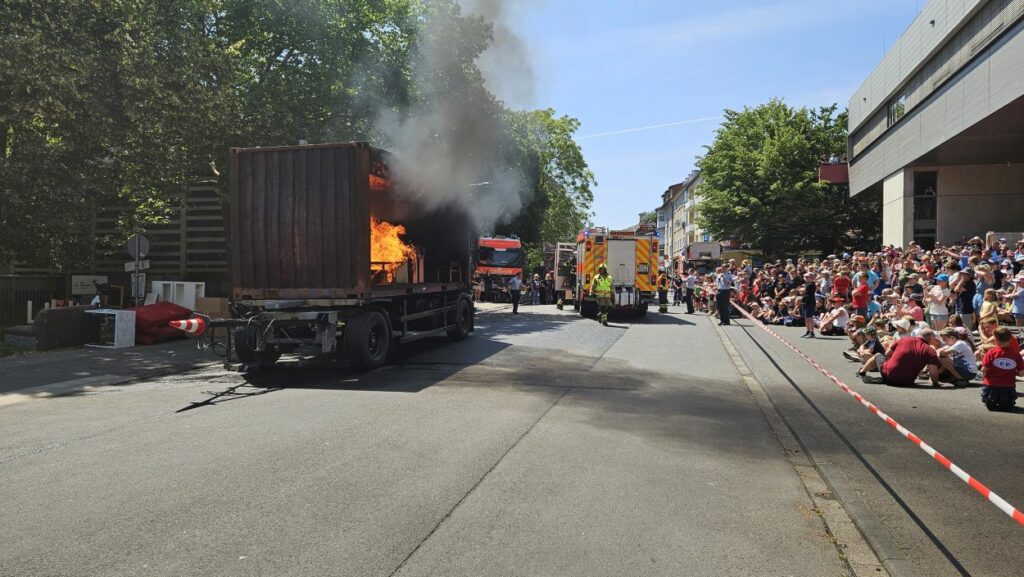 Im Mittelpunkt der Veranstaltung standen verschiedene Vorführungen und Präsentationen. So wurde in einer Einsatzübung ein Zimmerbrand simuliert, der von den Feuerwehrkräften professionell gelöscht wurde. Bei über 30 Grad Außentemperatur sorgte zusätzlich die enorme Hitzeentwicklung am Einsatzort für extreme Bedingungen – nicht nur für die Einsatzkräfte, sondern auch für die Zuschauer, die die Hitze hautnah miterlebten. Auch die Höhenretter zeigten ihr Können in luftiger Höhe, während sich die Taucher bei einem Einsatz unter Wasser präsentierten. Der umfangreiche Fuhrpark der Feuerwehr konnte ebenfalls aus nächster Nähe inspiziert werden.