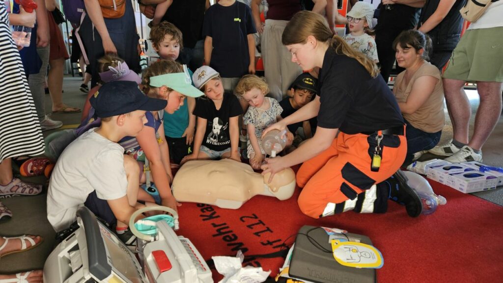 Zusätzlich informierte die Feuerwehr über wichtige Verhaltensweisen in Gefahrensituationen und bot ein Reanimationstraining an, bei dem die Besucherinnen und Besucher lebensrettende Erste-Hilfe-Maßnahmen üben konnten. Auch ein moderner Rettungswagen stand zur Besichtigung bereit.