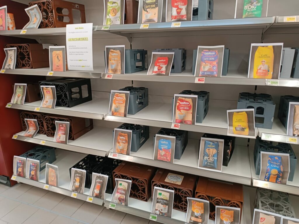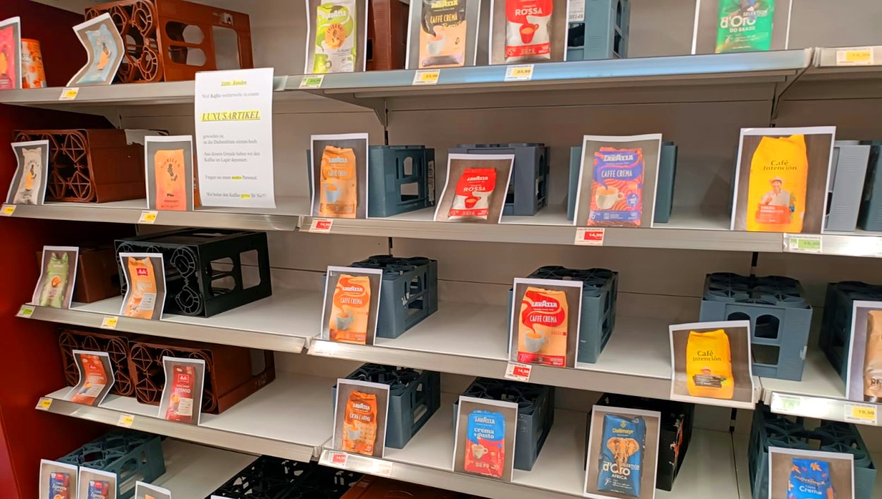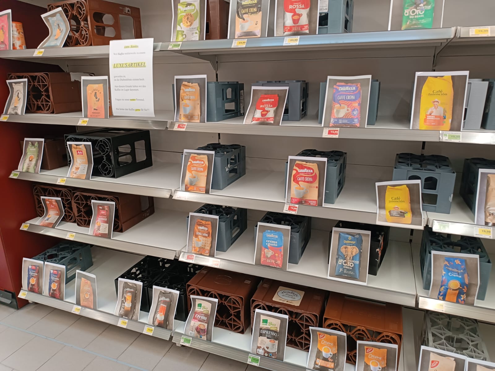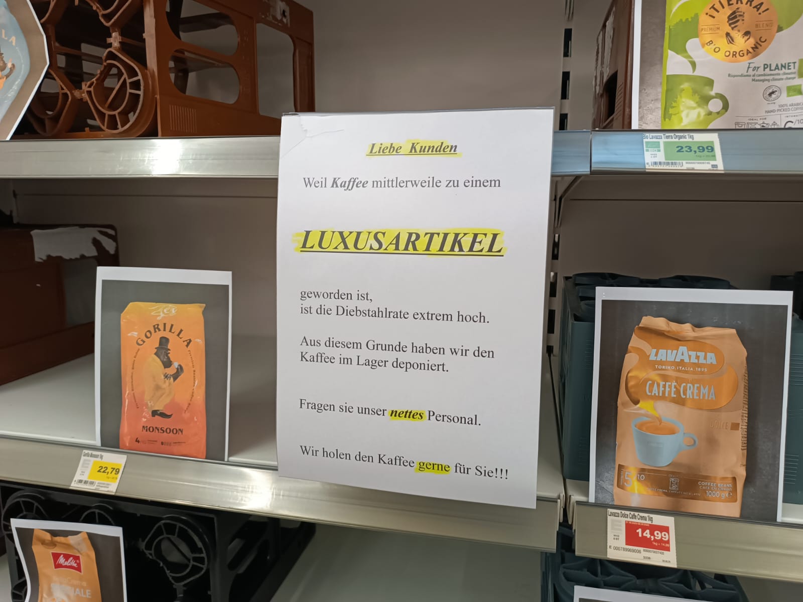 „Liebe Kunden, weil Kaffee mittlerweile zu einem Luxusartikel geworden ist, ist die Diebstahlrate extrem hoch. Aus diesem Grund haben wir den Kaffee im Lager deponiert. Fragen sie unser nettes Personal, Wir holen den Kaffee gerne für Sie“