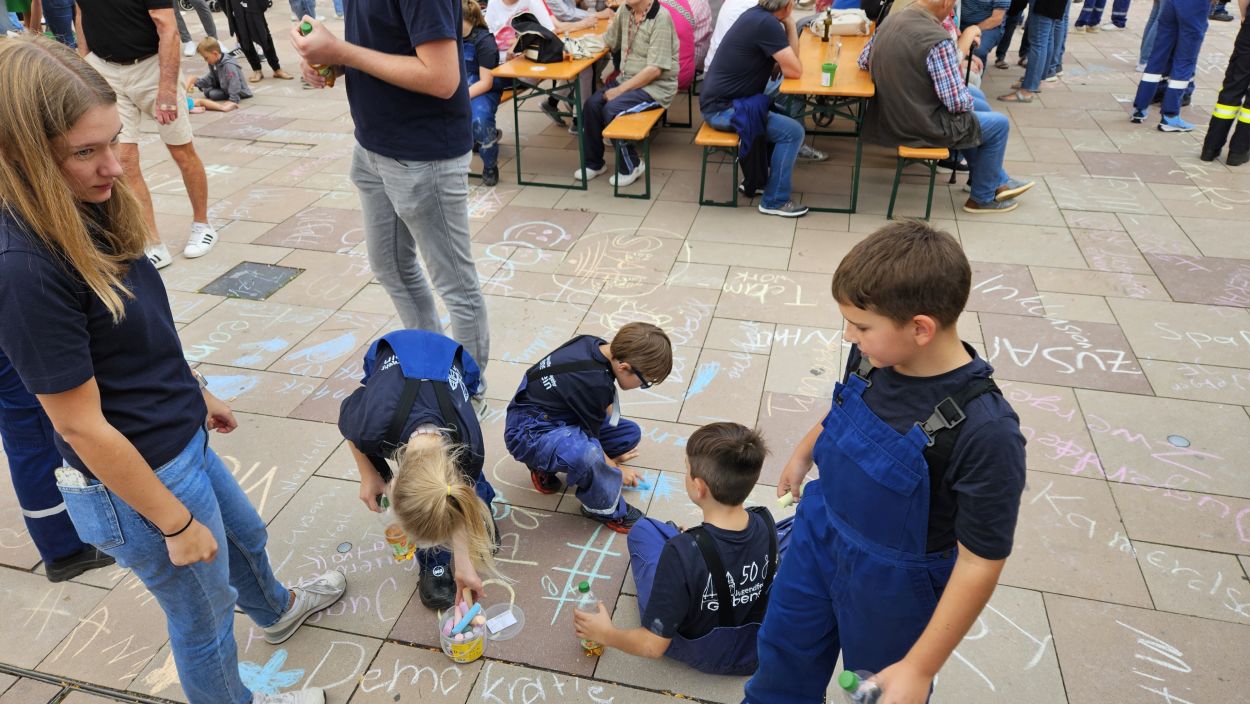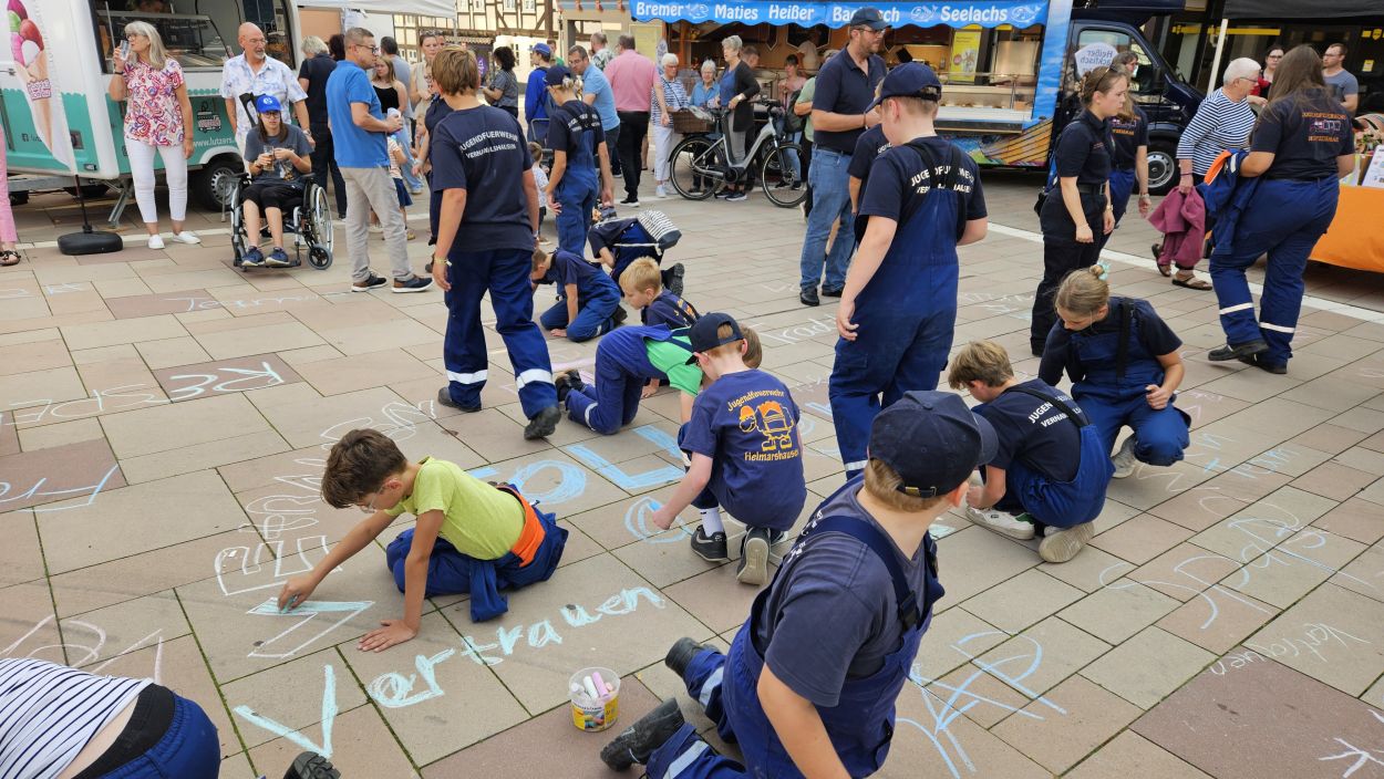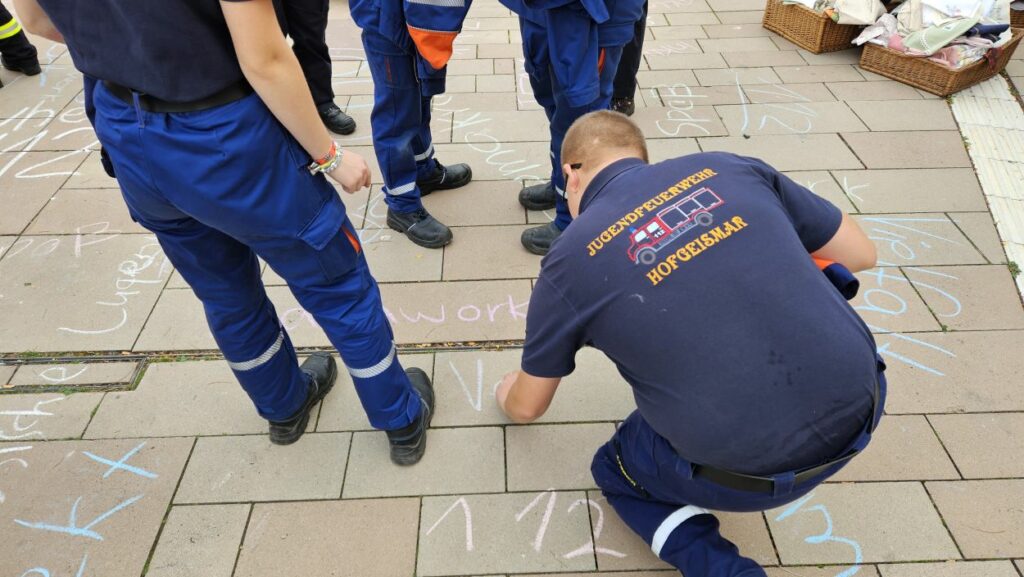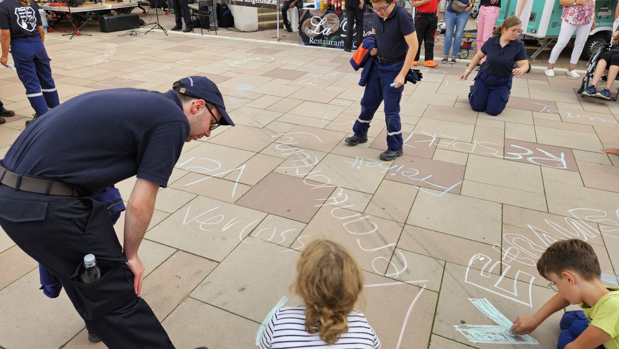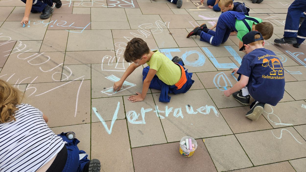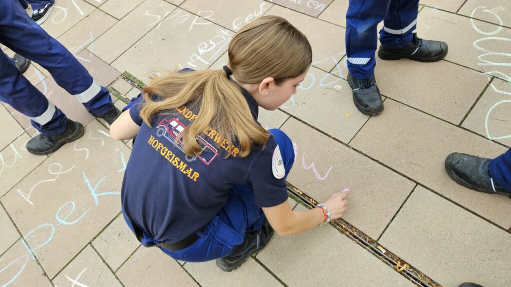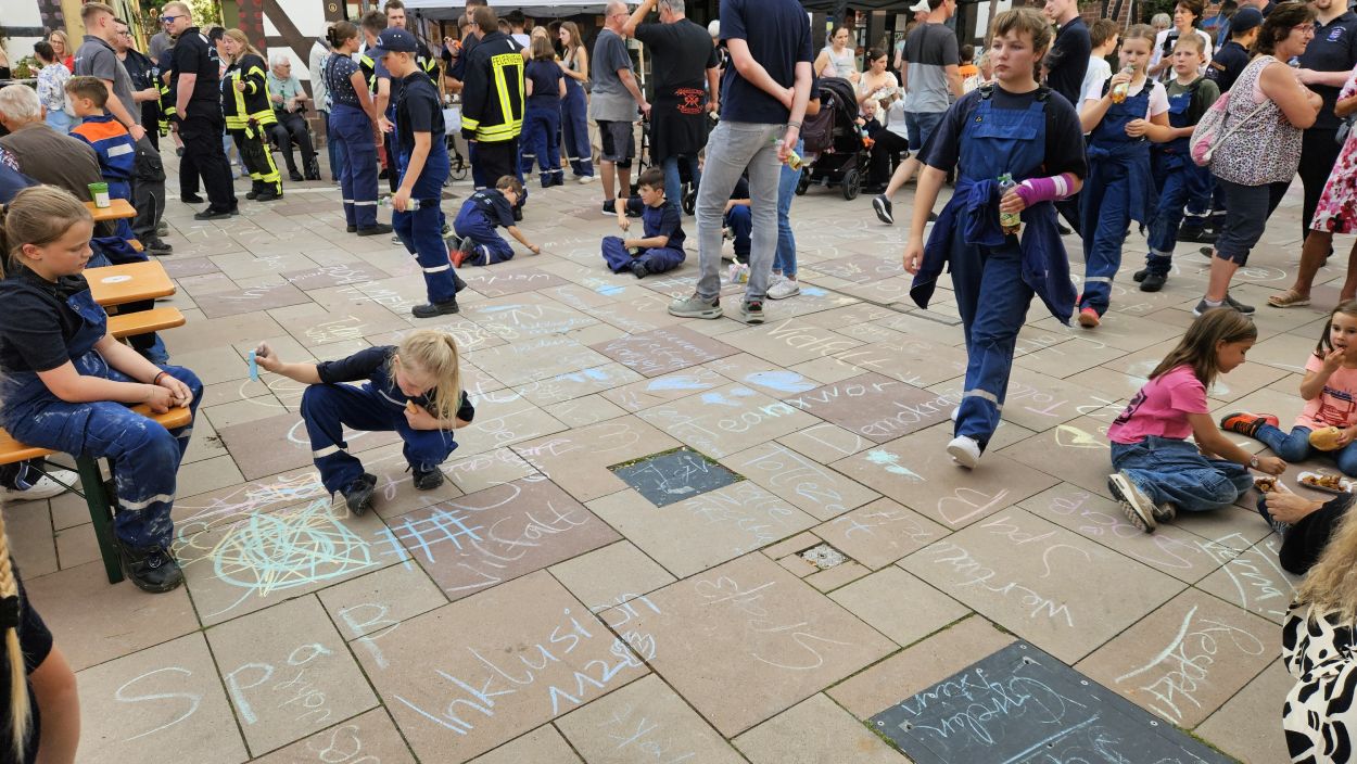 Mit Straßenmalkreide schrieben die jungen und erwachsenen Feuerwehrleute Begriffe wie „Toleranz“, „Demokratie“ und „Hilfsbereitschaft“ auf den Boden.