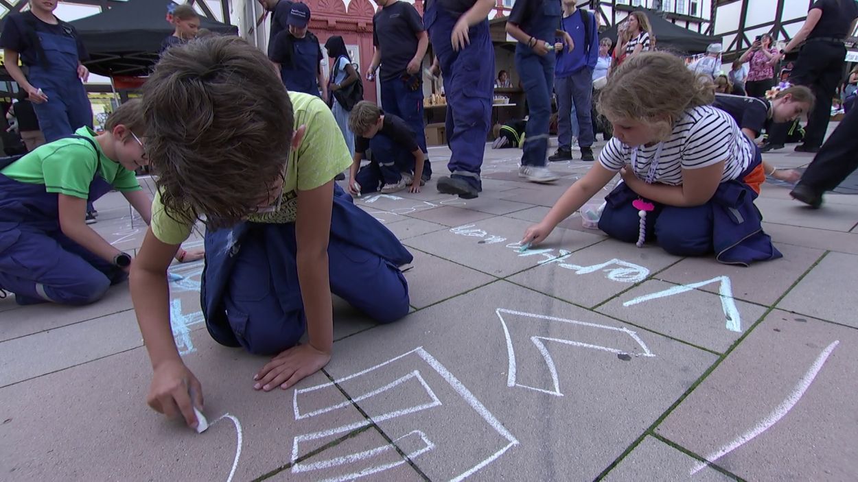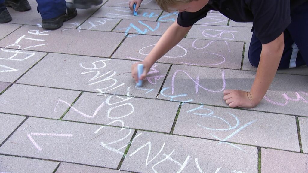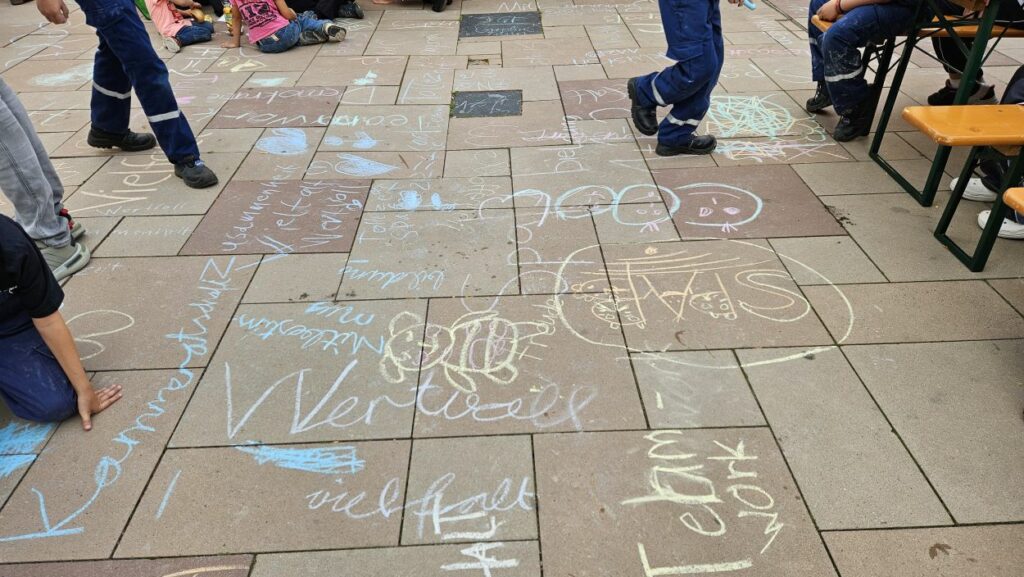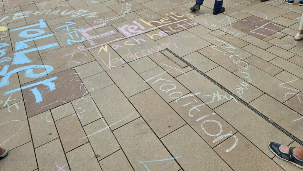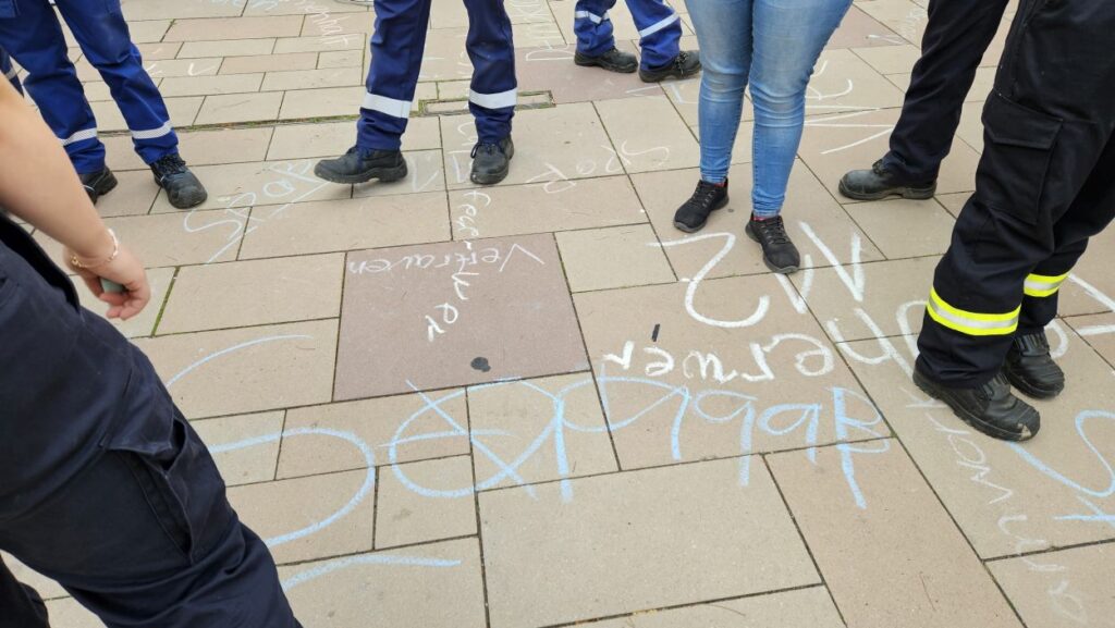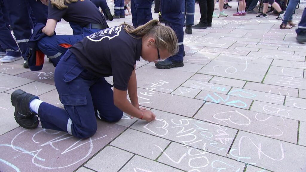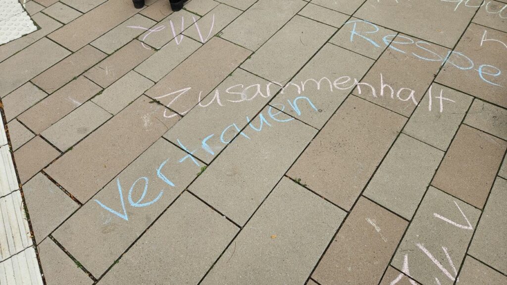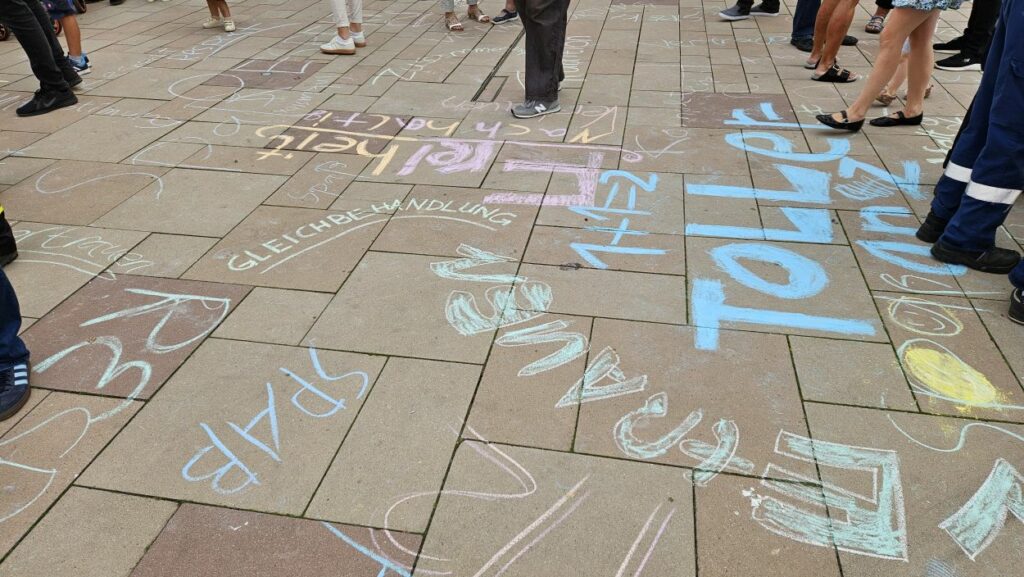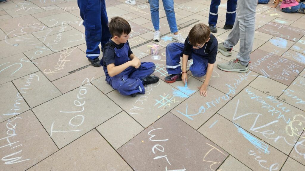 Mit Straßenmalkreide schrieben die jungen und erwachsenen Feuerwehrleute Begriffe wie „Toleranz“, „Demokratie“ und „Hilfsbereitschaft“ auf den Boden.