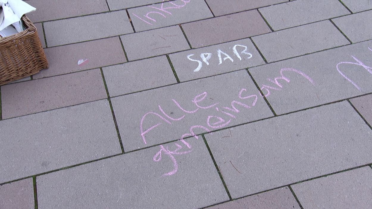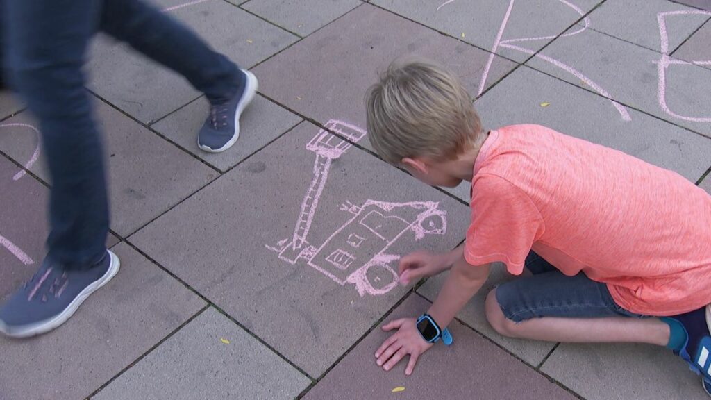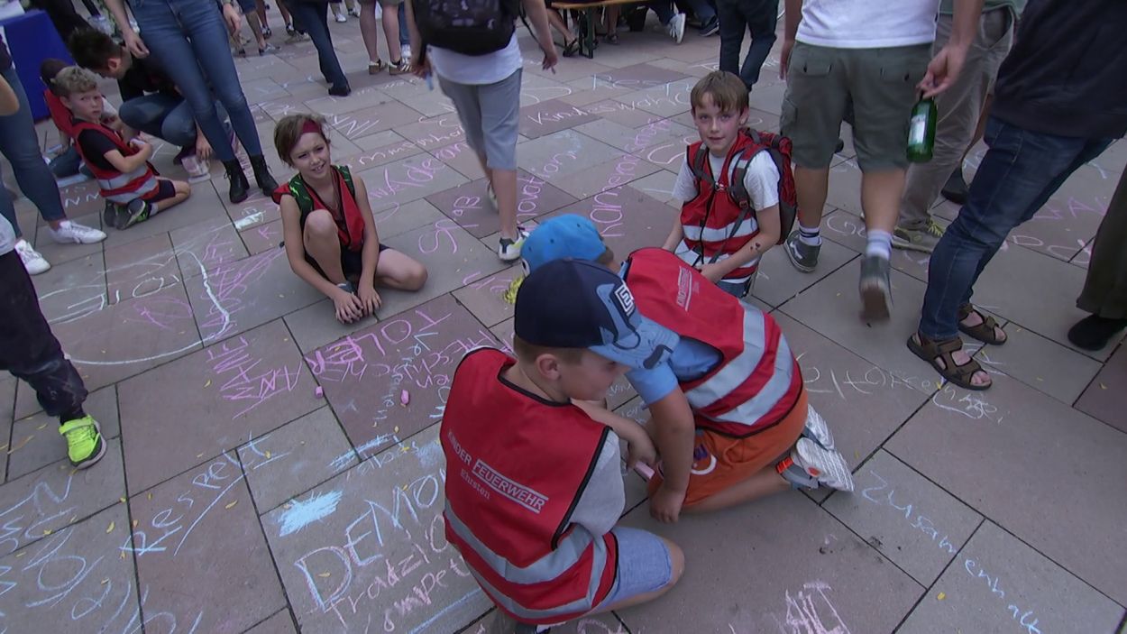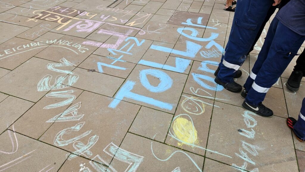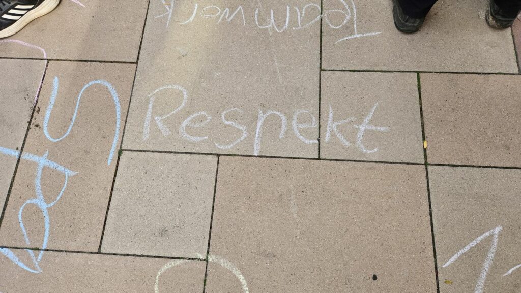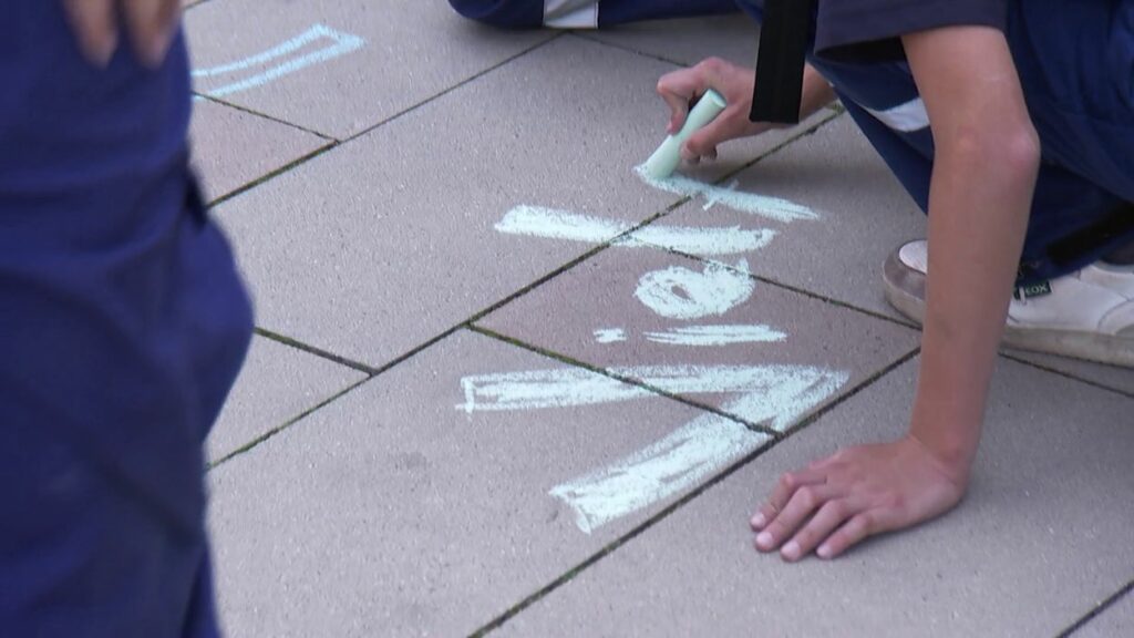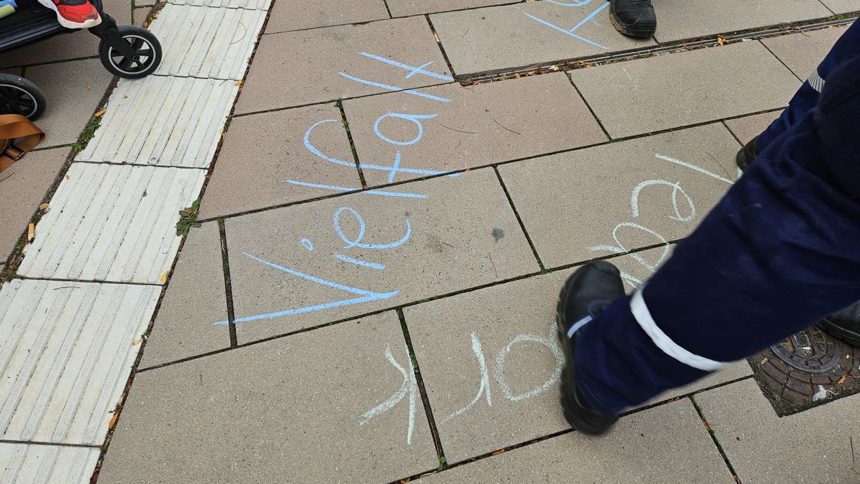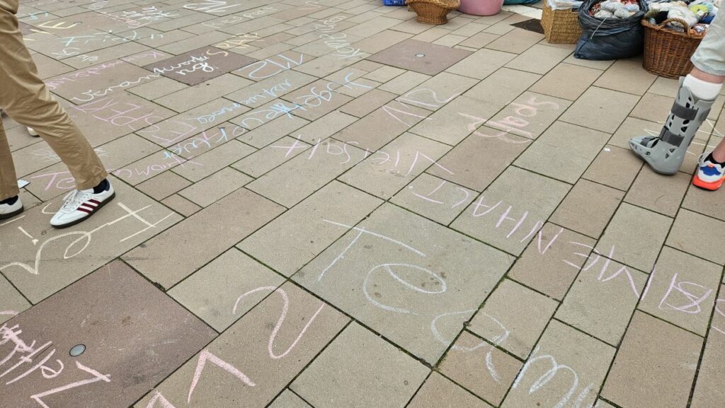 Mit Straßenmalkreide schrieben die jungen und erwachsenen Feuerwehrleute Begriffe wie „Toleranz“, „Demokratie“ und „Hilfsbereitschaft“ auf den Boden.