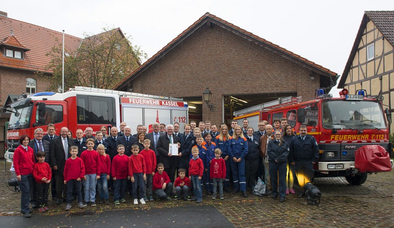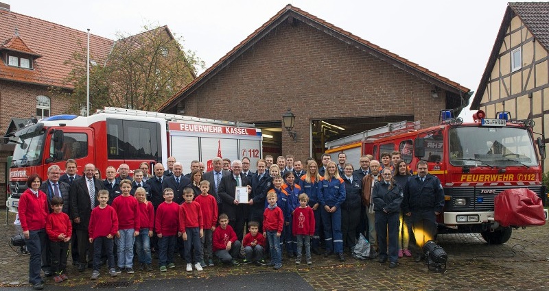 Kassel – Der ungeahnte Erfolg ihrer Öffentlichkeitsarbeit anlässlich der Indienststellung des neuen Löschgruppenfahrzeugs hat die Mitglieder der Freiwilligen Feuerwehr Nordshausen/Brasselsberg bereits mit Stolz erfüllt. Nun erhielten sie auch eine offizielle Bestätigung ihrer guten Arbeit: Das Hessische Innenministerium zeichnete die Freiwillige Feuerwehr in dem Kasseler Stadtteil als „Feuerwehr des Monats September 2017“ aus. Die mit 500 Euro dotierte Auszeichnung übergab Staatssekretär Werner Koch am Mittwochnachmittag am Feuerwehrhaus in Nordshausen. „Die Kameradinnen und Kameraden haben mit ihrer kreativen Fahrzeugeinweihung den besonderen Fahrzeugwert unterstrichen und ihre Freude über die vom Land mit 72.000 Euro bezuschusste Fahrzeuganschaffung zum Ausdruck gebracht.