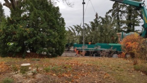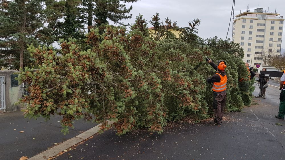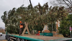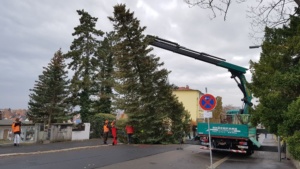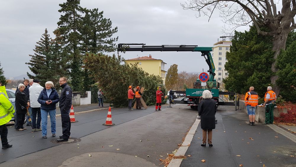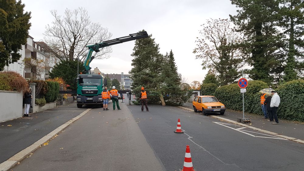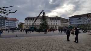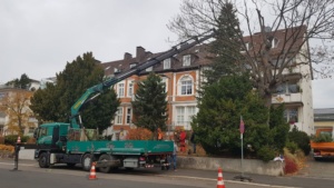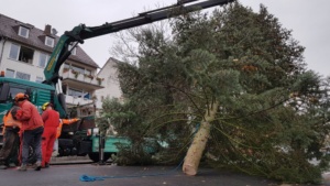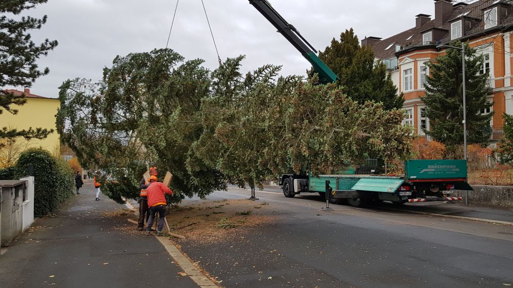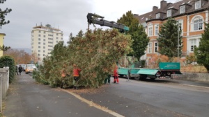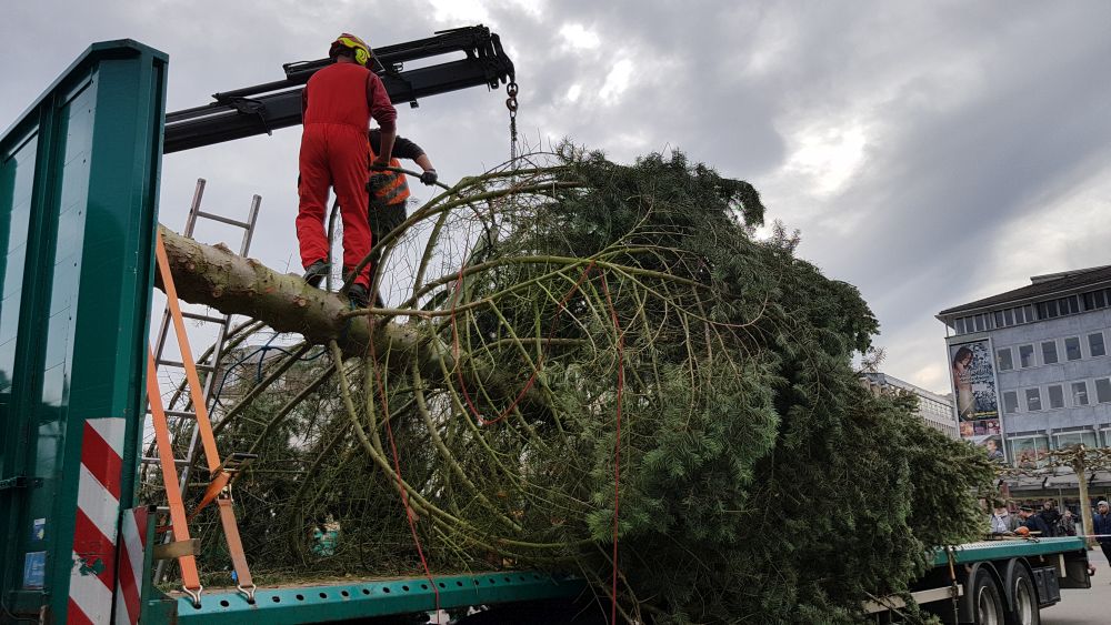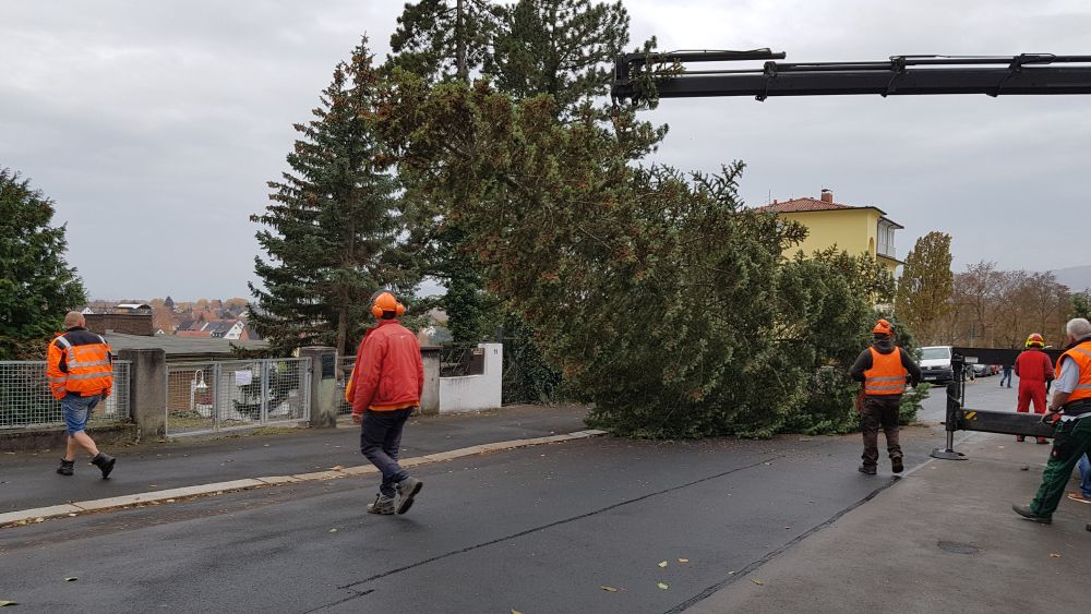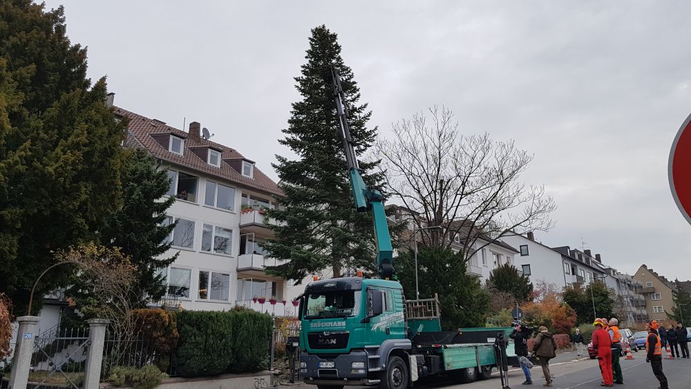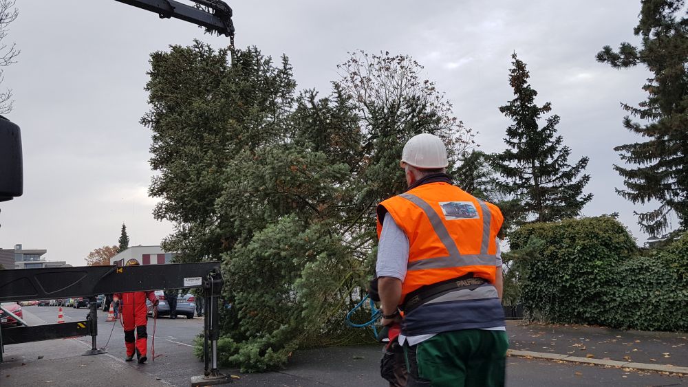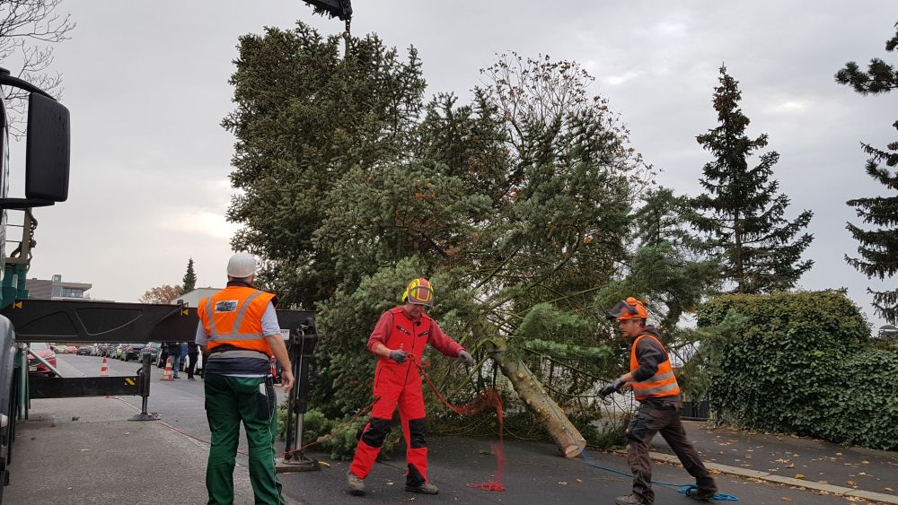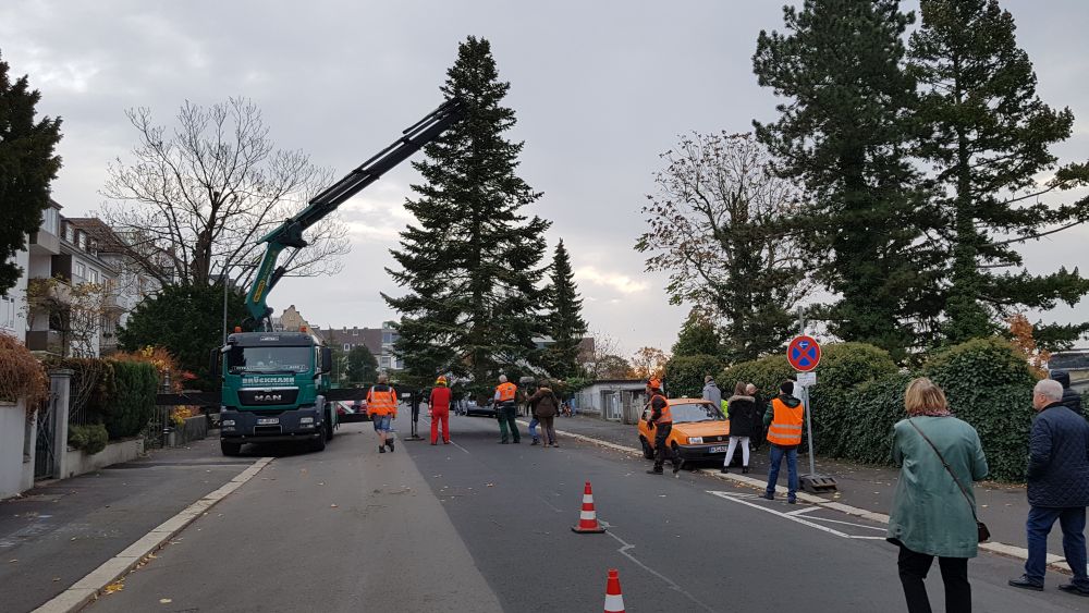 Karin Witt die Eigentümerin ist mit dem Baum groß geworden. Ihre Eltern hatten vor vielen Jahren versucht einen Weihnachtsbaum zu pflanzen, was jedoch nicht gelungen war. Ein Gärtner wurde dann beauftragt den Tannenbaum an der richtigen Stelle auszubringen. Ein schönes Erlebnis, denn jedes Jahr wurde der Baum geschmückt und hat für viel Freude in der Familie gesorgt. Im Laufe der Jahre wurde die Tanne immer größer und sorgte bei starken Wind eher für Angst als gute Laune. Im Hinblick darauf habe man sich dann entschieden den Baum fällen zu lassen. Die Entscheidung dass er jetzt diesen Weg gehen wird ist für die Eigentümerin akzeptabel. Mit einer Besonderheit unterscheidet sich diese Tanne von den Bäumen aus den vergangenen Jahren, denn in der Regel werden Nordmanntannen verwendet und dieses Jahr handelt es sich um eine Küstentanne die Ihren Ursprung in Nordamerika hat. Heute ist nun der Tag gekommen, an dem der Tannenbaum zum letzten mal seinen Platz als Schattenspender am Weinberg einnehmen wird. Zunächst musste der tonnenschwere Koloss nach oben hin gesichert werden, er darf nicht umfallen, denn sonst würden die Äste brechen. Danach wurde er im unteren Bereich gezielt abgeschnitten und nach wenigen Minuten hing er auch schon in der Luft. Als Nächstes stand nun das sorgfältige Ablegen und die Sicherung für den Transport auf einem Tieflader auf dem Plan. Nachdem die Tanne transportfähig war, ging die kurze Reise vom Weinberg zum Königsplatz los. Dort angekommen musste er zunächst wieder entsichert und vorsichtig in eine hängende Seitenlage gebracht werden. Mit viel Geduld brachten die Arbeiter dem Baum in die richtige Position, um ihn dann mit dem Kran langsam aber sicher aufzustellen. Nun muss er lediglich noch fest verankert werden und dann ist der Umzug vom Weinberg zu Königsplatz abgeschlossen. Ab Montag wird der Baum geschmückt um dann ab dem 26.11.2018 im vollen Licht zu erstrahlen.