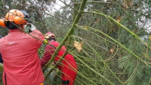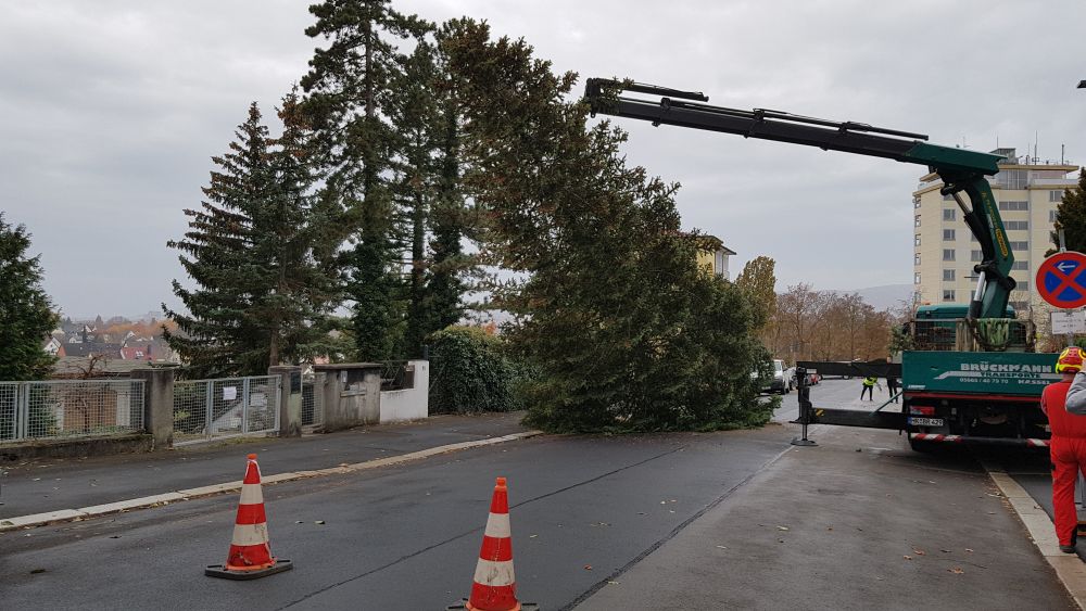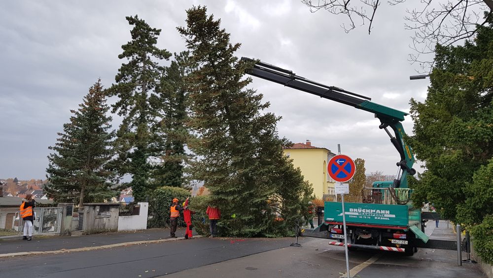 Kassel – Am Samstagvormittag war es wieder einmal soweit. Ein neuer Weihnachtbaum für den Kassler Weihnachtsmarkt musste gefällt werden. Diesmal kommt er von Karin Witt, ein Baum der Sie fast ein ganzes Leben lang begleitet hat. Rund 62 Jahre lang stand der heute rund 18 Meter hohe Baum vor dem Elternhaus am Weinberg in Kassel. Wie jedes Jahr gab es wieder einige Bäume die in der engen Auswahl standen. Viele sind geeignet, jedoch muss der Baum nicht nur schön aussehen, sondern es muss auch ein reibungsloser Abtransport gewährleistet sein.