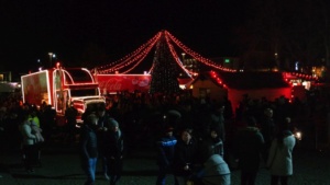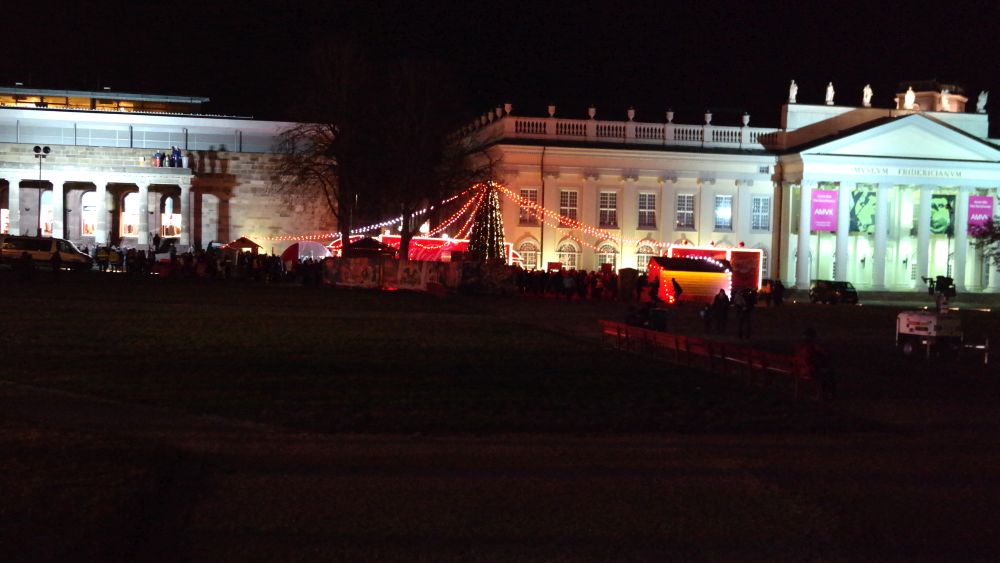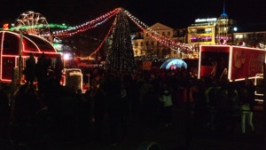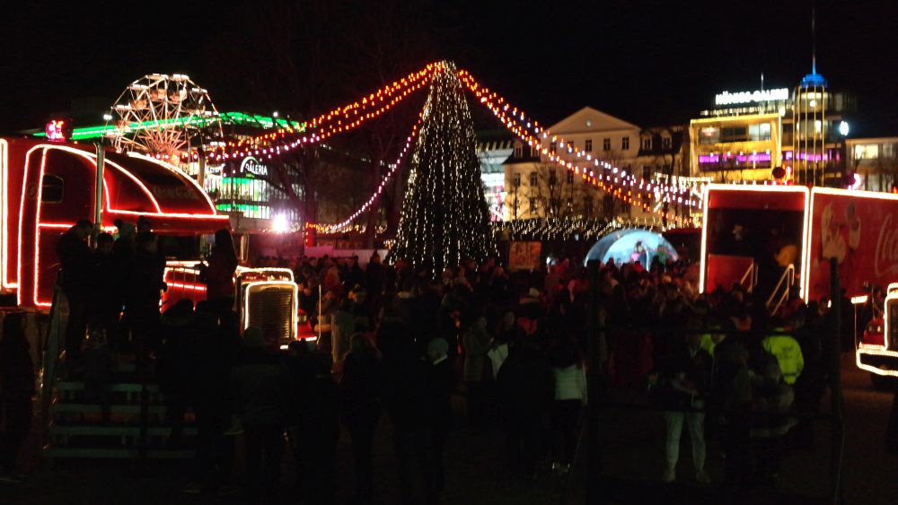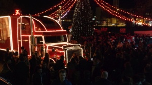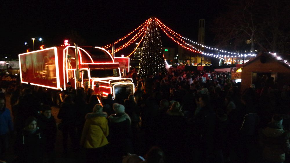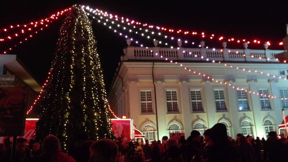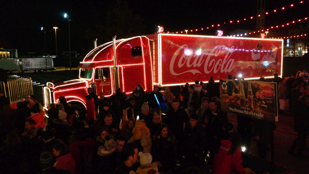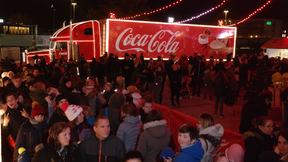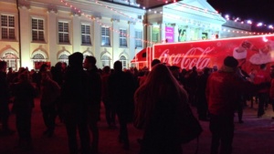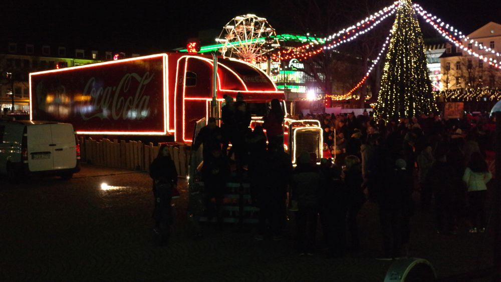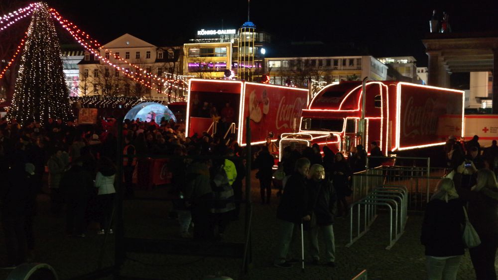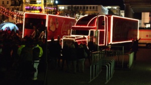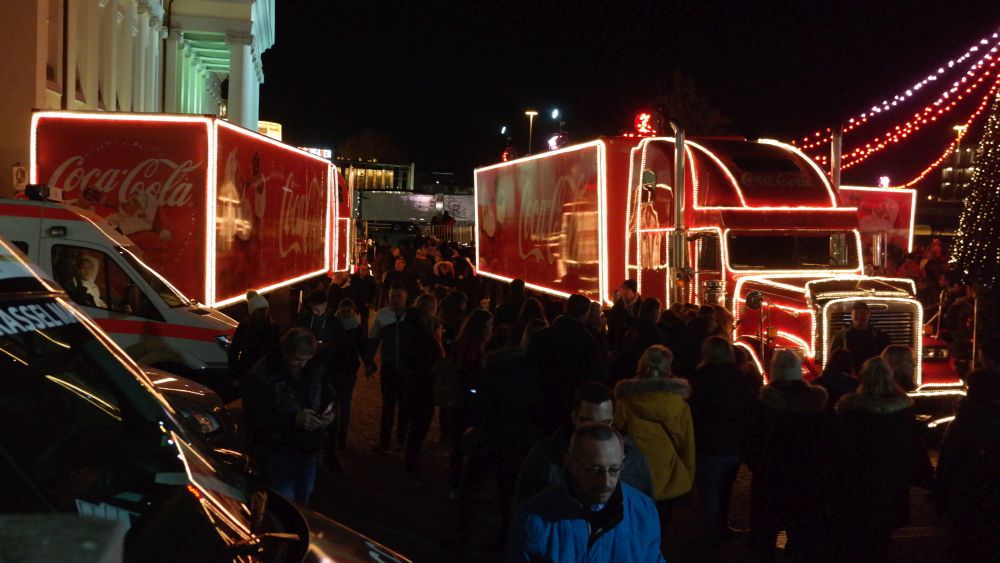 Kassel – Auf dem Kasseler Weihnachtsmarkt gab es Freitag eine weitere Attraktion. Drei Coca Cola Weihnachtstrucks machten Station auf dem Friedrichsplatz. Viele tolle Dinge hatten sich die Veranstalter einfallen lassen. Coca Cola baute diesmal für die Besucher ein richtiges Wunderland auf. Hier war ein großer Tannenbaum, eine riesige Schneekugel und ein Lichtertunnel durch den man in eine sagenhafte Weihnachtswelt eintauchen konnte. Mit einer so genannten VR-Brille konnten die Besucher eine virtuelle Schlittenfahrt erleben.