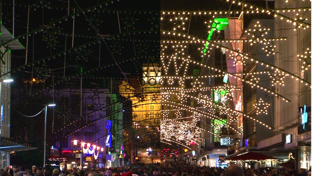 Das ist natürlich auch mit enormen Kosten verbunden – die nicht wie man glauben könnte von der Stadt, sondern von den Geschäftsinhabern getragen wird. Kein Pappenstiel, denn der jährliche Aufwand liegt bei rund 70.000 Euro. Die Einzelhändler zahlen freiwillig ihren Beitrag, dennoch kommt hier nicht die ganze Summe zusammen, rund 50% müssen aus anderen Quellen finanziert werden. Das Problem liegt klar auf der Hand, denn nicht alle Händler sind in der Lage die Beleuchtung mitzufinanzieren. Besonders der Online Handel sorgt für Umsatzrückgang und animiert die Kunden nicht mehr in den Geschäften sondern zuhause im Internet ihre Waren zu kaufen. Mit einer besonderen Aktion wollen nun die Einzelhändler auf die Umstände aufmerksam machen. Am Samstag Abend wurde die komplette Weihnachtsbeleuchtung für eine Stunde einfach einmal abgeschaltet, denn man will den Besuchern zeigen wie die Geschäftsstrasse der Zukunft aussehen könnte. Im nächsten Jahr kommt es für die Händler dann ganz besonders dicke, wie uns Alexander Wild Sprecher der Einzelhändler erklärt, denn die komplette Beleuchtung soll auf LED umgestellt werden. Rund 300.000 Euro wird das kosten, eine Summe die man erst mal stemmen muss. Wenn alle an einem Strang ziehen, ist es zu schaffen, ansonsten wird der Weihnachtsmarkt wohl künftig ohne die Beleuchtung auskommen müssen.