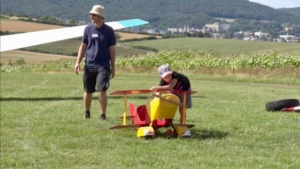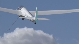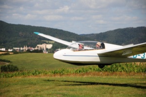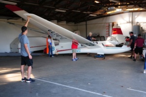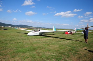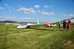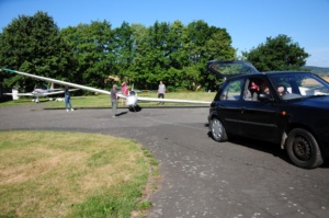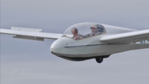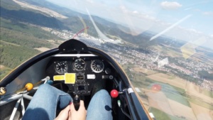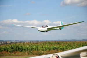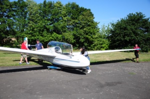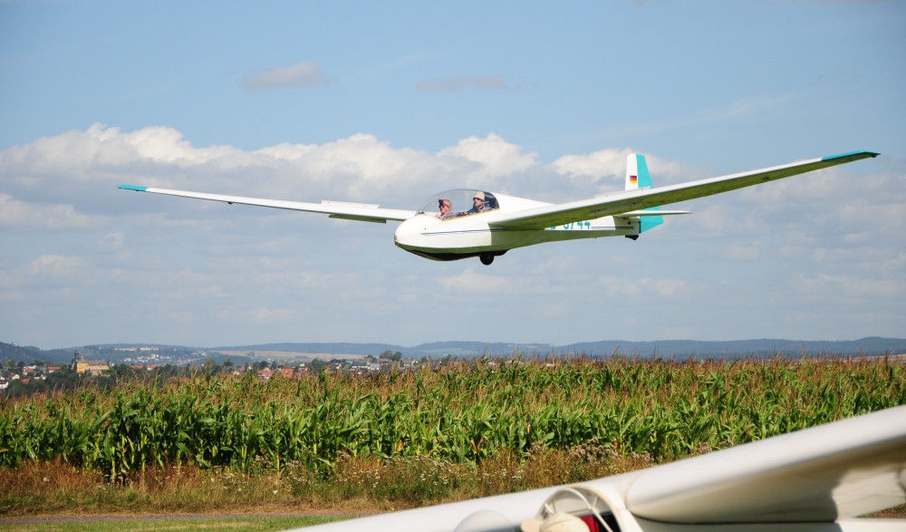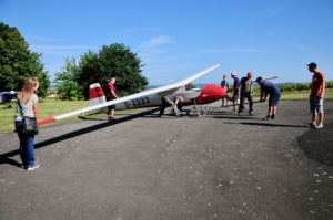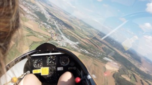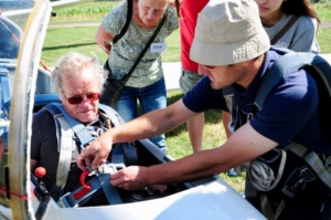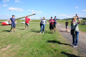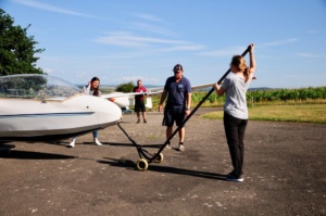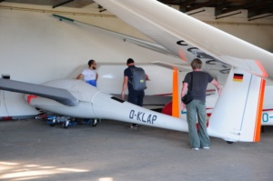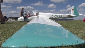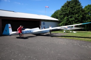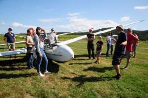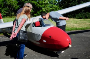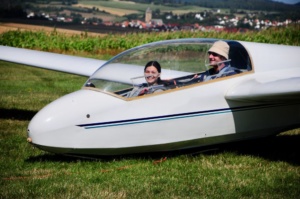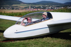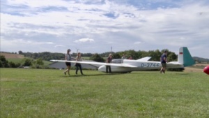 Denn bevor es tatsächlich in die Luft ging, mussten viele Flugzeuge mit vereinten Kräften vorsichtig aus dem großen Hangar ins Freie geschoben werden, um an das Schulungsflugzeug, eine ASK-13, zu gelangen. Nach einer ausgiebigen Kontrolle des Fluggerätes durch Fluglehrer Marcel Knauf, wurde der erste Teilnehmer mit einem Fallschirm ausgerüstet und durfte vorne im Flugzeug Platz nehmen und sich fest anschnallen. Und dann ging es auch schon los. Die Kanzel wurde verschlossen, ein Drahtseil eingehängt, der Flieger am Flügel in Waage gehalten. Zwei Handzeichen später gab der Flugleiter das Kommando „Seil straff“ und innerhalb von wenigen Sekunden beschleunigt eine LKW-Seilwinde am Platzende den Segelflieger auf rund 100 km/h. Kurz darauf steigt der Flieger in einem steilen Winkel dem Himmel entgegen. In etwa 300 bis 400 Metern Höhe wird ausgeklinkt und der Segelflieger gleitet nahezu lautlos durch die Luft. „Es ist schon eine enorme Beschleunigung“, kommentierte Jasmin Wacker aus Bad Zwesten mit einem Lächeln ihren allerersten Start mit einem Segelflugzeug. Nach dem Start blieb es in der Luft richtig aufregend, denn jetzt hatten alle die Möglichkeit unter Anleitung des Fluglehrers das Ruder selbst einmal in die Hand zu nehmen, um einen ersten Eindruck darüber zu bekommen, wie sich ein Flugzeug überhaupt steuern lässt. Einige Minuten und viele Steuerversuche später landete Marcel Knauf die ASK-13 auf der 1000 Meter langen Grasbahn. Von dem Moment an, als sich die Kanzel wieder öffnete, hatten alle Teilnehmer eines gemeinsam: Ein vor Freude ins Gesicht gemeißeltes Grinsen.
