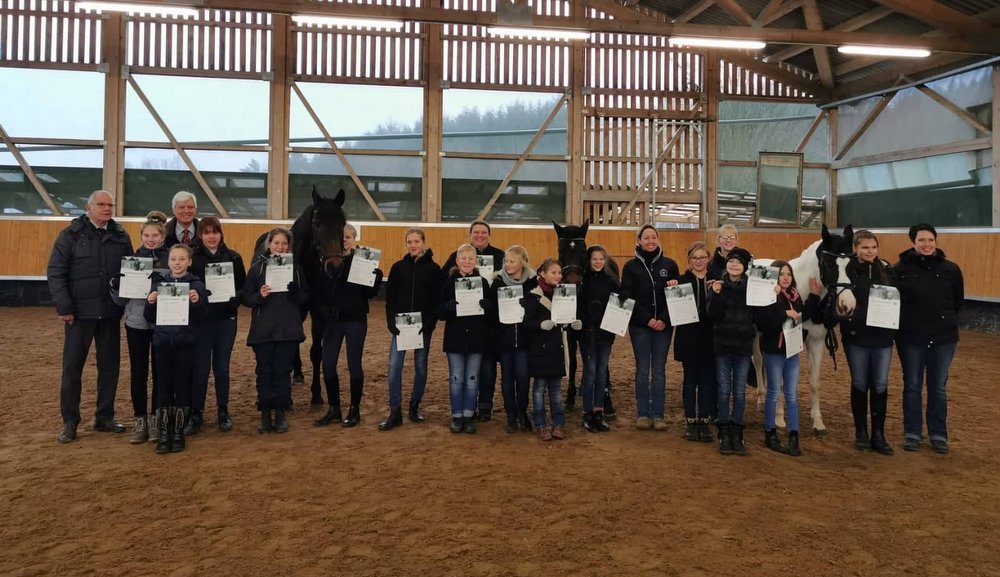 Deutschlands erste Prüflinge für den neuen Pferdeführerschein „Umgang“ kommen (fast alle) aus dem Landkreis Waldeck Frankenberg. Anfang Januar war nun die erste Prüfung, mit Erfolg. Seit Mitte Dezember büffelten 16 Teilnehmer auf dem Reiterhof am Lehmberg in Hatzfeld-Reddinghausen, um den neuen Regularien der Deutschen Reiterlichen Vereinigung (FN – Federation National) gerecht zu werden. Am 5. Januar wurde nun die erste Prüfung im Bundesgebiet von zwei erfahrenen Richtern abgenommen.