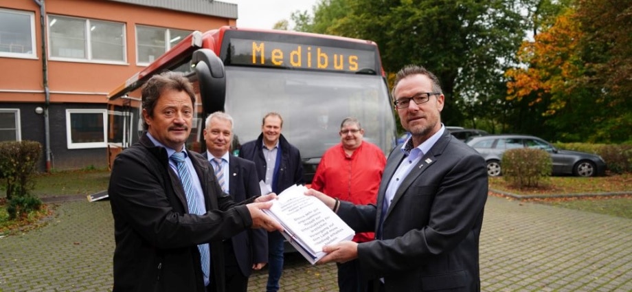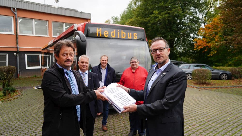 Sontra – Der Medibus soll in der Region Hersfeld-Rotenburg und Werra-Meißner Kreis bleiben. 3166 Bürger haben mit ihrer Unterschrift für den Erhalt zugestimmt. Am Mittwoch übergaben der Bürgermeister Thomas Mäurer (Weißenborn), Lars Böckmann (Herleshausen), Ralf Hilmes (Nentershausen) Alfred Koch (Cornberg) und Thomas Eckhardt (Sontra) die Unterschriften der Kassenärztlichen Vereinigung (KV). Bislang bleibt offen, ob das Projekt, welches vor zweieinhalb Jahren gestartet wurde auch 2021 weitergeführt wird.