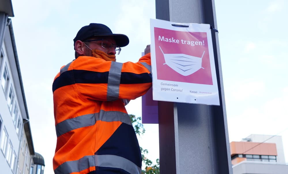 Kassel – Seit Donnerstagmorgen hängen Mitarbeiter der Stadt Kassel hunderte Schilder im Stadtgebiet auf. Die Schilder sollen auf die Maskenpflicht an öffentlichen Bereichen hinweisen. Die Schilder wurden am Bebelplatz, Rudolphsplatz, Königsplatz sowie auf der Friedrich-Ebert-Straße, Schillerstraße und Hoffmann-von-Fallersleben-Straße auf gehangen.