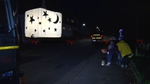 Die Familien wurden einzeln angefahren, um zu verhindern dass mehrere Familien zusammenkommen. Ein Abschleppunternehmen hatte sich bereit erklärt den Umzug zu begleiten und transportierte einen geschmückten und beleuchteten IBC Kontainer durch die Strassen.
